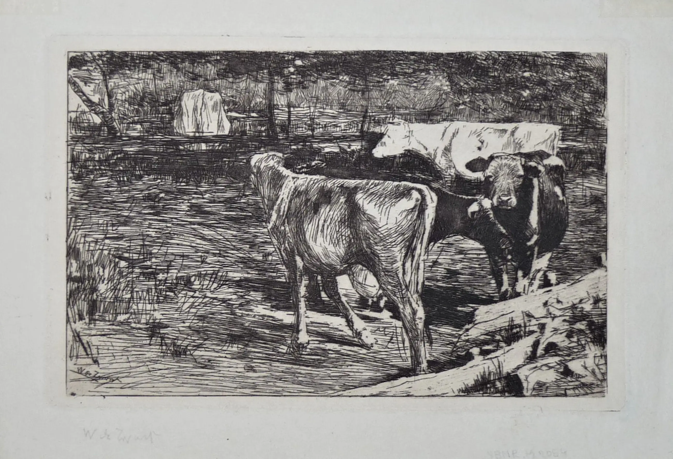 *Fraaie ets van Willem de Zwart. Het betreft hier de 1e staat van de ets die anders is dan de 2e staat. Lees Bionda hierover of zie de verschillen, (o.a. in achterste koe) met de andere ets hiervan eveneens door mij aangeboden) *Beschreven in (referentie)boek van Richard Bionda over Willem de Zwart onder nr. 22 / blz. 96 + 97. *Papiermaat 162 x 235 mm. Beeldmaat 120 x 189 mm. *L.o. gesigneerd in de plaat met W. de Zwart *Verzending is aangetekend, verzekerd en goed verpakt.