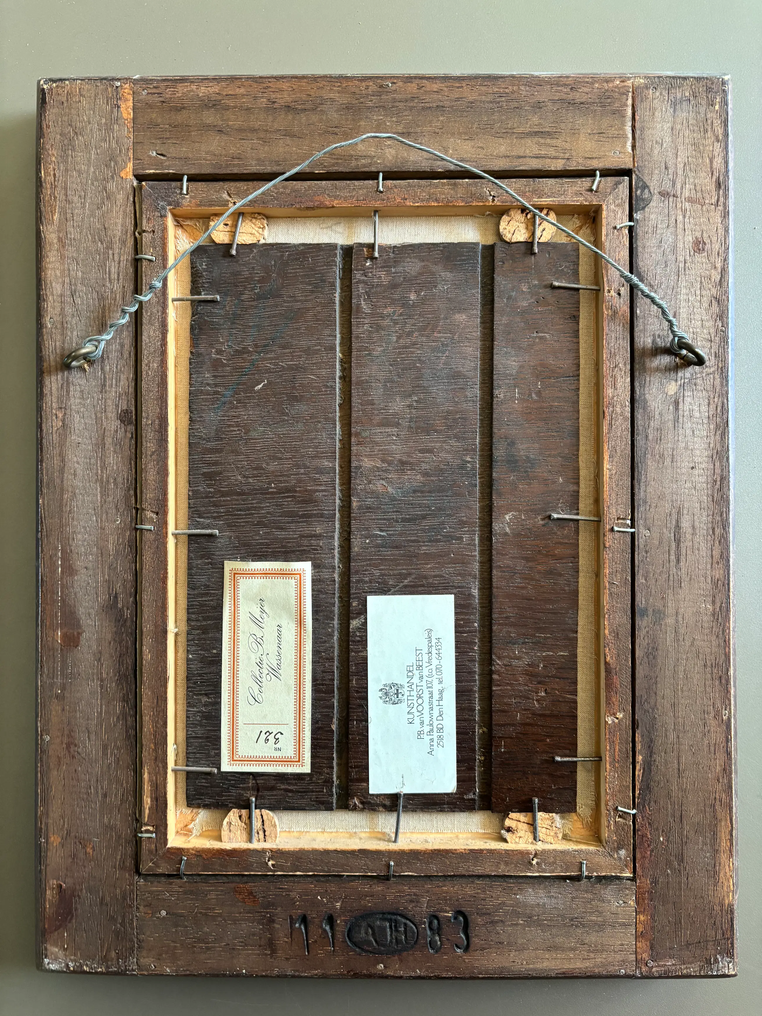 Olieverf op doek op houten paneel. Verkocht door Kunsthandel Van Voort Van Beest aan de heer B. Meijer (zie foto's van de achterzijde)