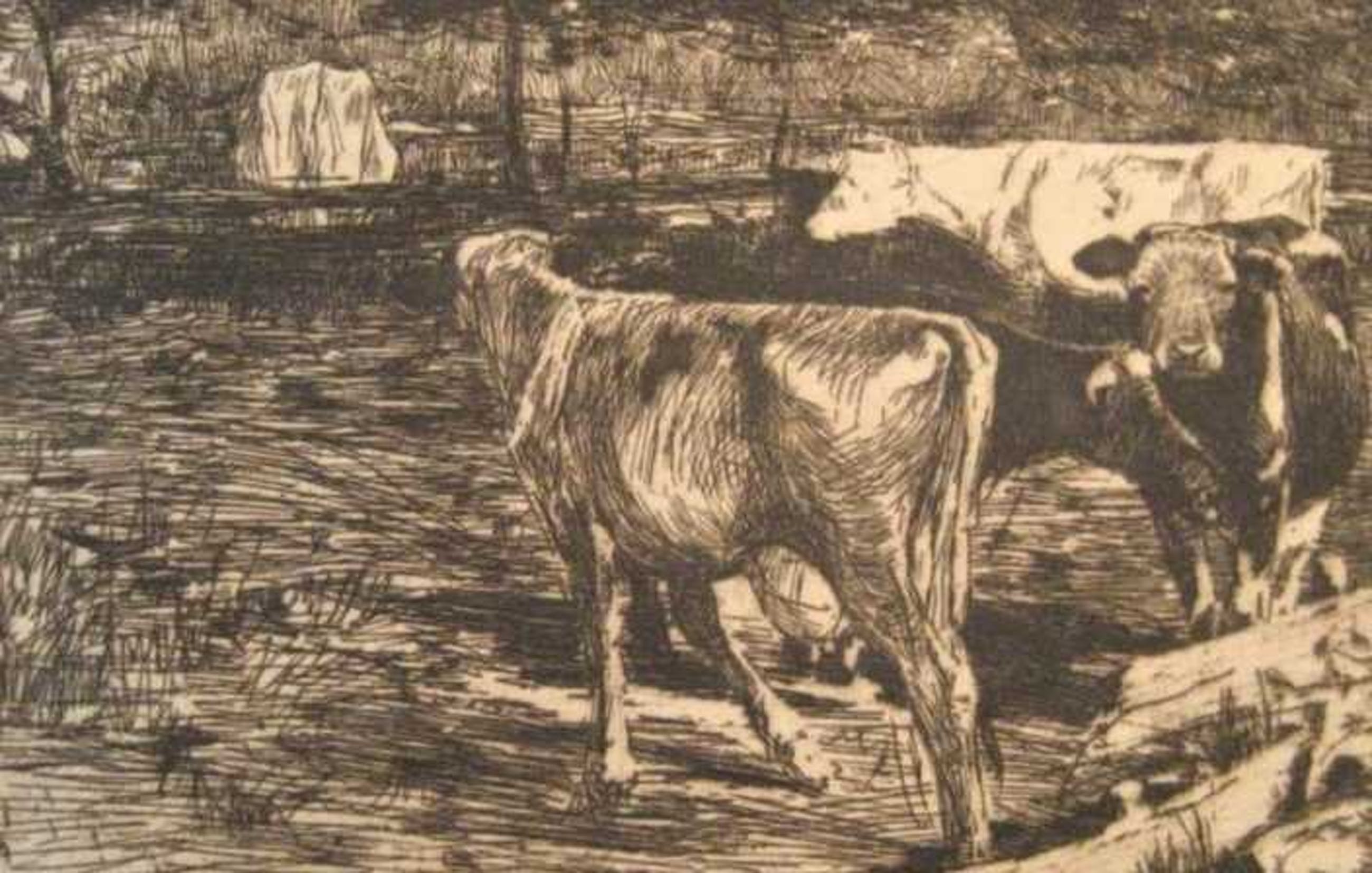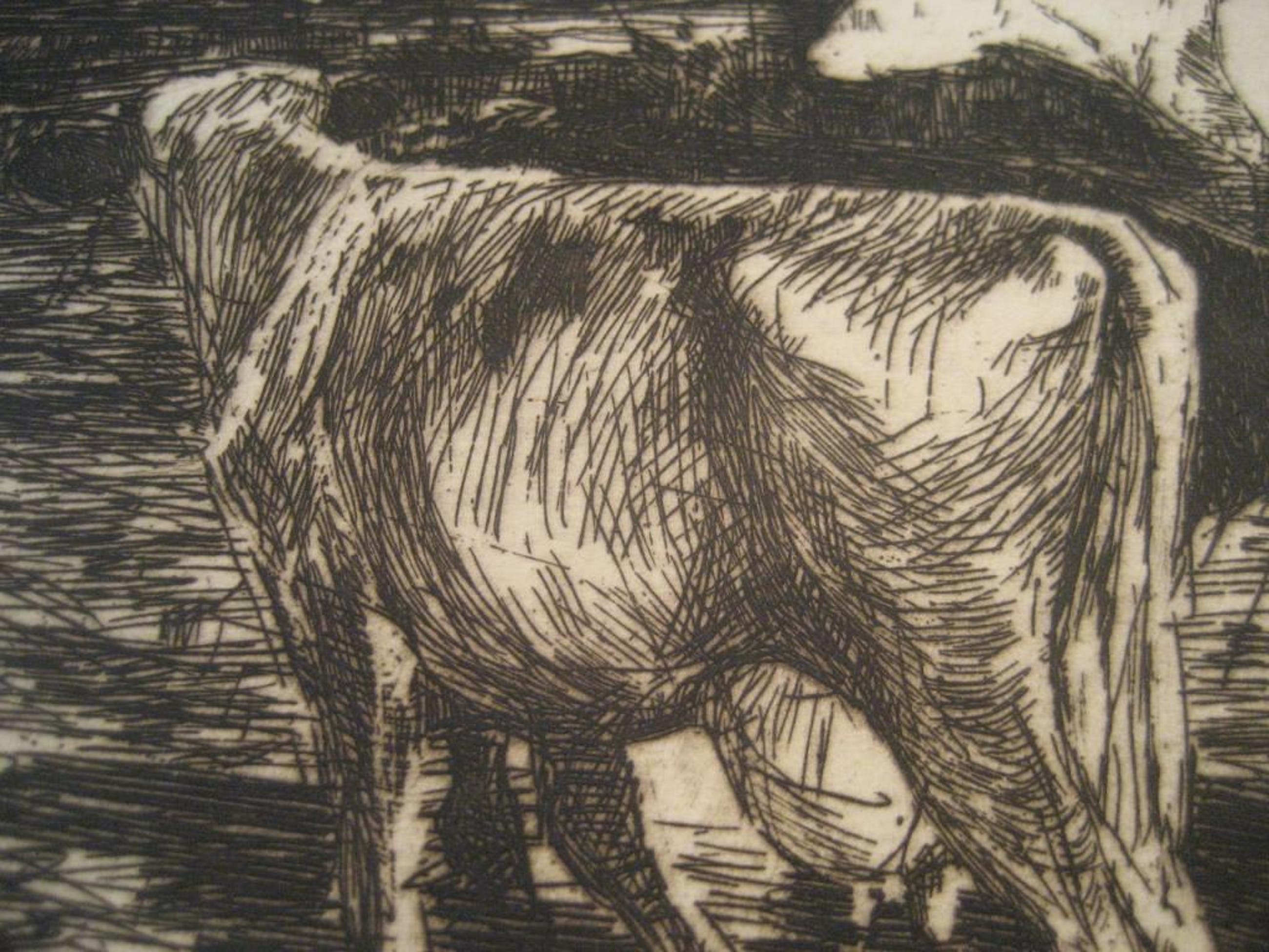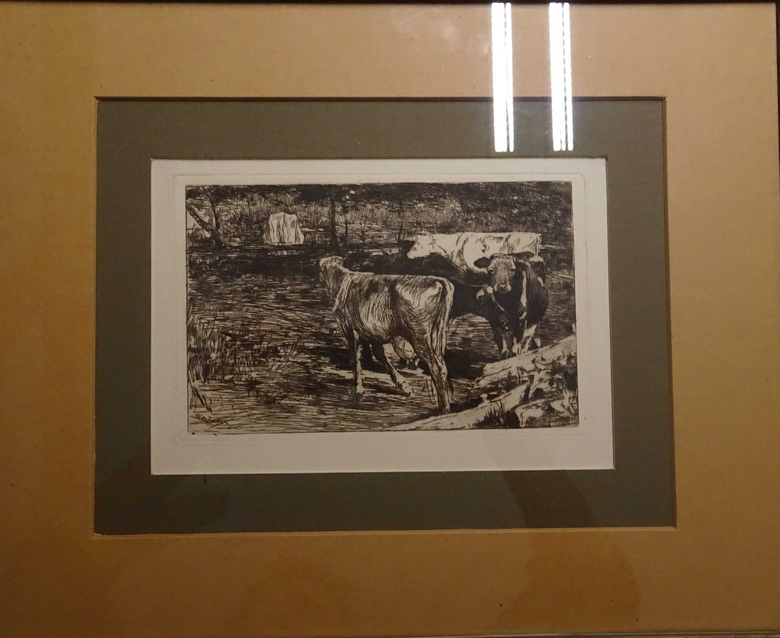 Willem de Zwart. Ets. Vier koeien in landschap. Gesigneerd in de plaat. In eenvoudige lijst onder dubbele passe-partout Afmeting ets 13 x 20 cm. De witte streepjes op foto 2 en 3 zijn spiegelingen .