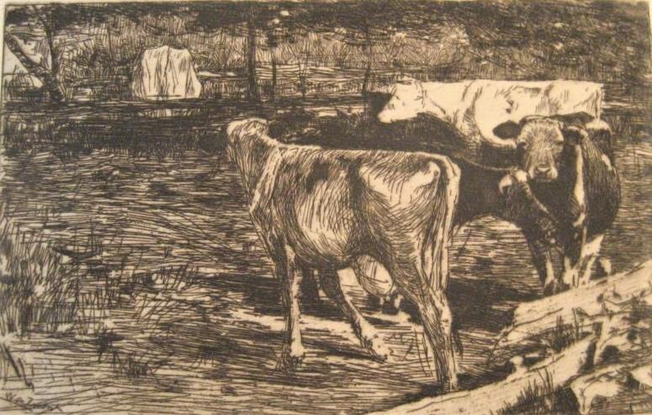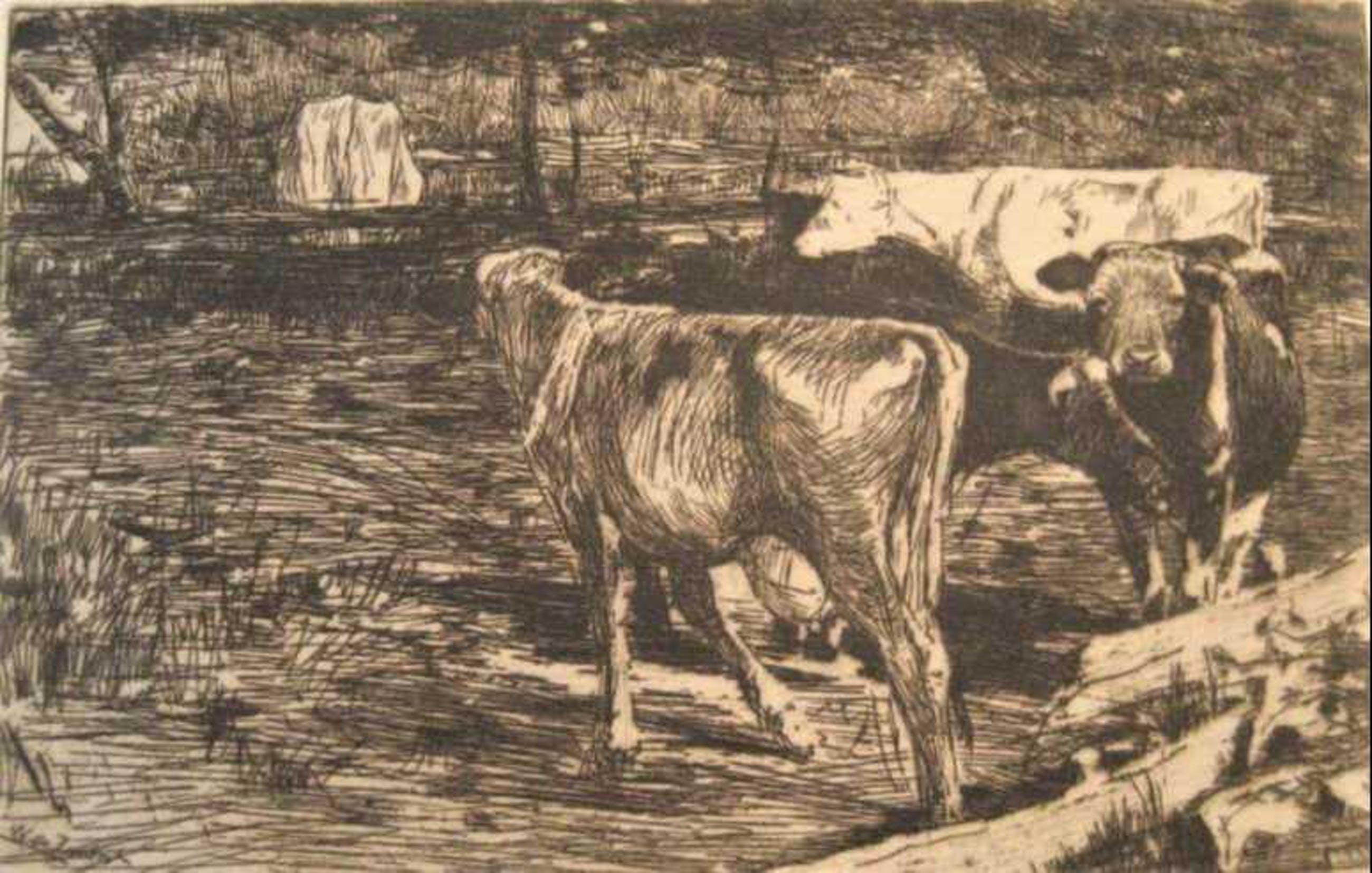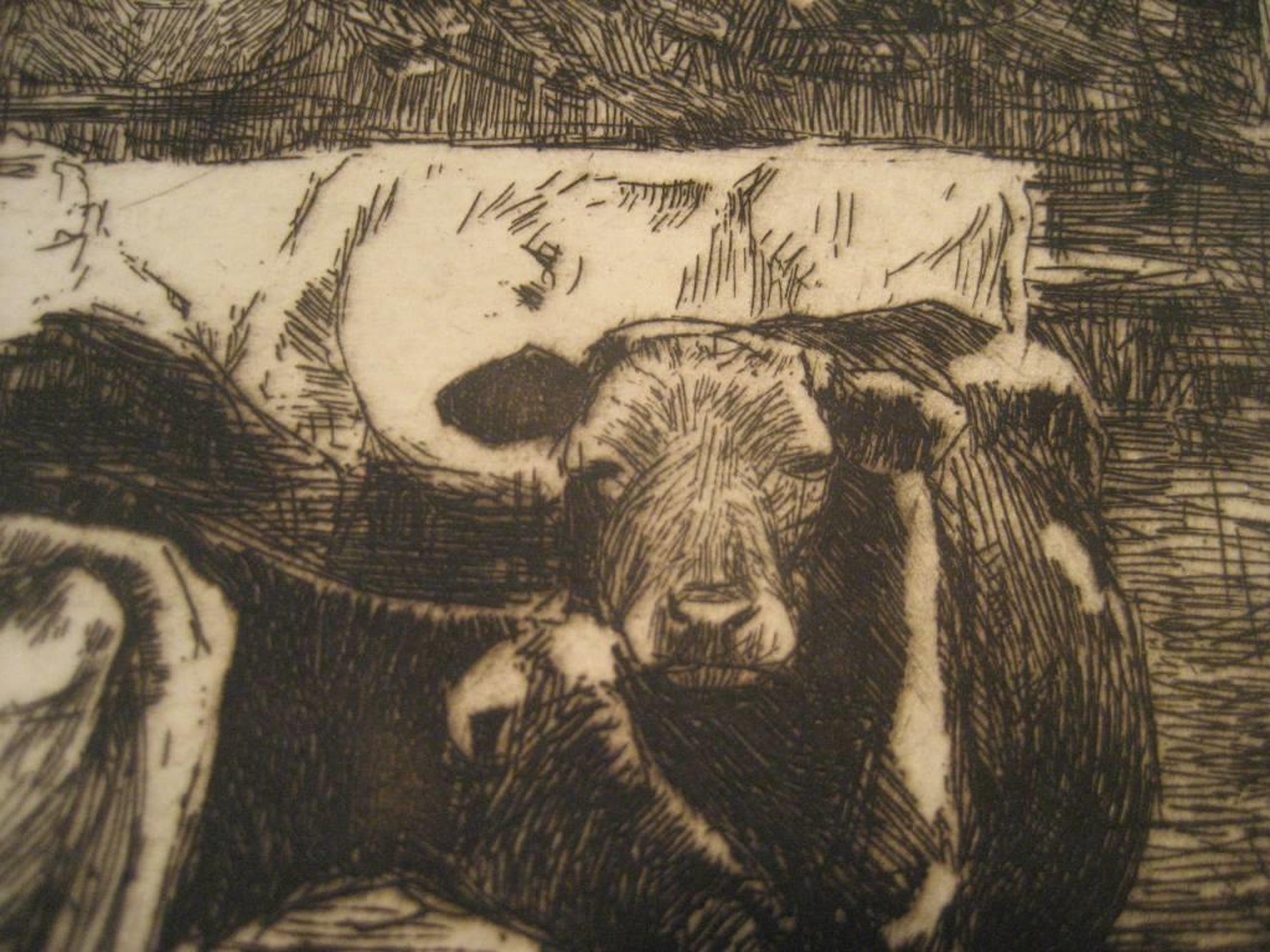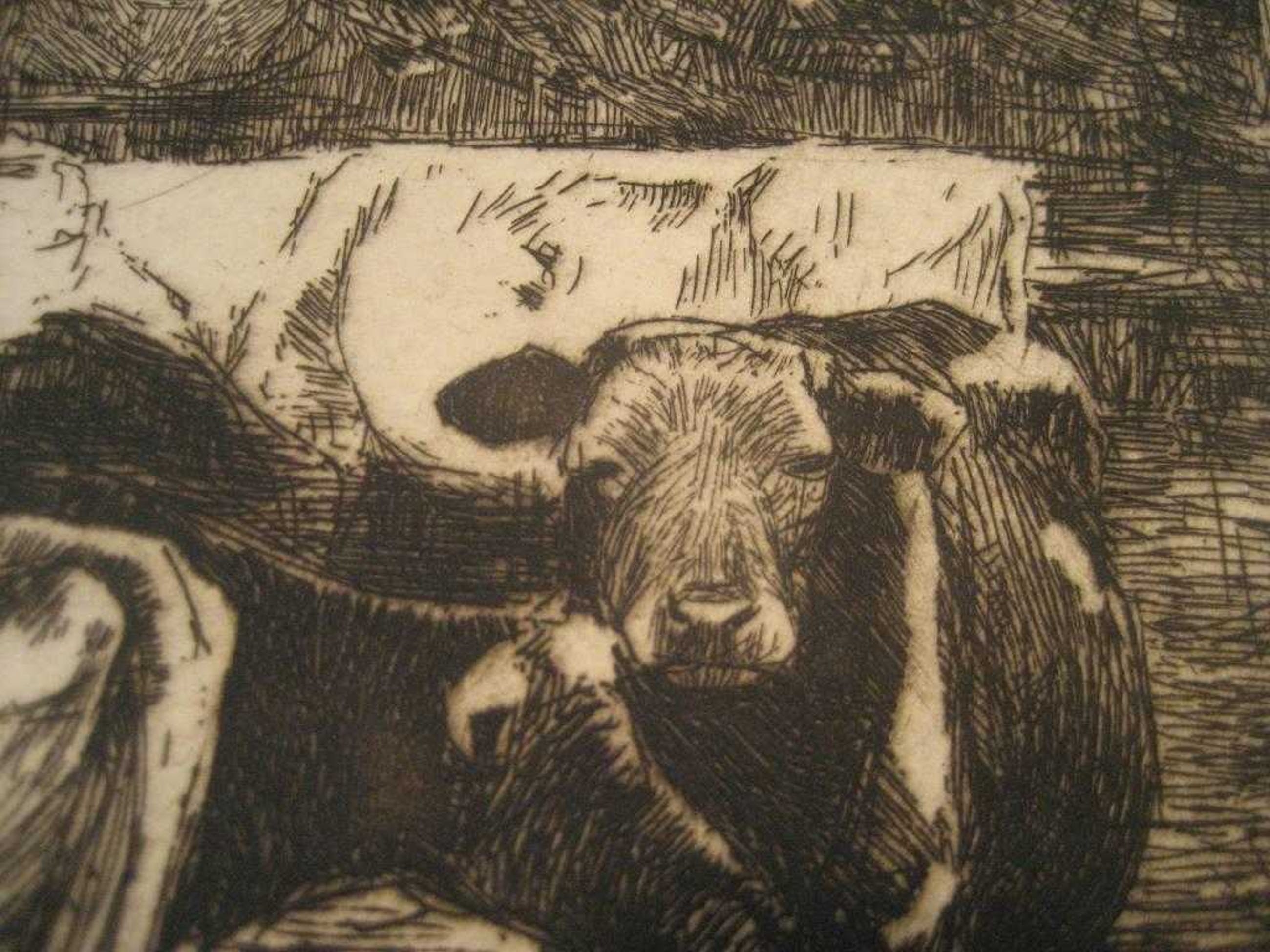 Willem de Zwart. Ets. Vier koeien in landschap. Gesigneerd in de plaat. In eenvoudige lijst onder dubbele passe-partout Afmeting ets 13 x 20 cm. De witte streepjes op foto 2 en 3 zijn spiegelingen .