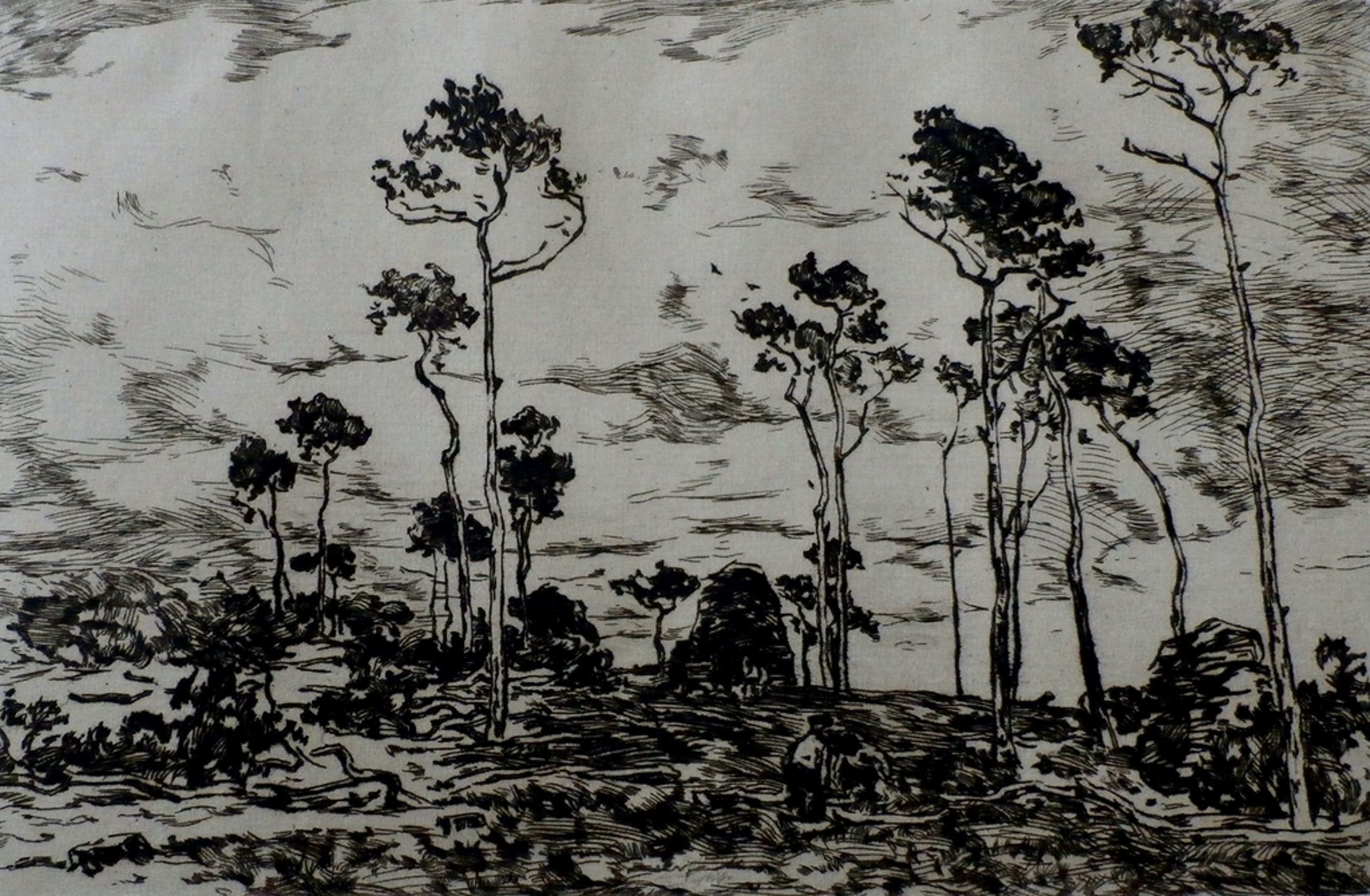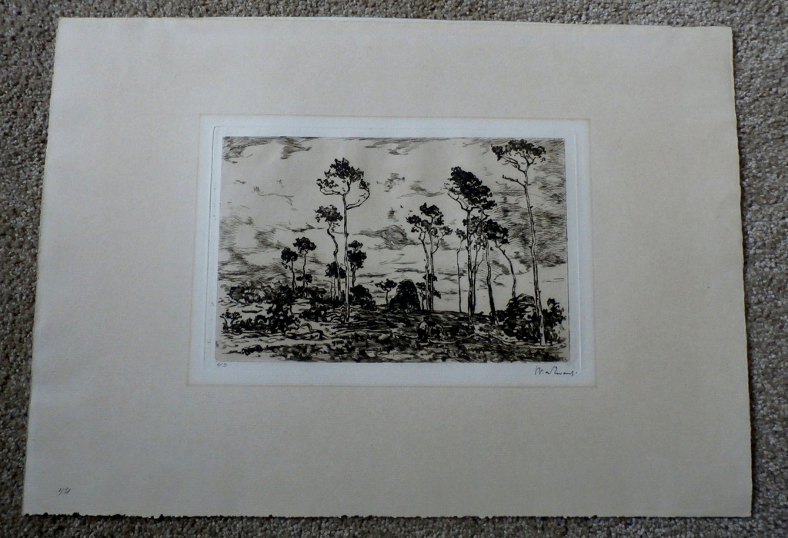 Ets van Willem de Zwart. Titel: Houthakkers in het bos. Het werk is rechtsonder gesigneerd. Links staat geschreven: 43. Afmetingen blad: H32,5 x b45 cm. Afmetingen voorstelling: H15 x b22,5 cm. Conditie: in goede staat. Er zit een plakrest van een vorige inlijsting op de achterzijde.