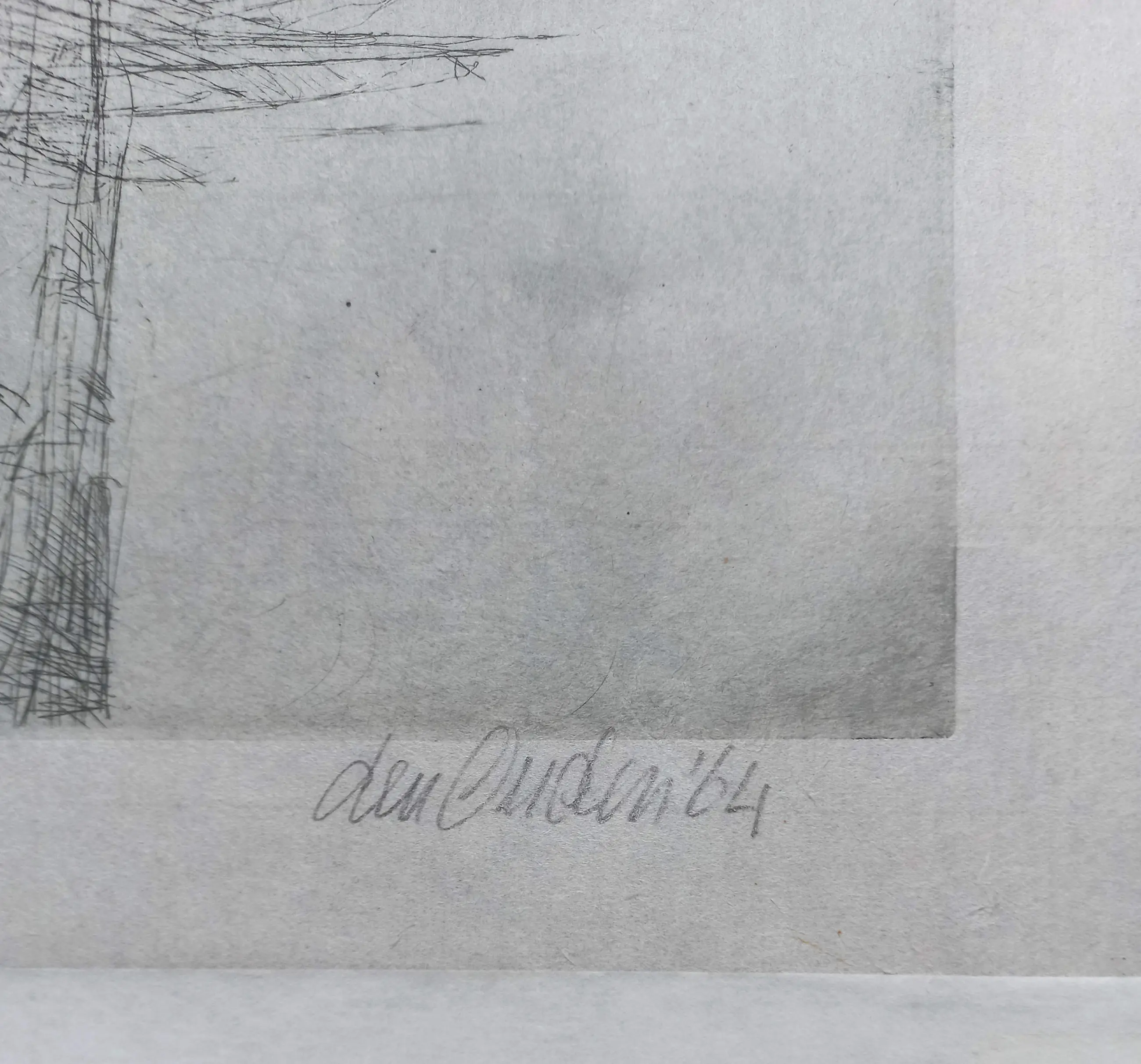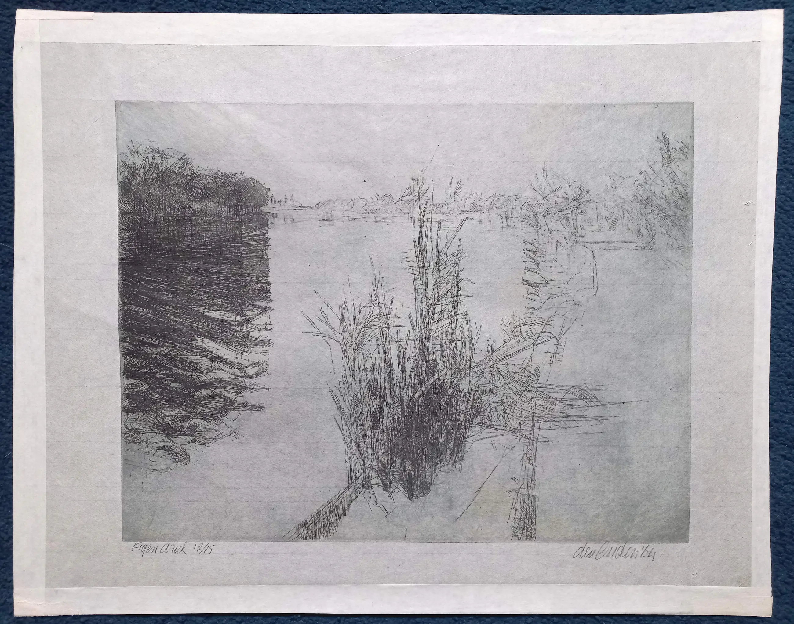 Zeer mooi, karakteristiek rivierenlandschap van Willem den Ouden. Ets op japans papier, met potlood gesigneerd, gedateerd (’64) en genummerd (12/15). In zeer goede conditie.