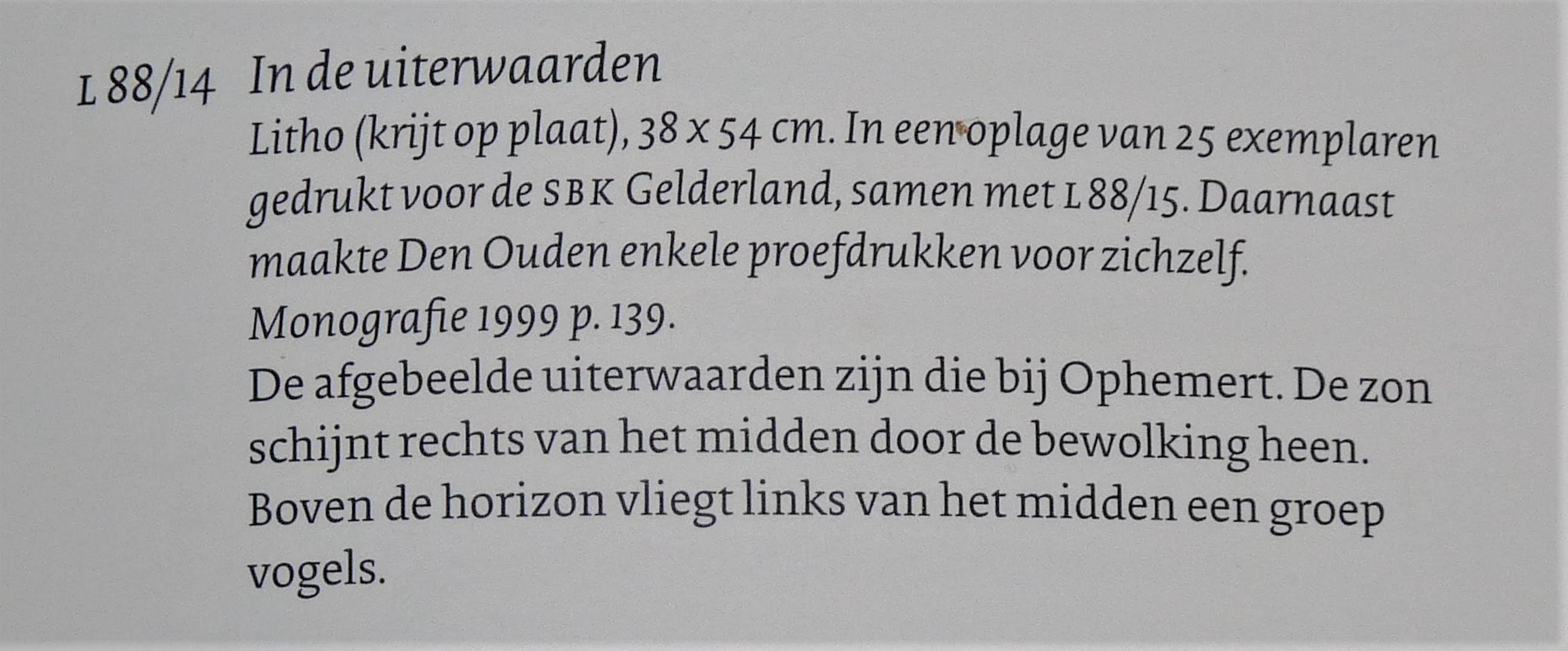 * Fraaie inmiddels schaars aangeboden litho van de bekende graficus en schilder Willem den Ouden. *Beeldmaat is 38 x 54 cm. Papiermaat is 50 x 65 cm *Gesigneerd en gedateerd in oplage van 25 ex. * Afgebeeld in boek Leven en werk van Willem den Ouden op blz.169 - L88/14 - In de uiterwaarden. *Verzending is aangetekend, verzekerd en goed verpakt.