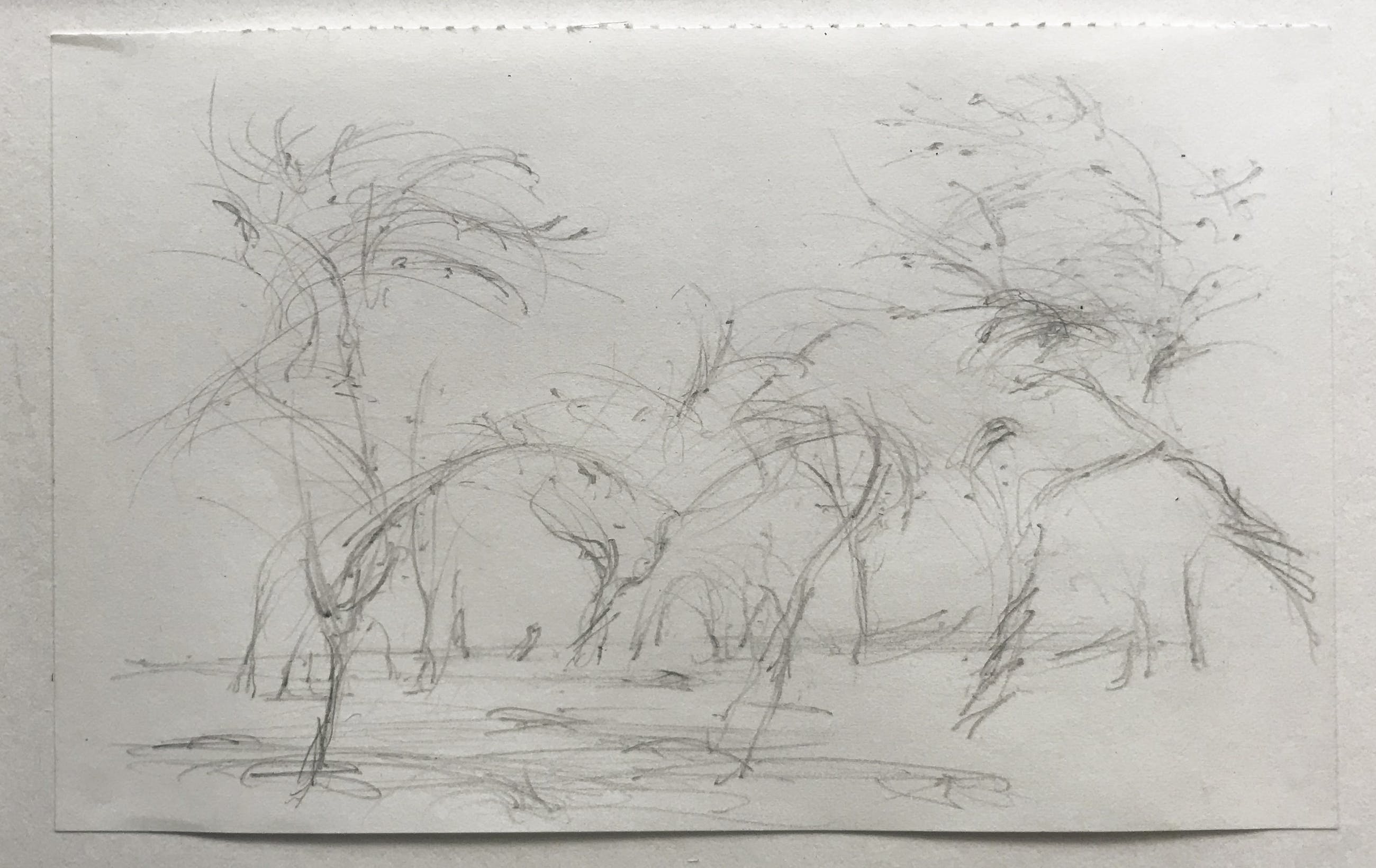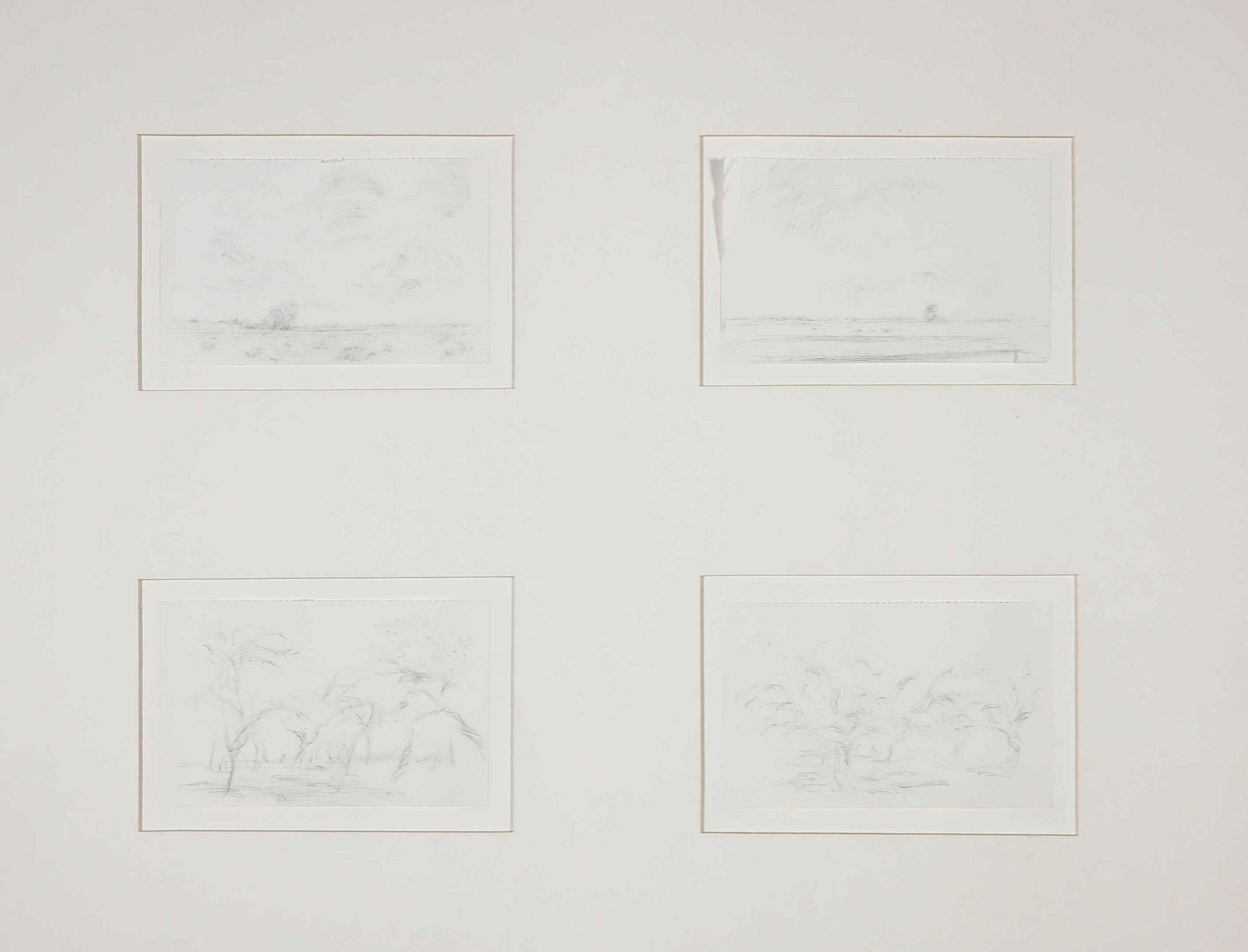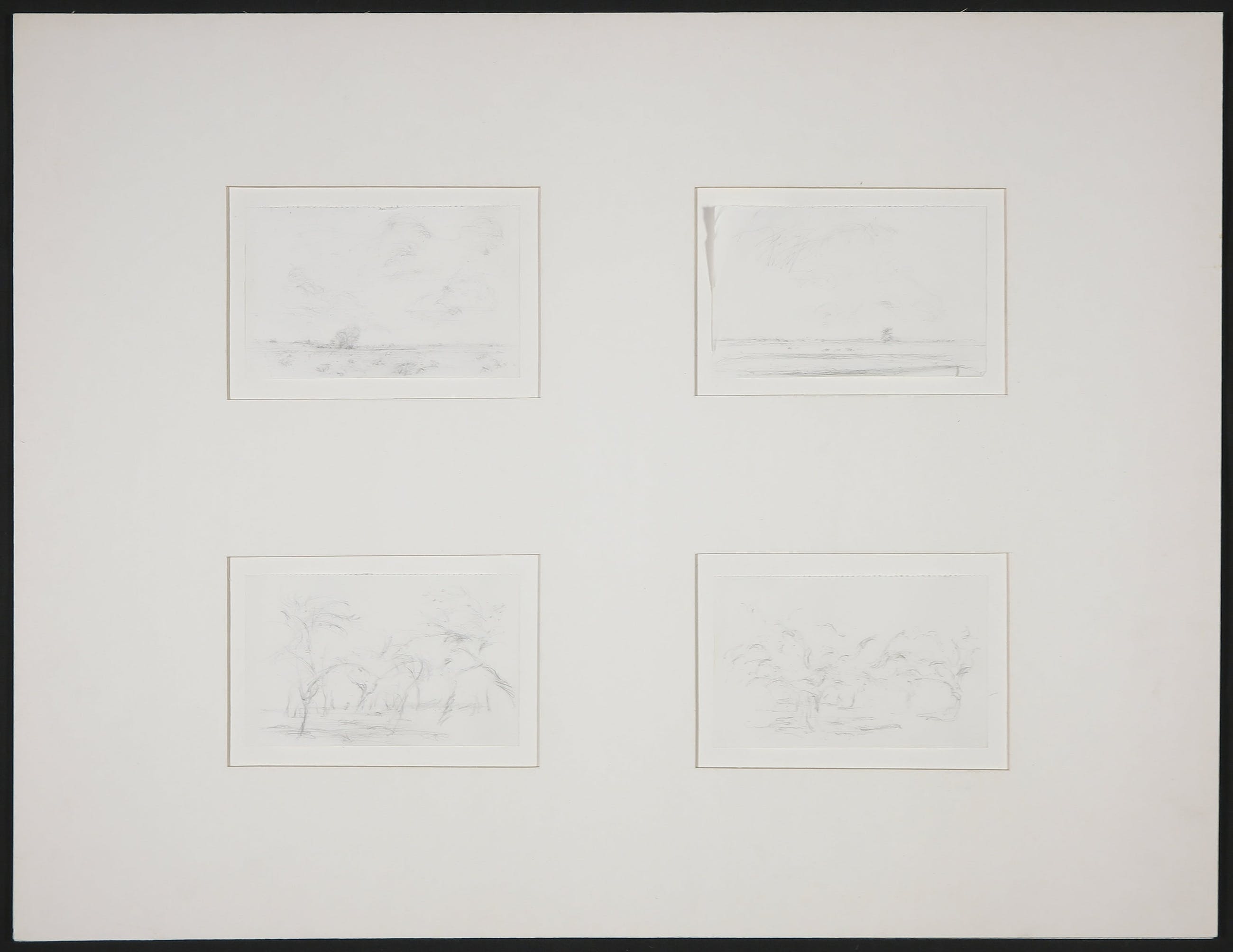 | De tekeningen zitten geplakt op het onderblad. De tekening rechtsboven heeft een gevouwen hoekje en een klein scheurtje. Het passe-partout is losgeraakt van het onderblad. | |||||||||||
