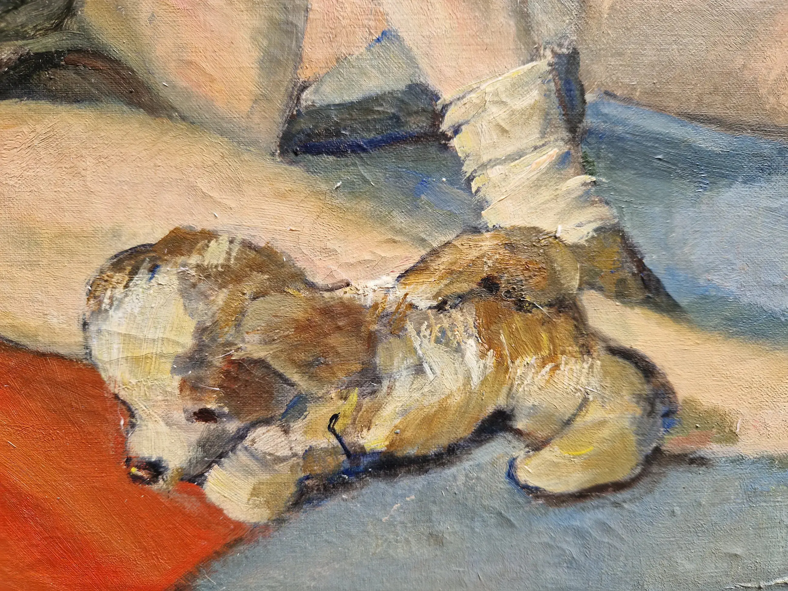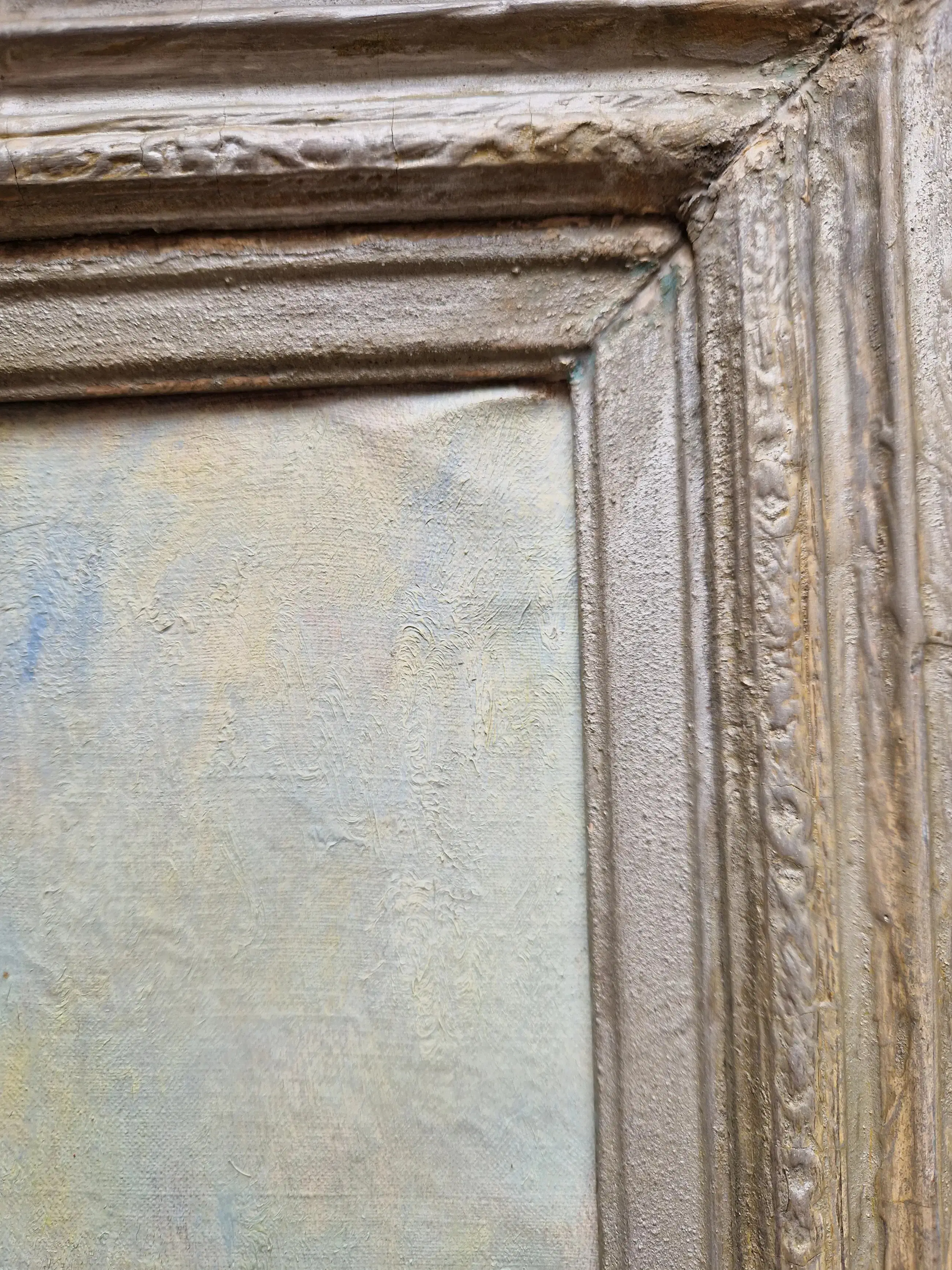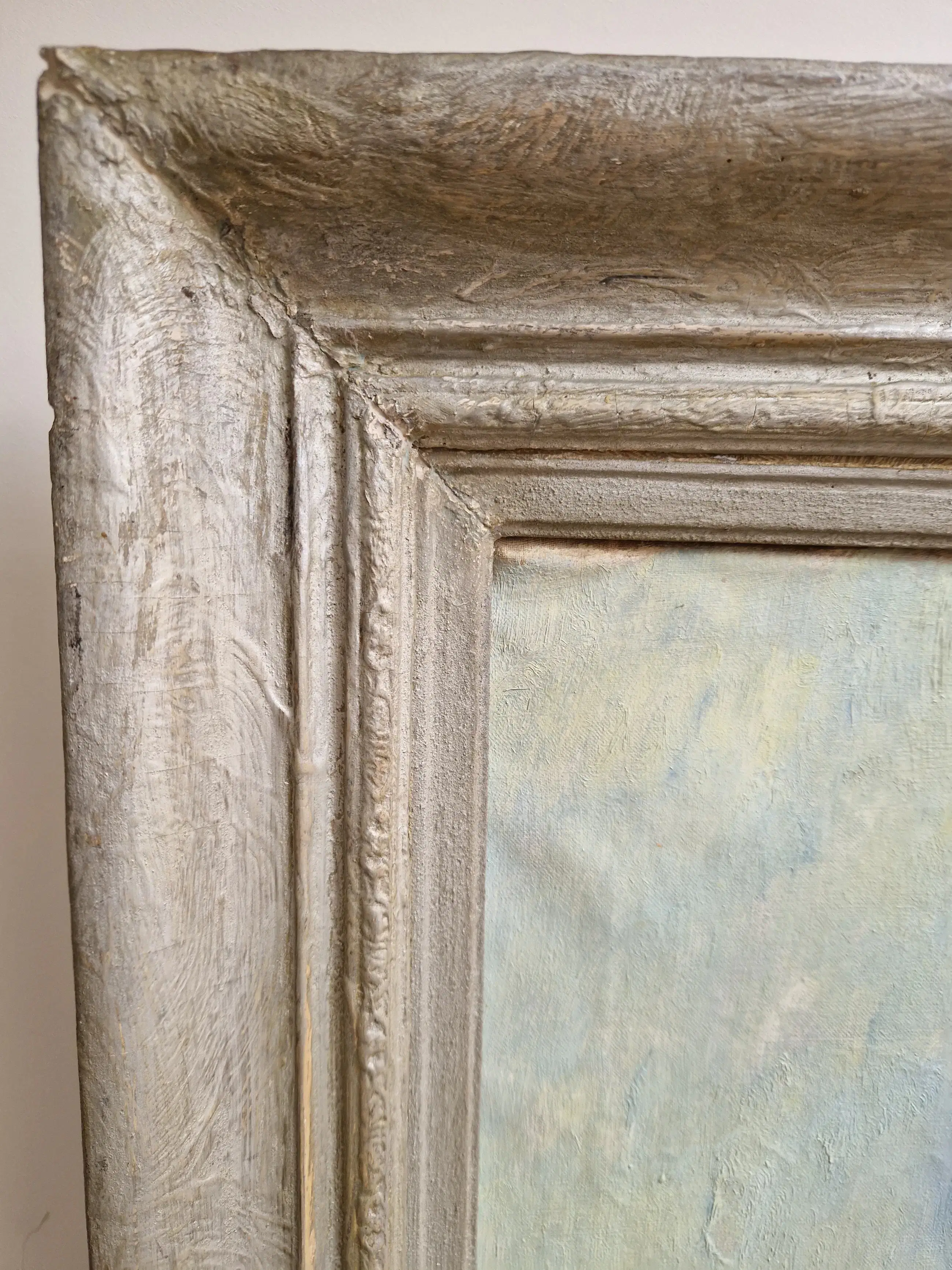 Het werk zelf verkeert in goede staat, met op één klein plekje heel licht verfverlies. De originele lijst heeft wel wat geleden onder de jaren en is aan de achterzijde verstevigd, zodat deze weer veilig kan worden opgehangen. Het is aan de nieuwe eigenaar of er een nieuwe lijst moet komen. Persoonlijk zou ik het gewoon zo houden, het past in de stijl en is de originele lijst.