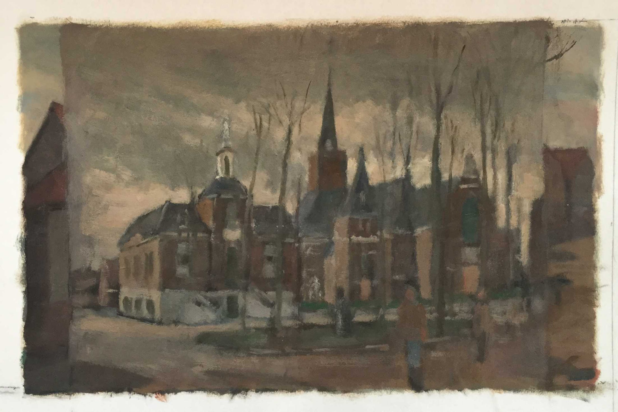 | Over een andere schildering heen geschilderd, links en rechts zie je de vorige schildering uitsteken. Papier verkleurd door de tijd met vlekjes | |