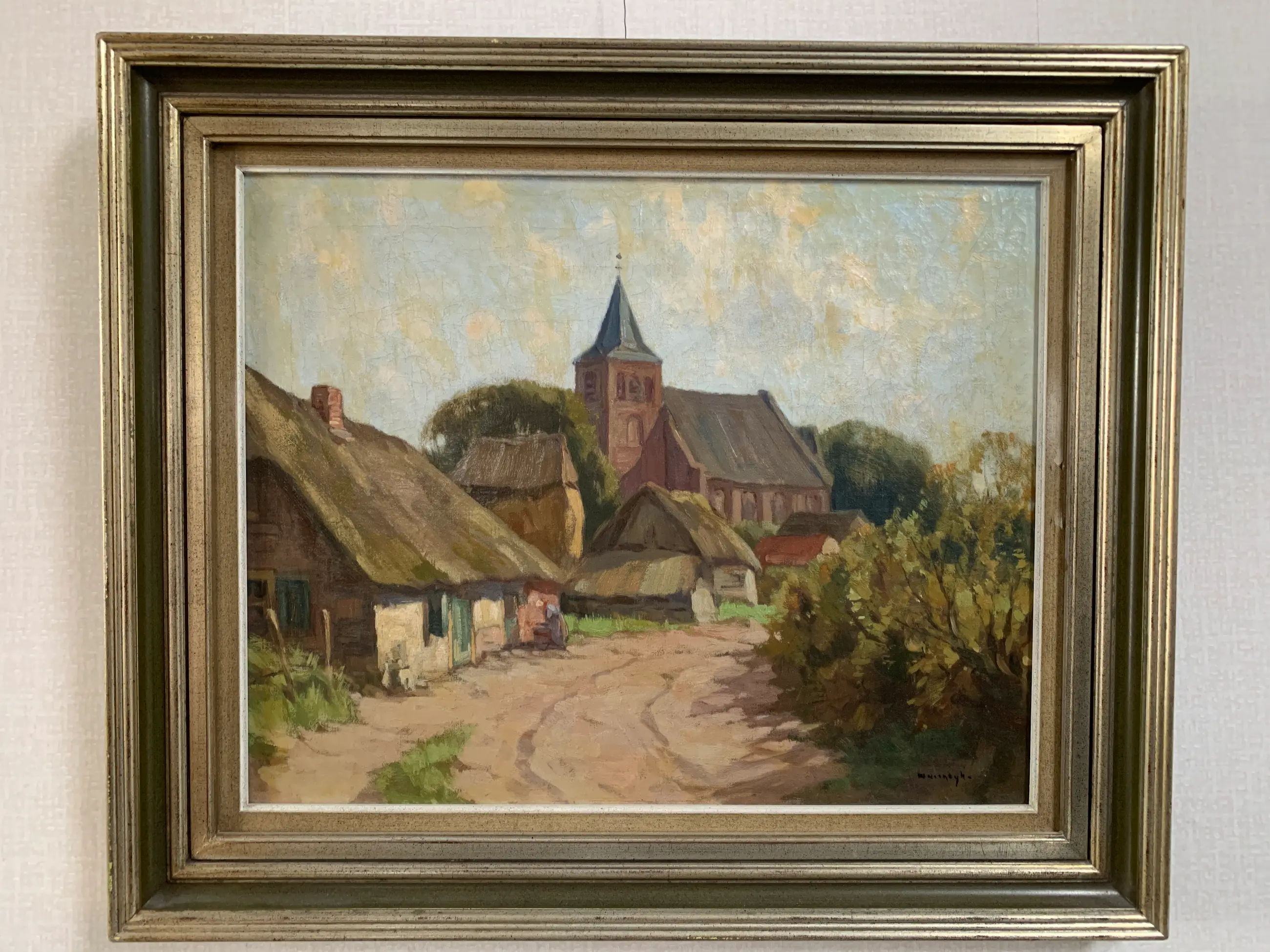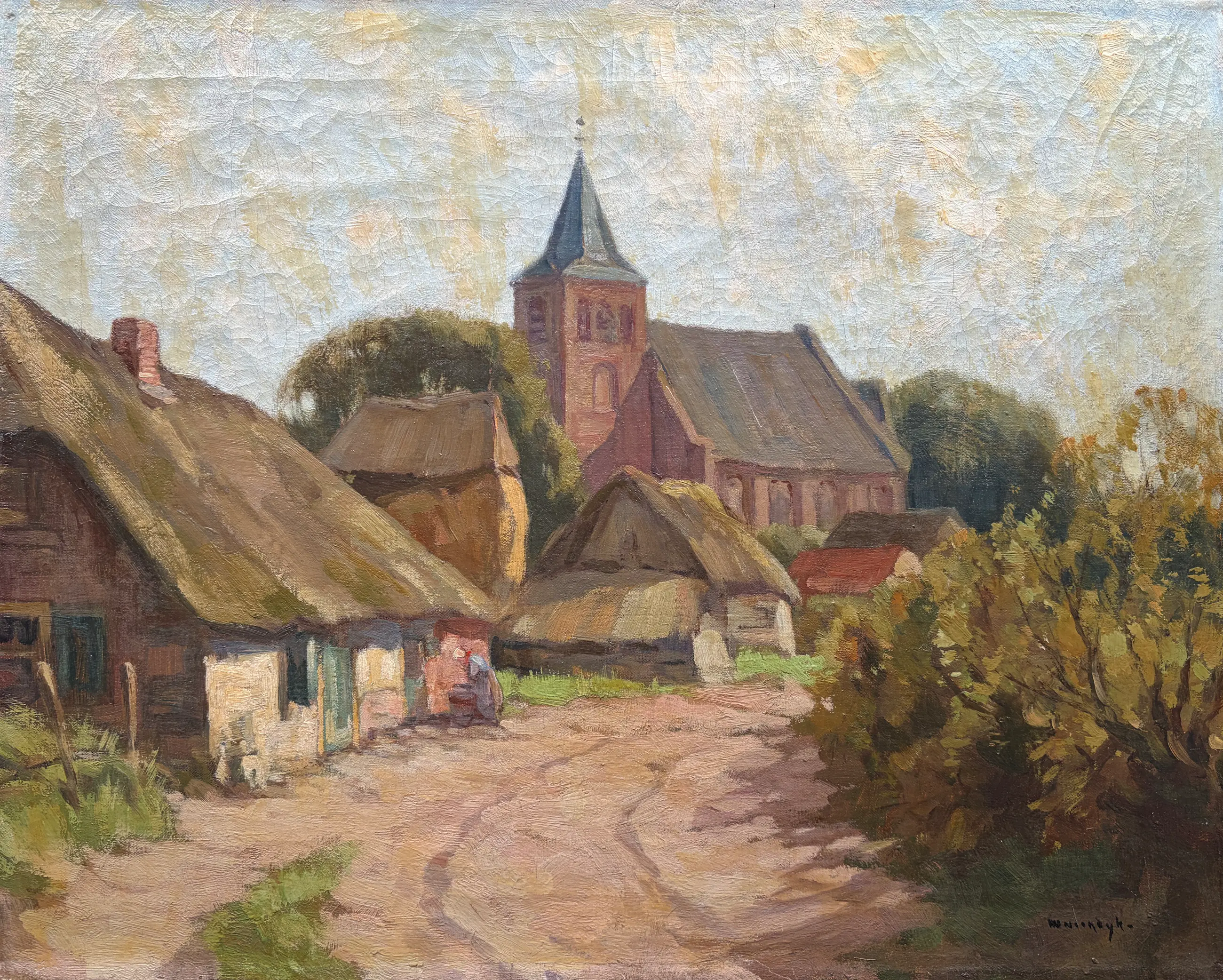 Gesigneerd rechtsonder 'Willem Noordijk' (zie detailfoto). Typisch Goois impressionistisch landschap met rode kerk, rieten boerderijen en zandweg – mogelijk Laren/Eemnes. Vergelijkbaar met zijn 'Sneeuwpret voor de Hervormde Kerk, Laren'.