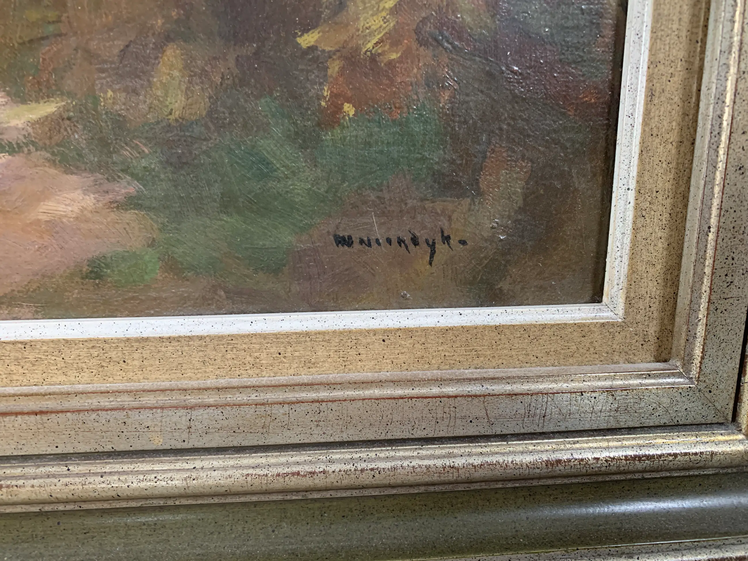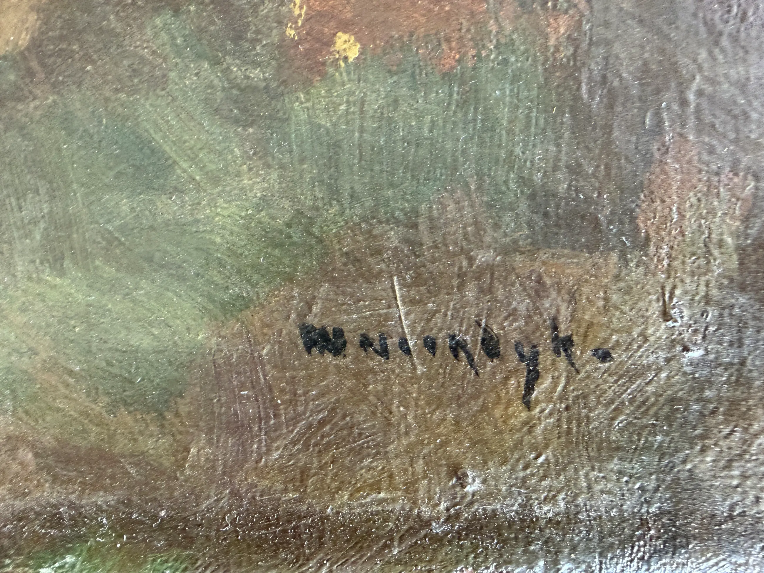 Schilderij in goede, geconserveerde staat met lichte craquelé en vergeelde vernis (typisch voor impressionistische olieverf). Originele lijst met zichtbare gebruikssporen zoals barsten en slijtage, zoals getoond op de detailfoto's. Geen schade aan doek of verflaag.