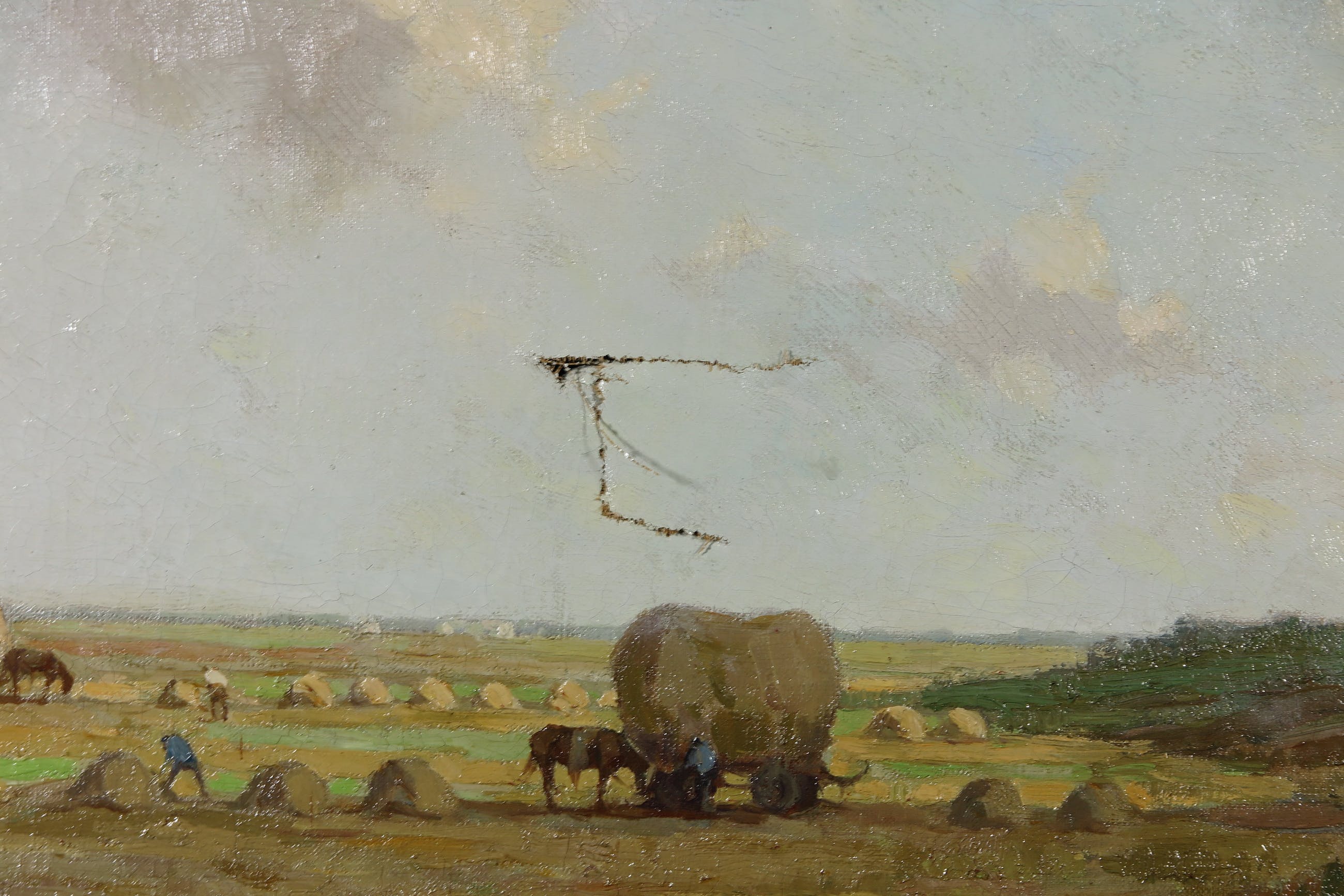 | Het werk heeft een flinke beschadiging (scheur in het doek) in het midden van de voorstelling. Ook de lijst is beschadigd, zie foto's. | |