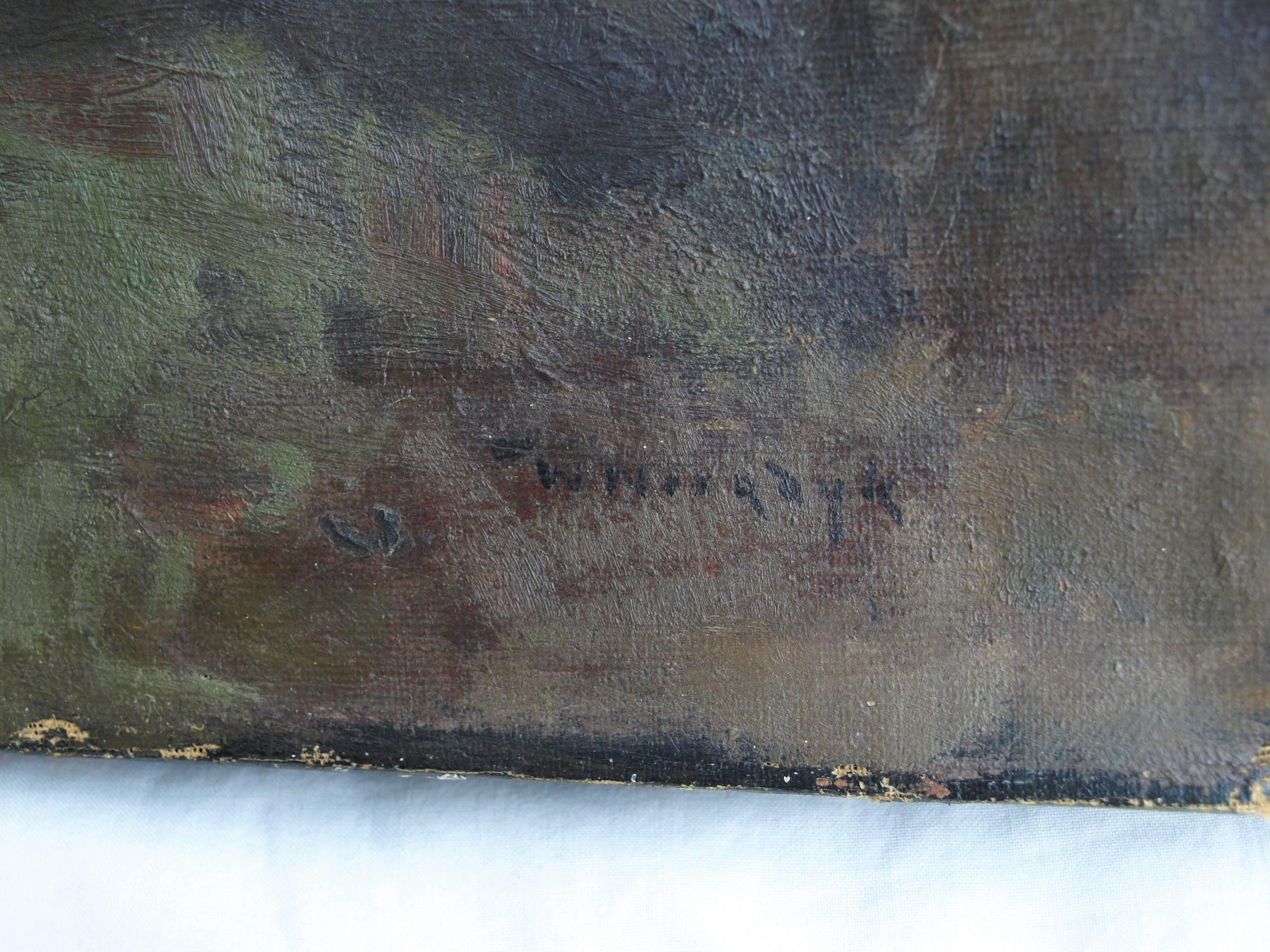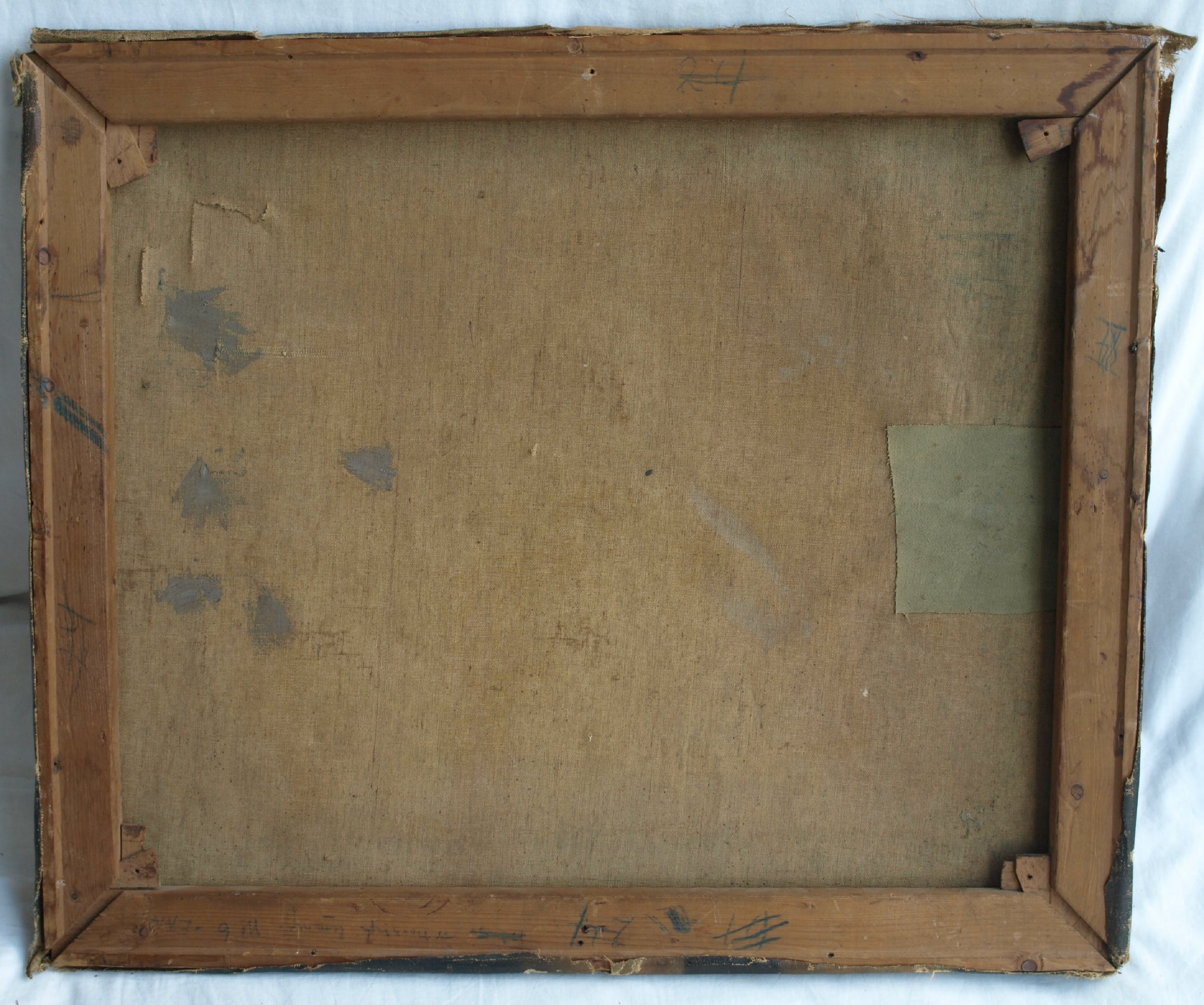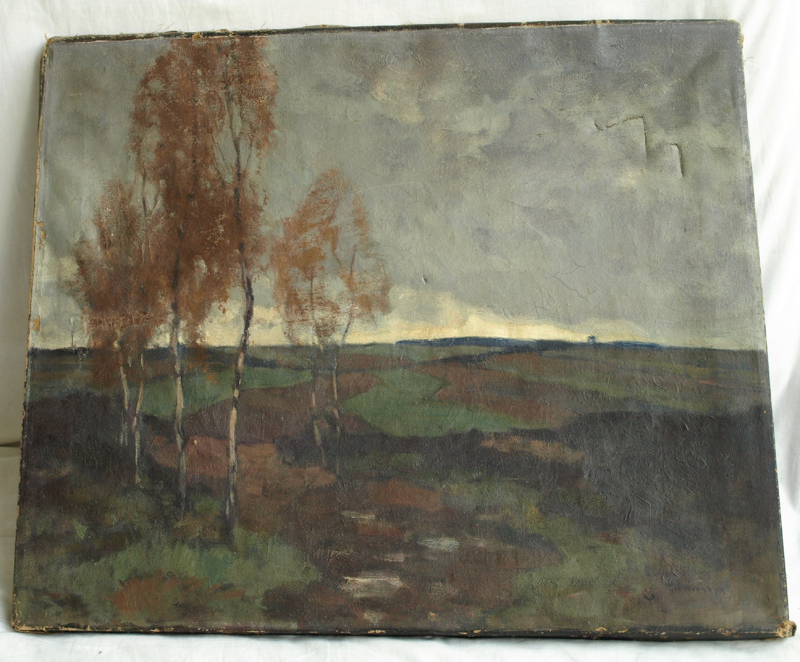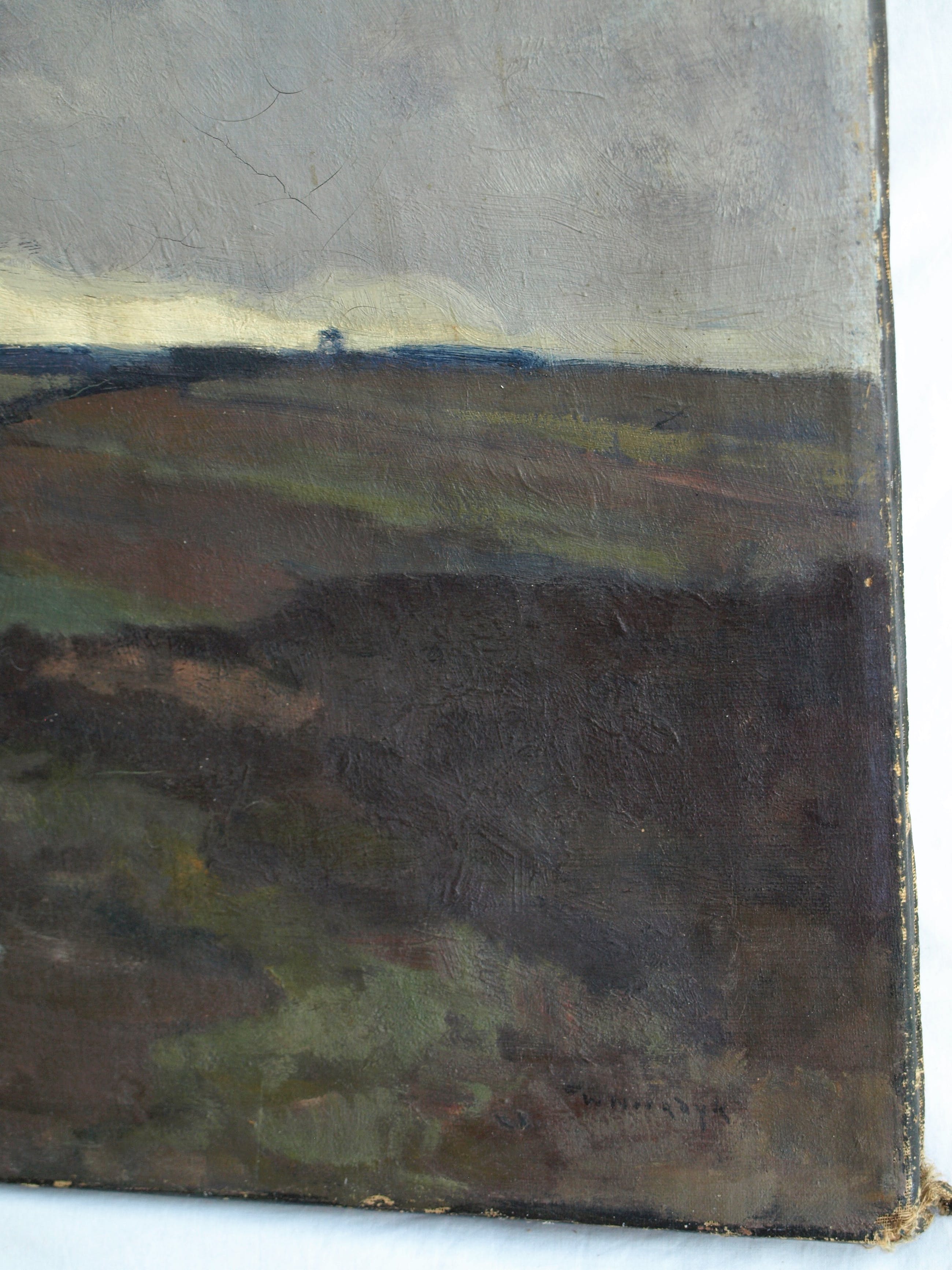 -Conditie: Het werk heeft slijtage aan de randen en de vernislaag is afgesleten. Aan de linkerkant is een restauratieplek (stukje doek op de achterkant van het doek bevestigd). Het doek heeft ‘deukjes’ en heeft rechtsboven 2 ‘winkelhaken’.