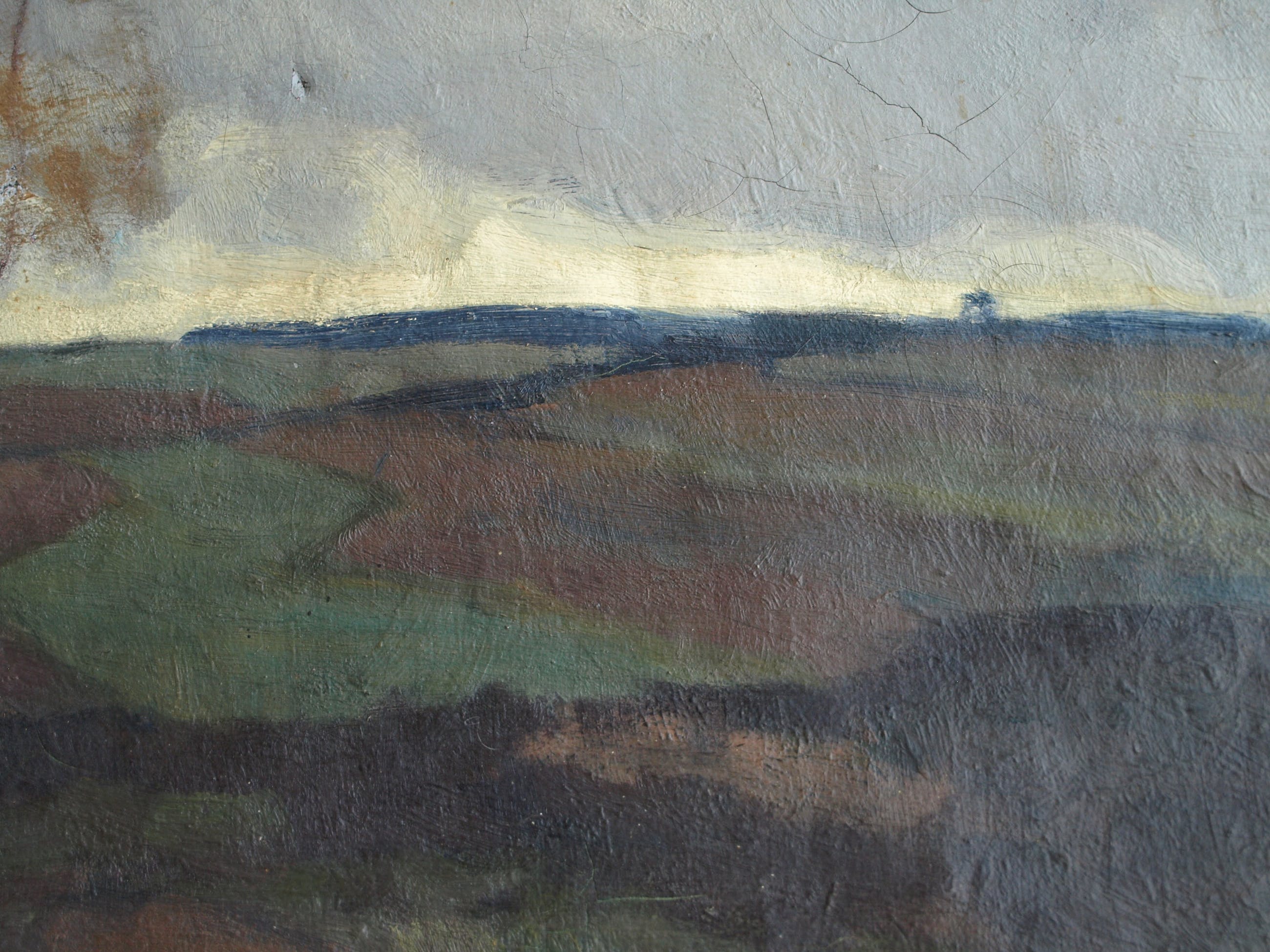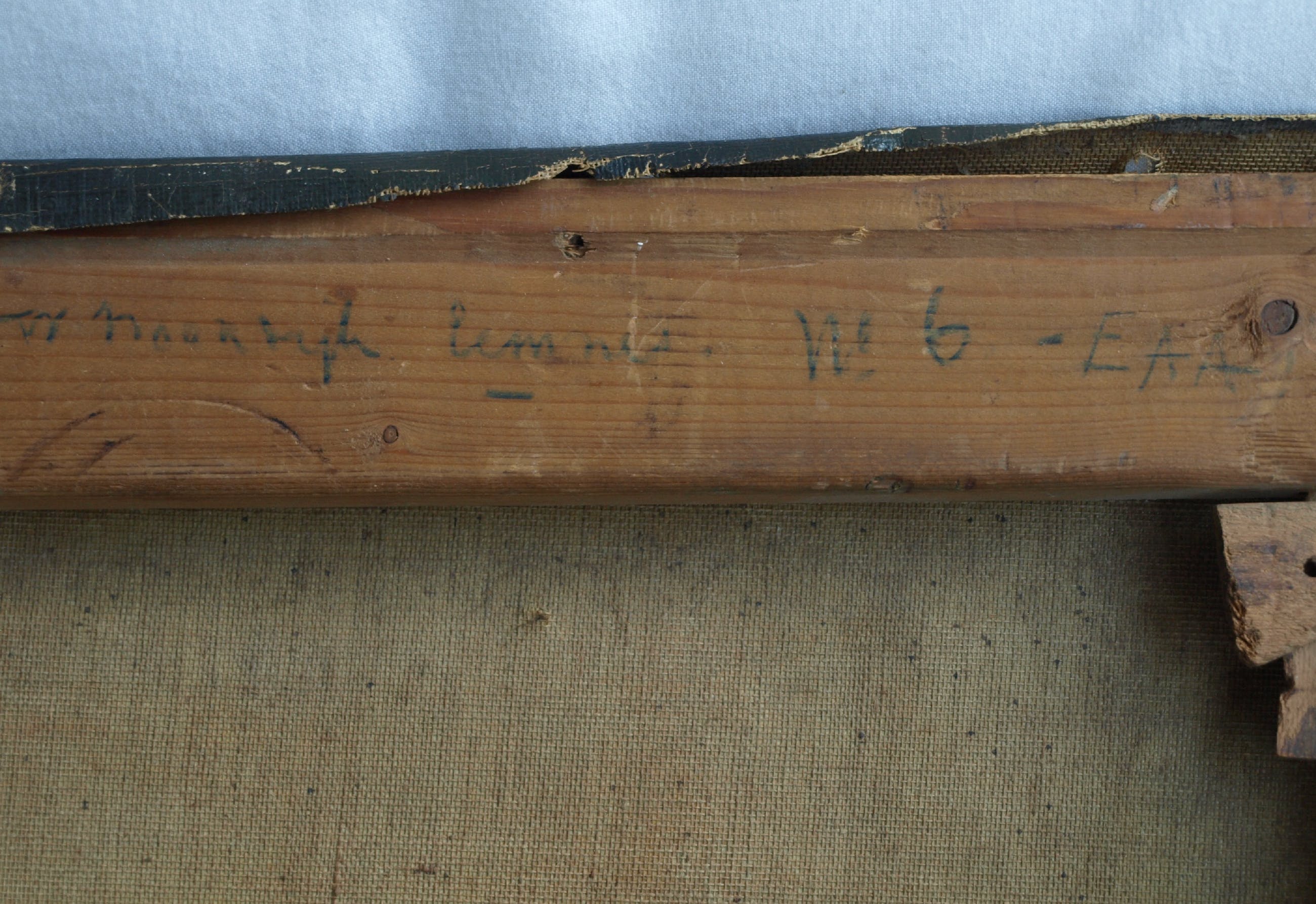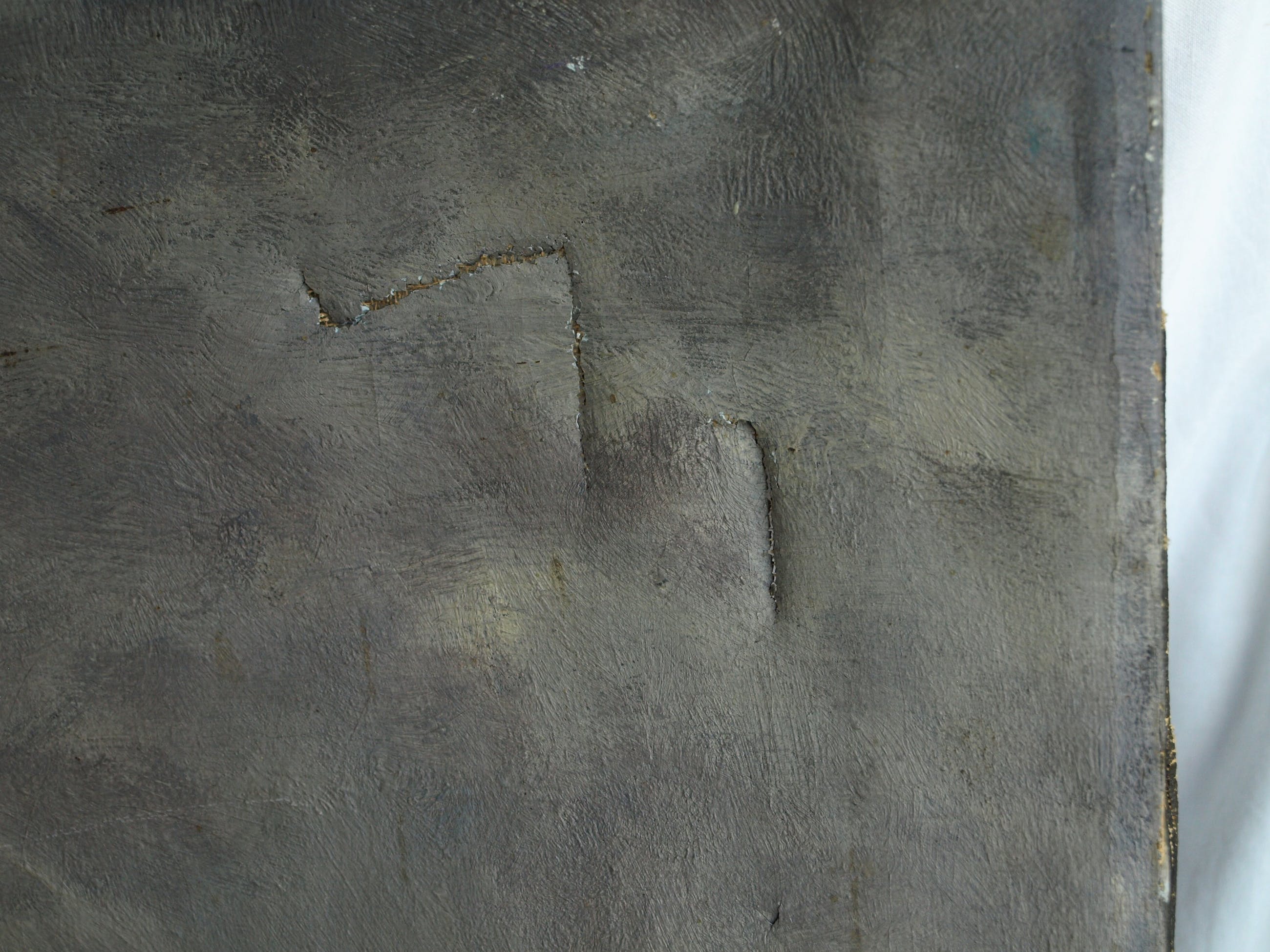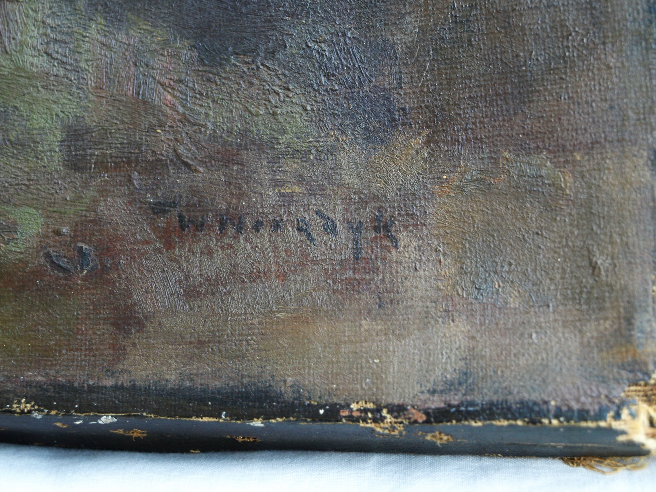 -Conditie: Het werk heeft slijtage aan de randen en de vernislaag is afgesleten. Aan de linkerkant is een restauratieplek (stukje doek op de achterkant van het doek bevestigd). Het doek heeft ‘deukjes’ en heeft rechtsboven 2 ‘winkelhaken’.