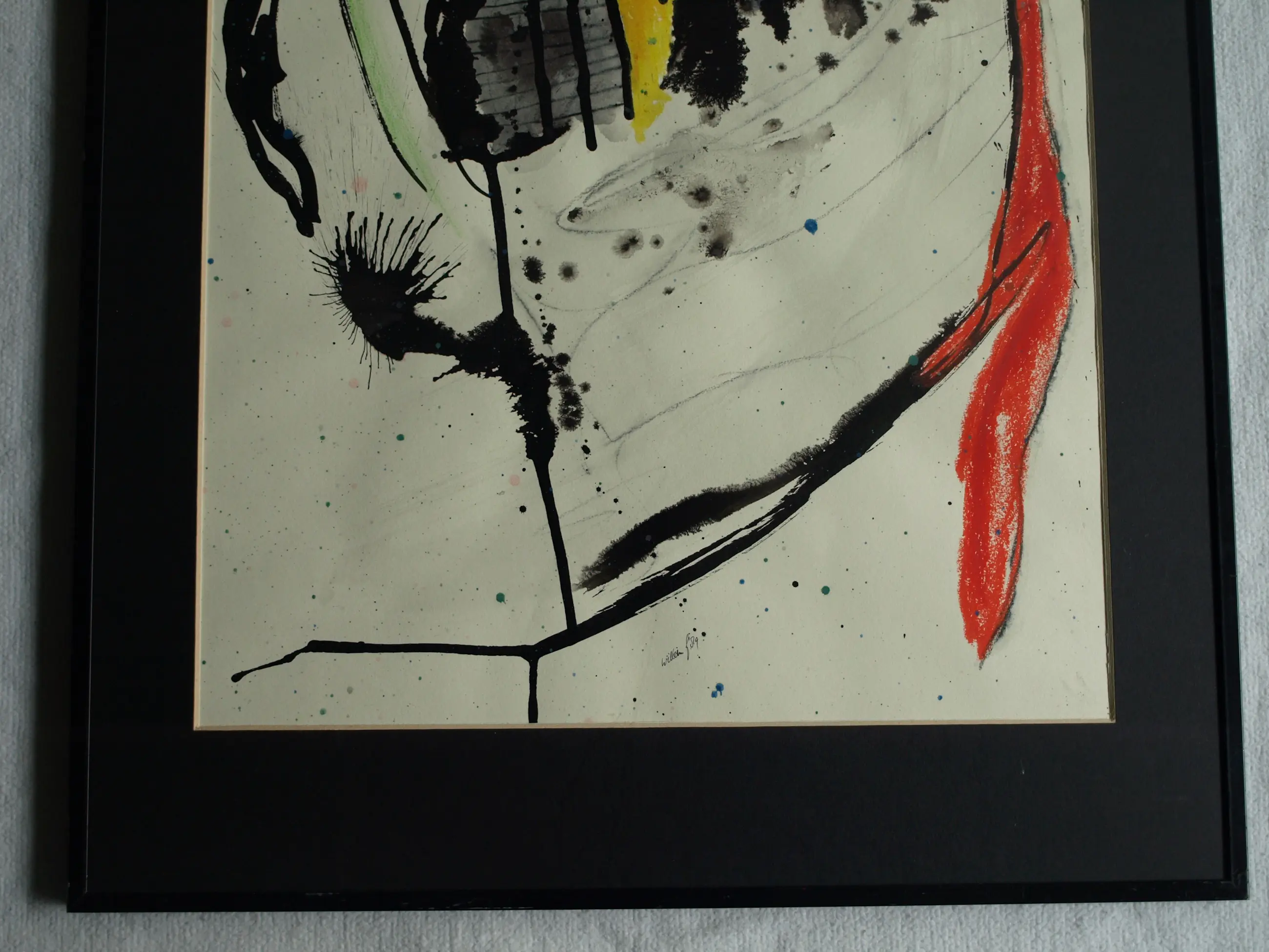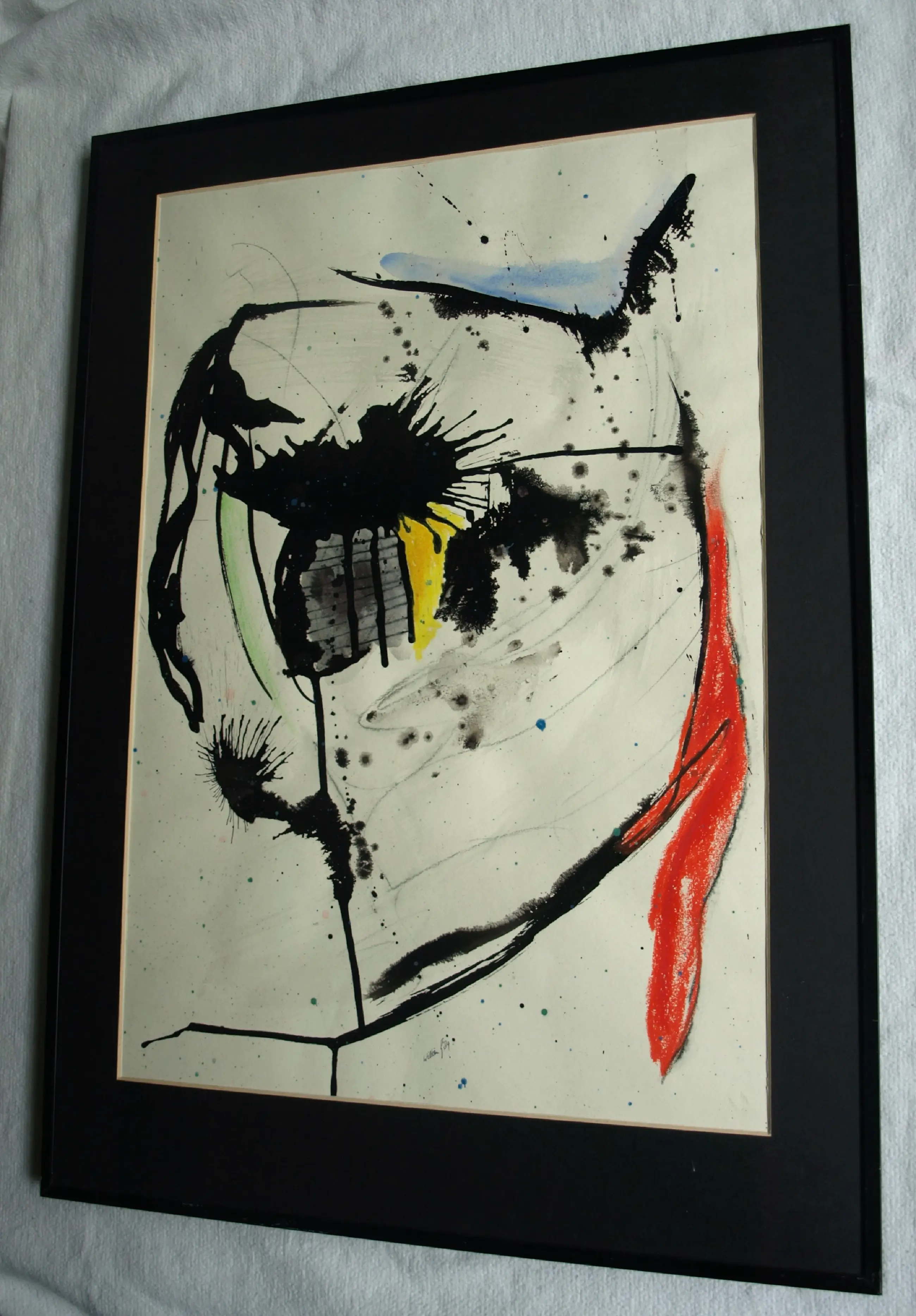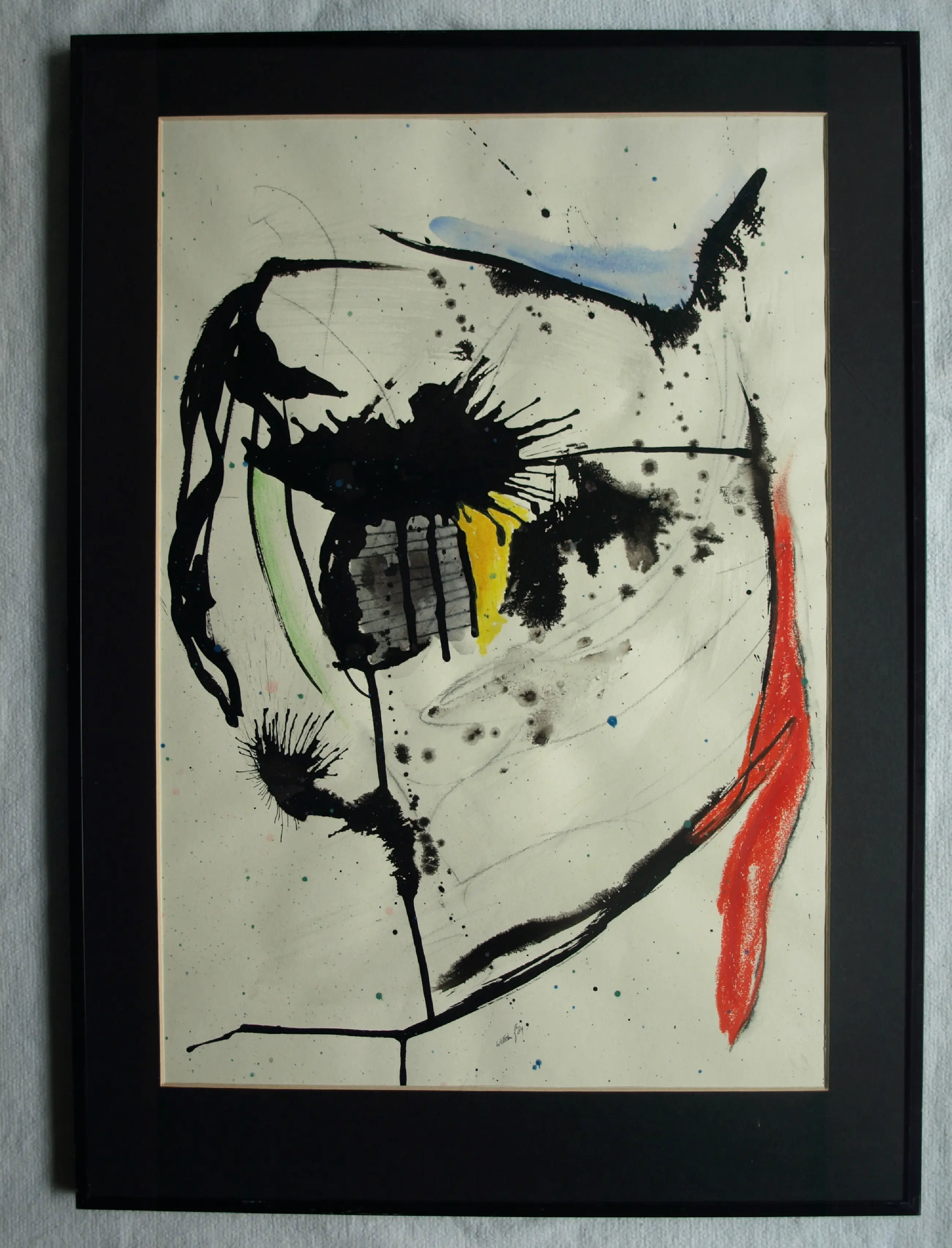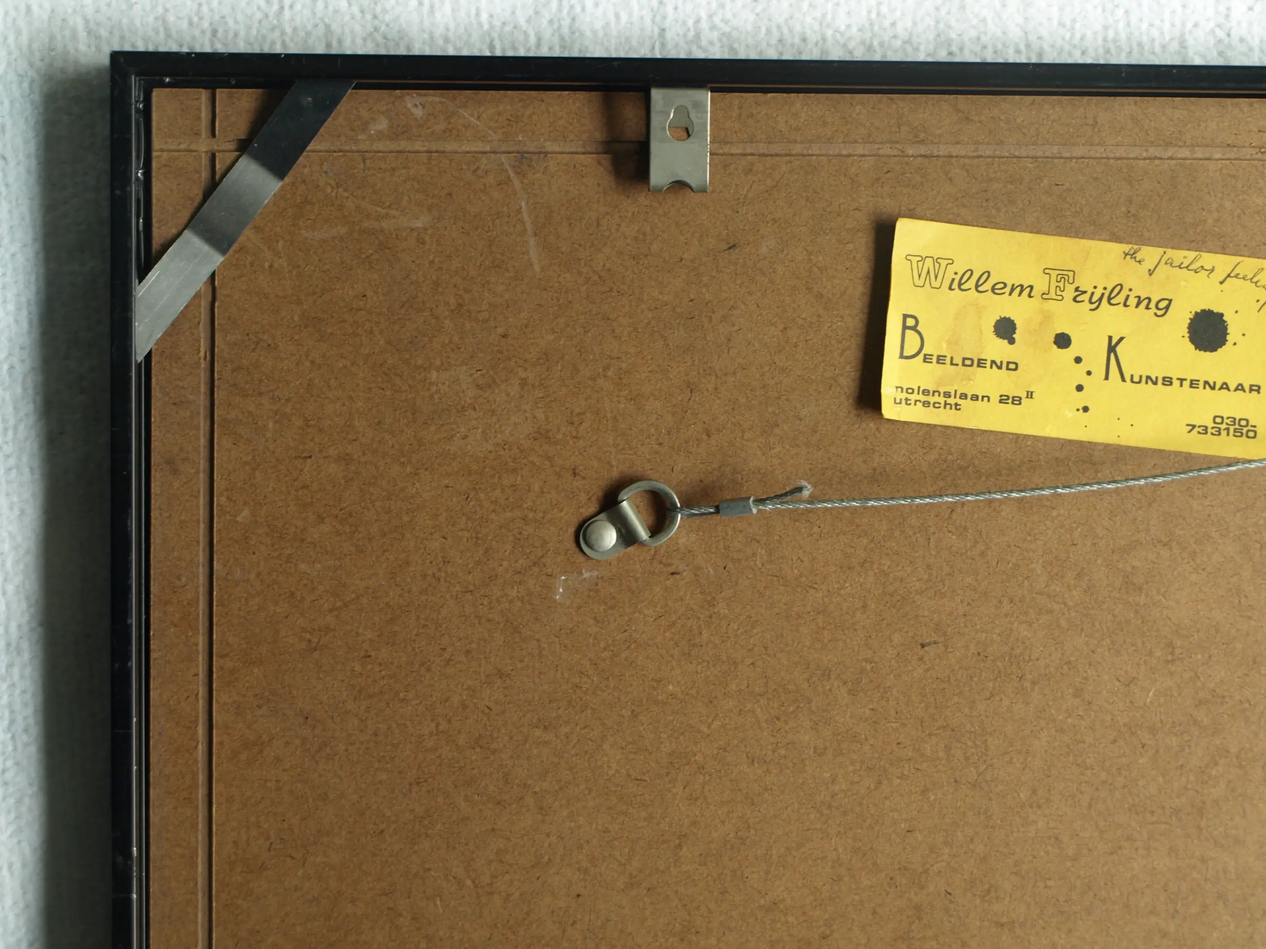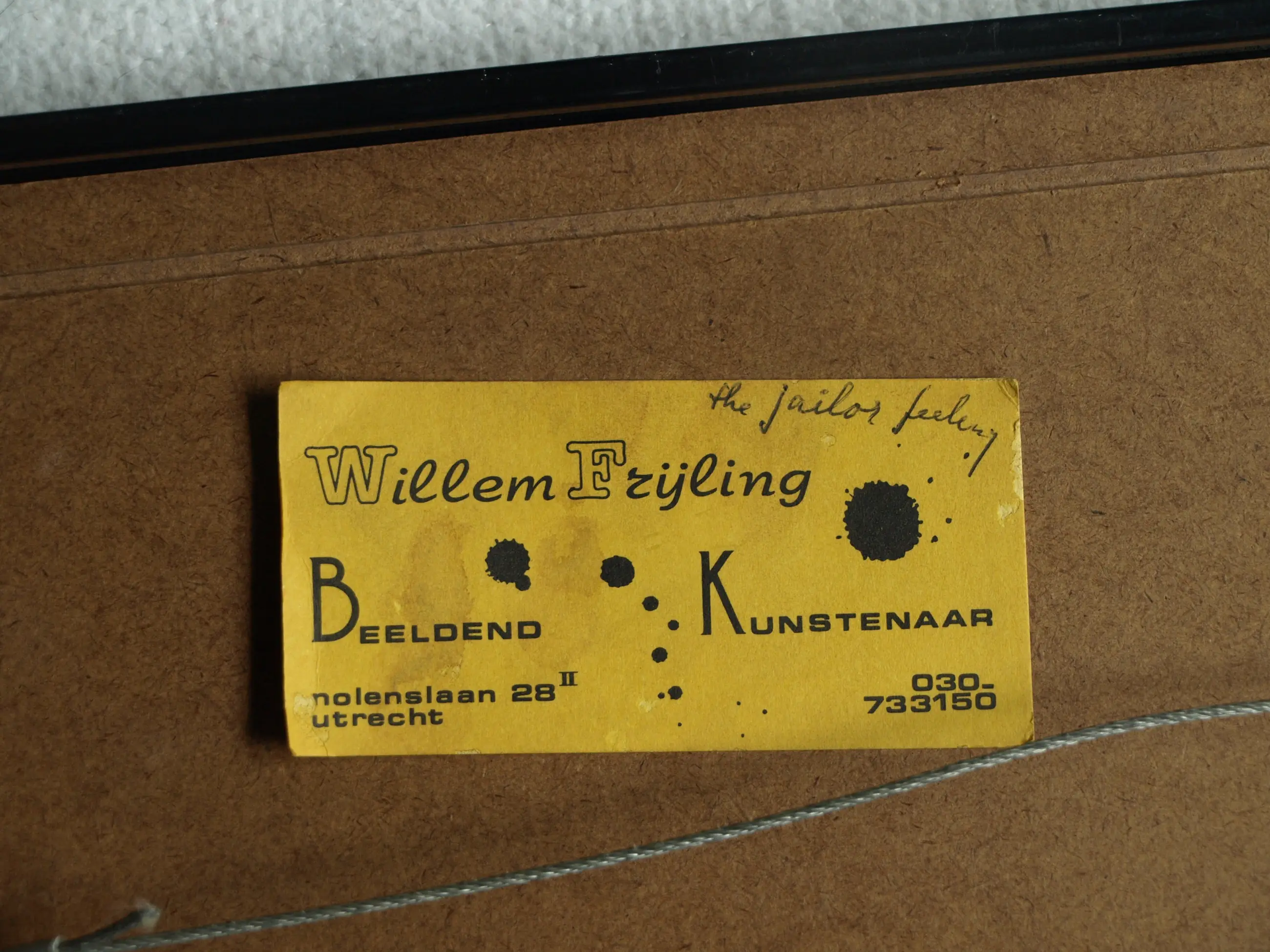 Een ingelijste werk uit 1989 van de Nederlandse kunstenaar Willem Frijling (1948), getiteld “The Jailor Feeling”. -Gesigneerd en gedateerd midden onder. Met het visitekaartje van de kunstenaar op de achterkant van de lijst. -Ingelijst in een zwarte metalen lijst met passe-partout (zonder glasplaat). Kan zo aan de muur. -Afmetingen: Lijst, 71 x 51 x 2 cm. Beeld, 58 x 39½ cm. -Herkomst: Uit een inboedel. -Conditie: In goede staat. De lijst heeft slijtplekken. Ingelijst zonder glasplaat. Zie ook alle foto’s voor een eigen indruk. Kan zo aan de muur.