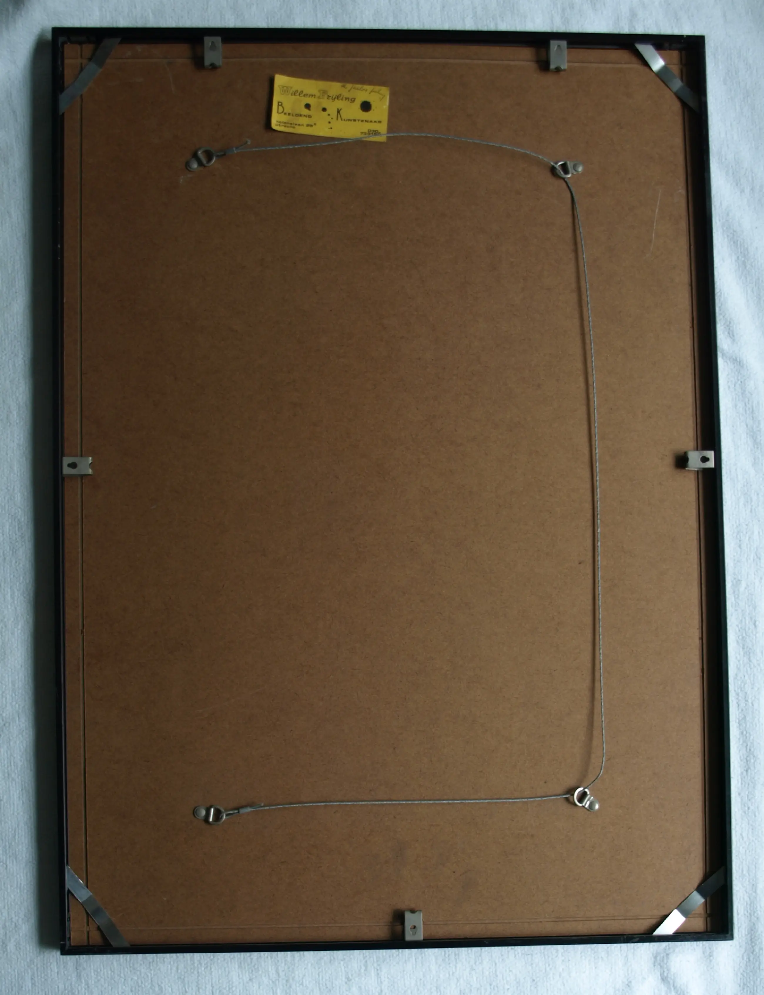 In goede staat. De lijst heeft slijtplekken. Ingelijst zonder glasplaat. Zie ook alle foto’s voor een eigen indruk. Kan zo aan de muur.