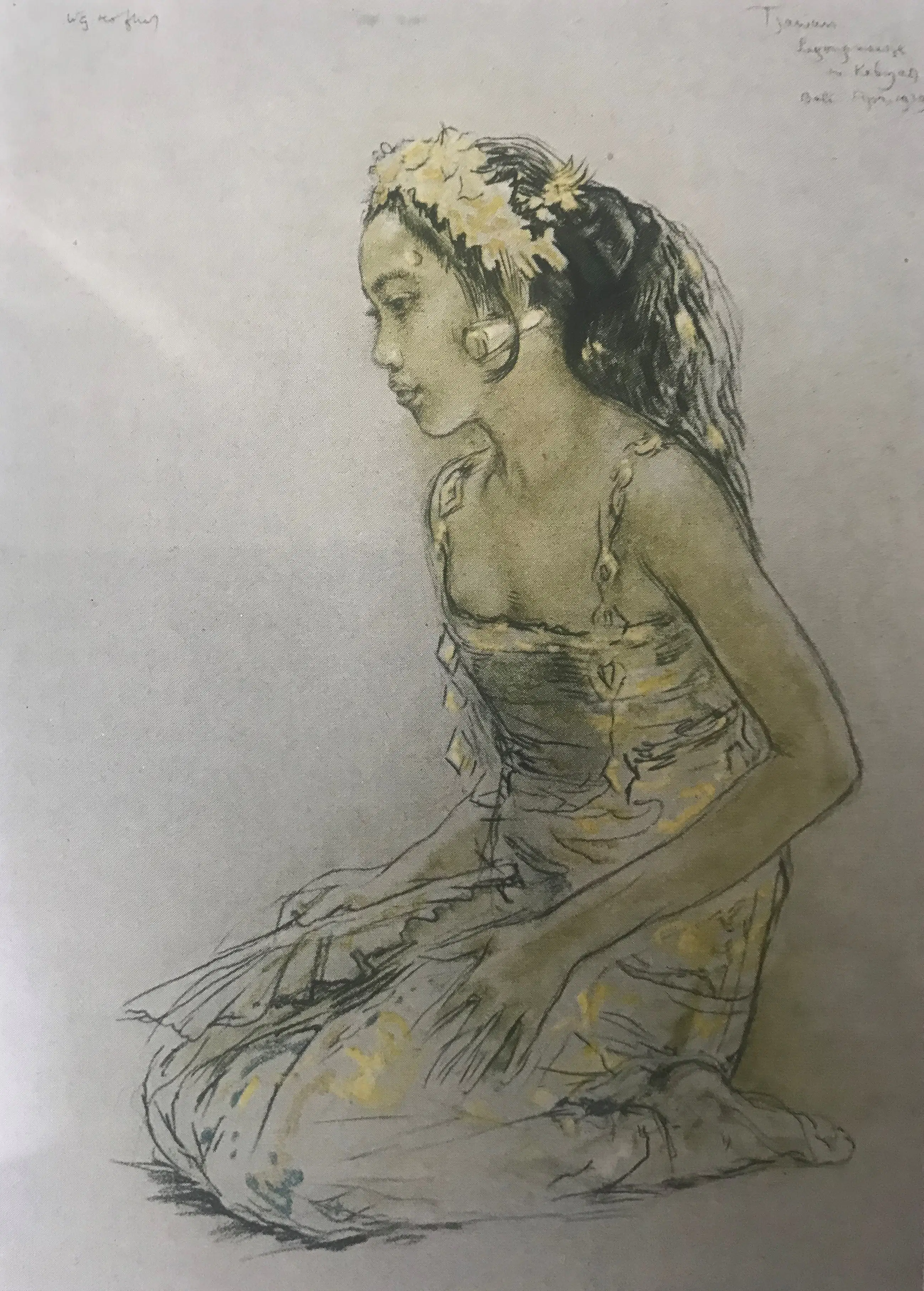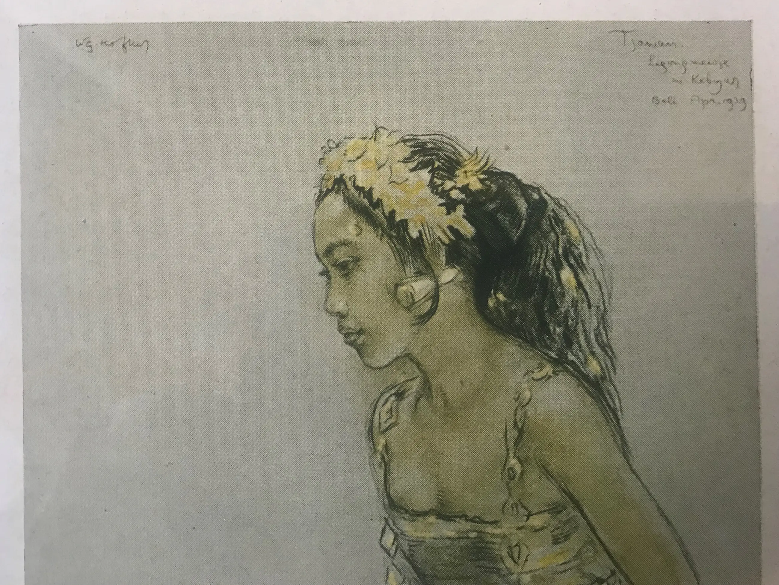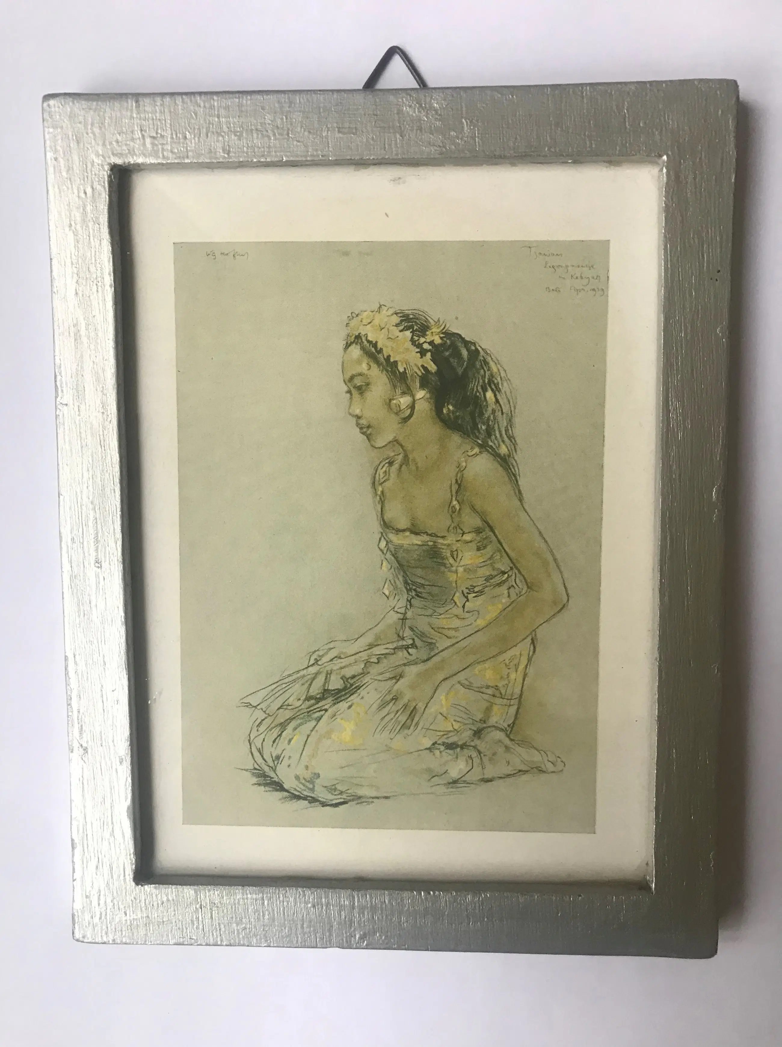 Ingelijst achter glas prent afbeeldend een knielend Balinees meisje met een grote bloem in het haar en gekleed in een Kabaya Gesigneerd in de druk linksboven: W.G. Hofker Tevens rechtsboven handgeschreven in de print: Bali, apr 1939 Inclusief eenvoudige houten lijst en passe-partout.