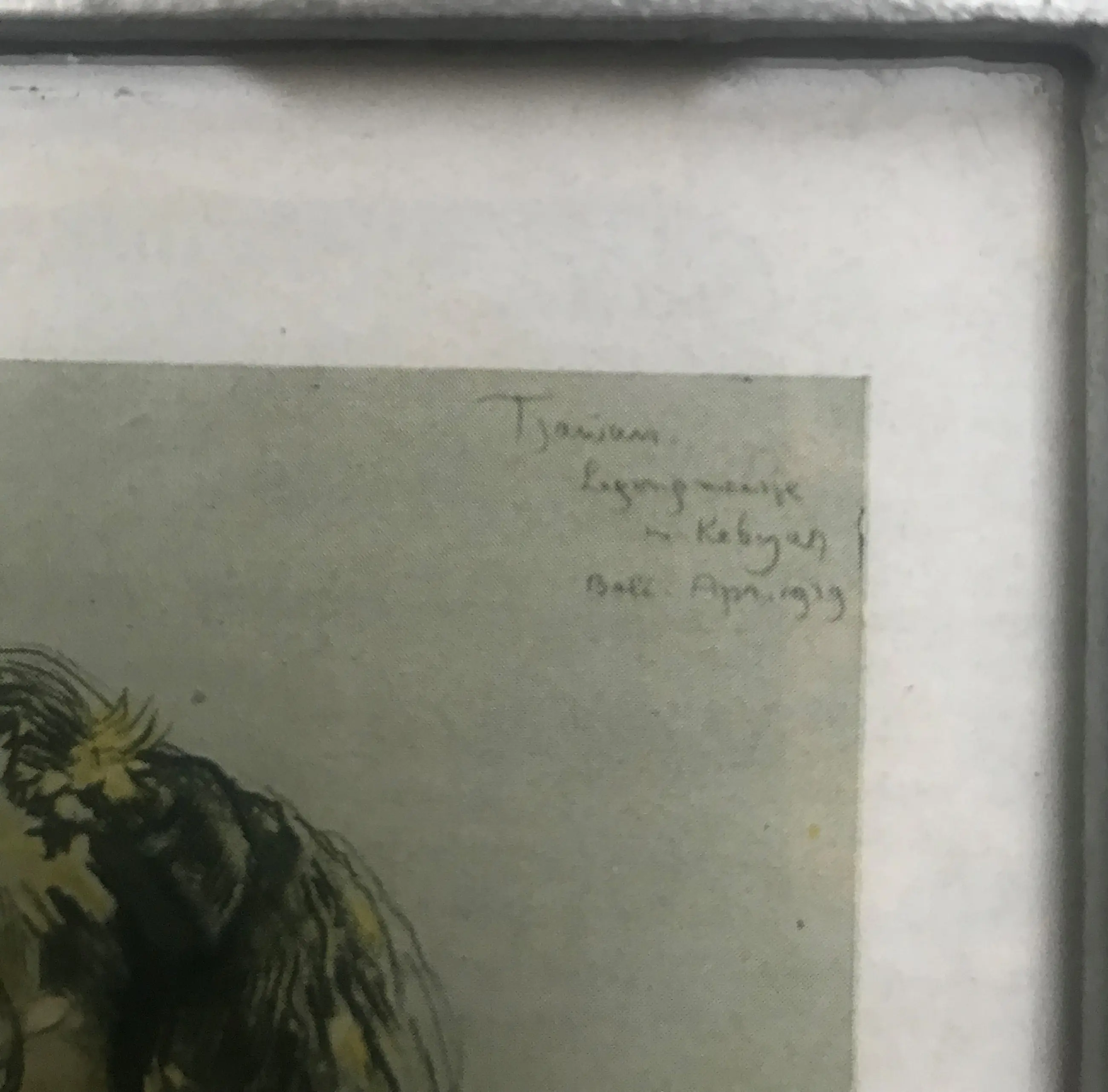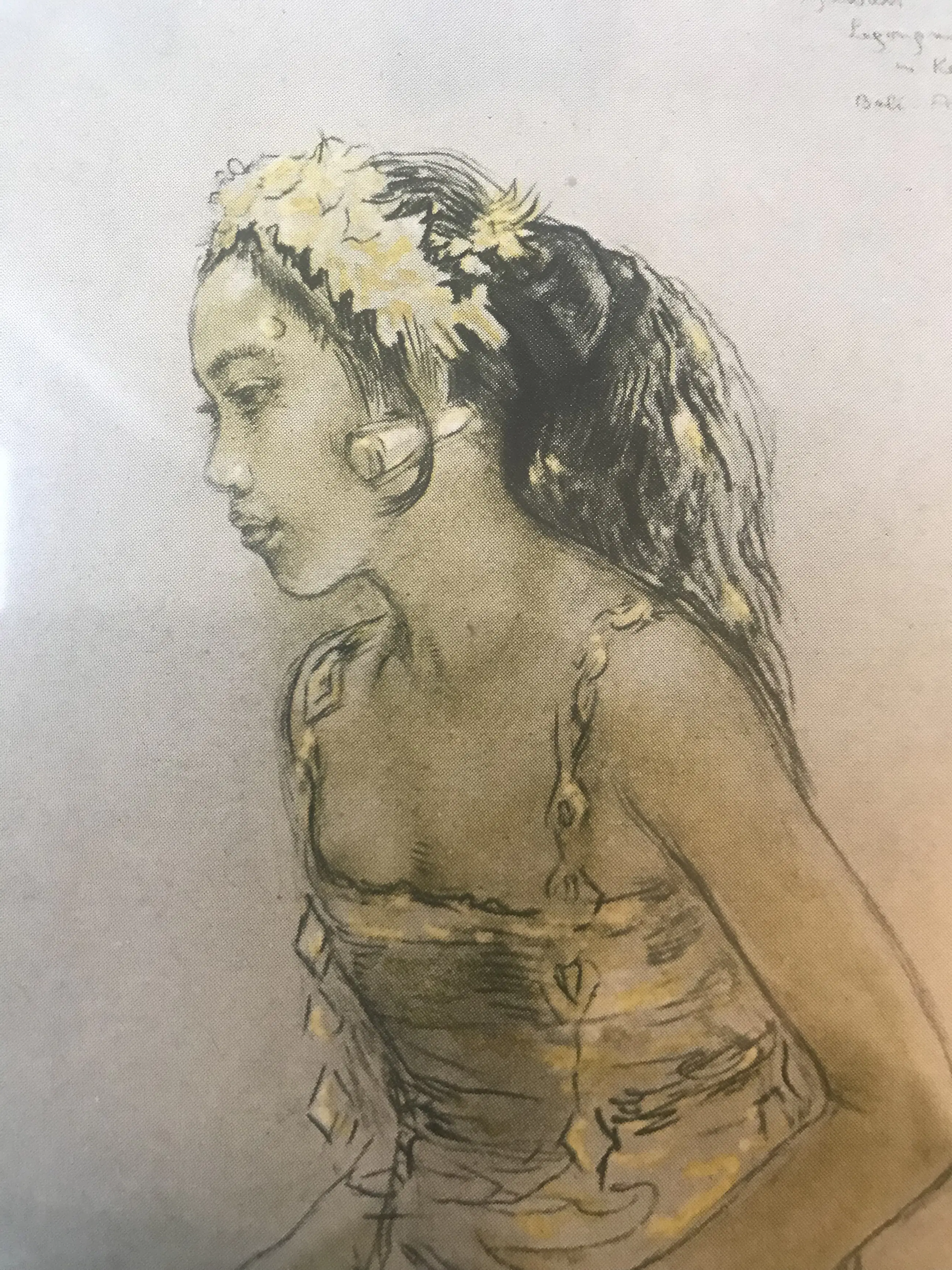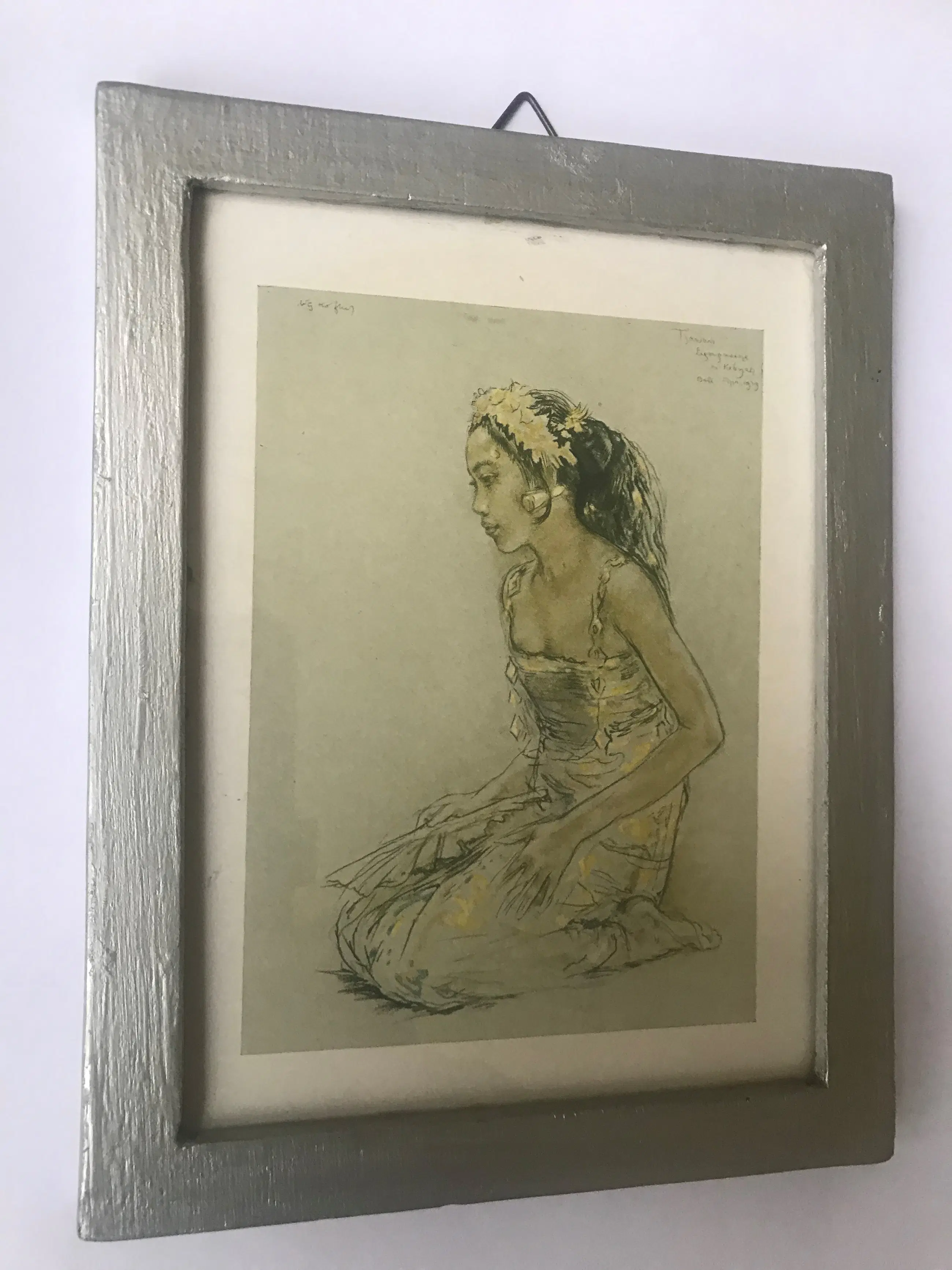 Ingelijst achter glas prent afbeeldend een knielend Balinees meisje met een grote bloem in het haar en gekleed in een Kabaya Gesigneerd in de druk linksboven: W.G. Hofker Tevens rechtsboven handgeschreven in de print: Bali, apr 1939 Inclusief eenvoudige houten lijst en passe-partout.