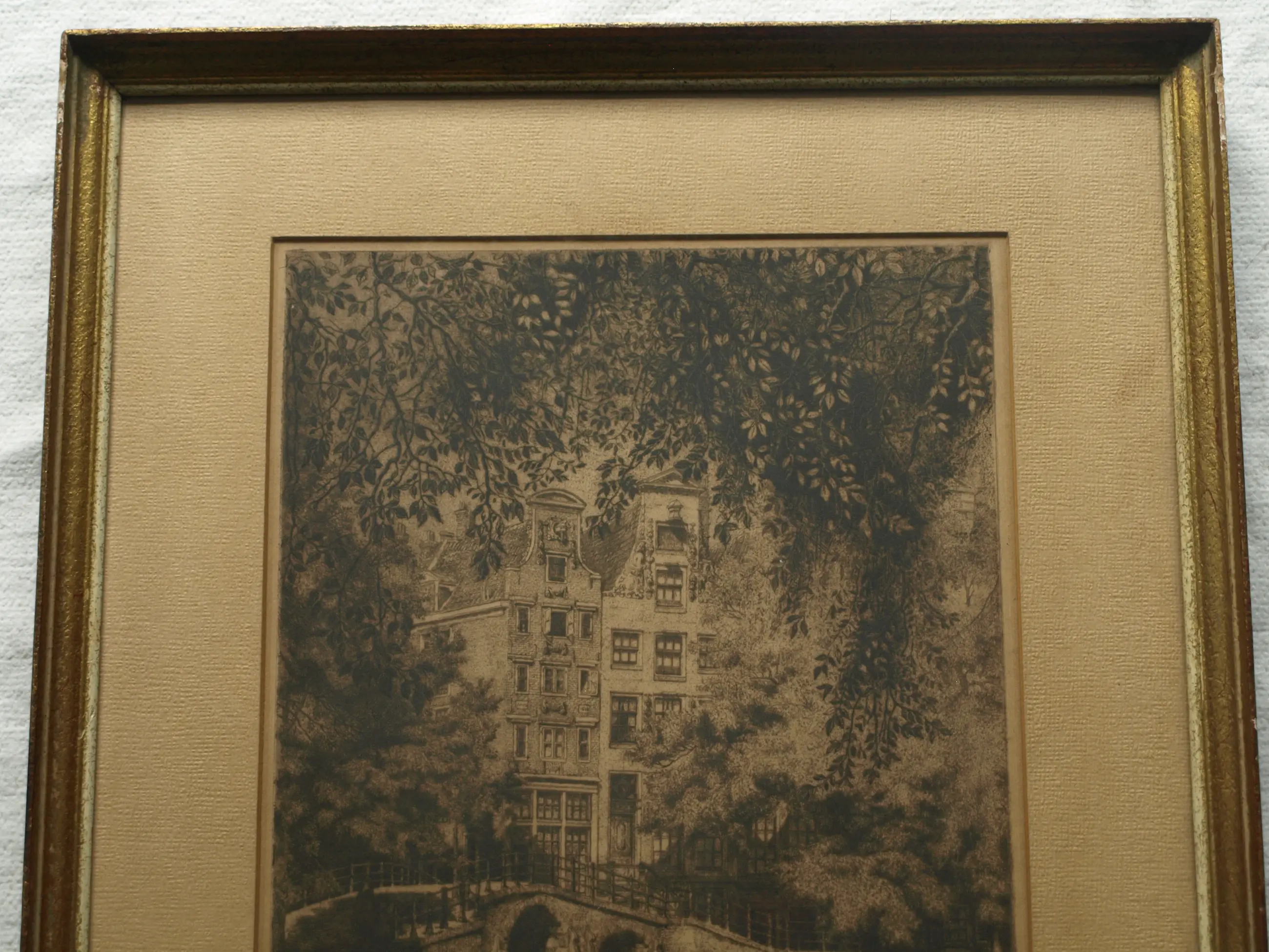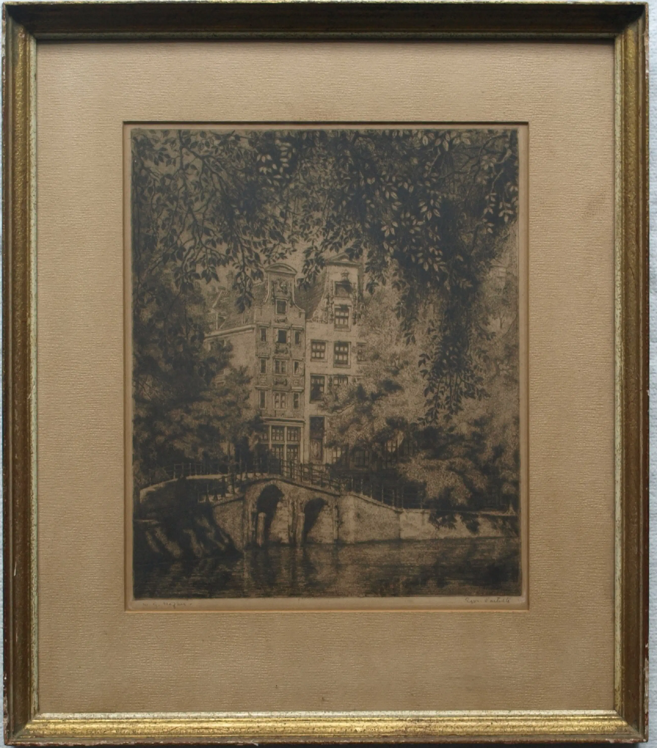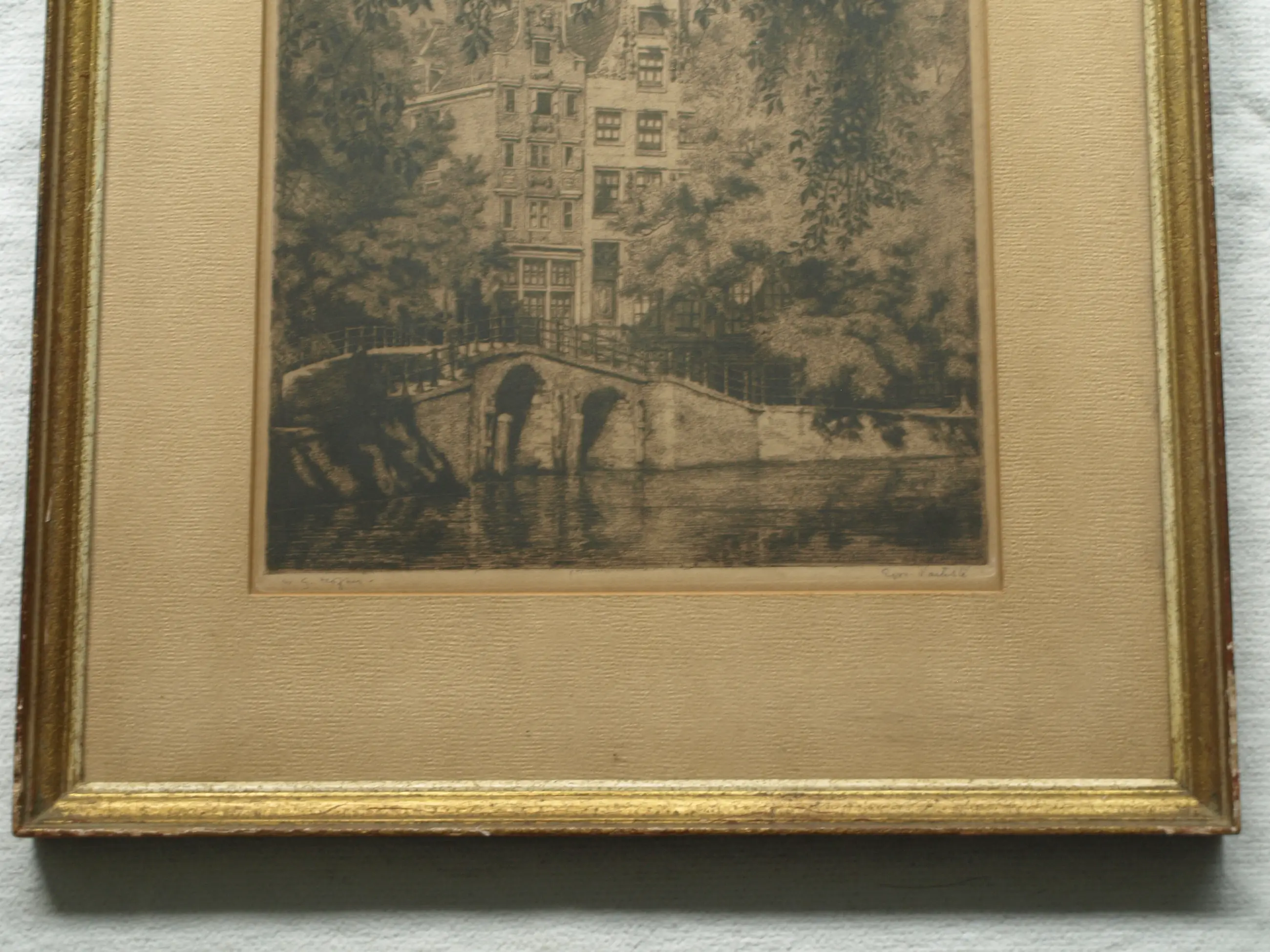 Een ingelijste ets uit 1928 van de Nederlandse kunstenaar Willem Gerard Hofker (1902-1981). De afbeelding is de brug op de hoek van de Leidsegracht en de Herengracht in Amsterdam. -Gesigneerd met potlood linksonder en ook gesigneerd en gedateerd in de etsplaat rechtsonder. Een eigen druk van de kunstenaar (épreuve d’artiste). -Ingelijst in de originele houten lijst met passe-partout en glasplaat. -Afmetingen: Lijst, 50 x 43½ x3 cm. Beeld / ets, 32 x 26½ cm. -Conditie: De ets is in goede staat. Het papier van de ets en het passe-partout is verkleurd door de tand des tijds. De lijst heeft slijtplekjes en is wat ‘verweerd’. Zie ook de foto’s. Kan zo aan de muur.