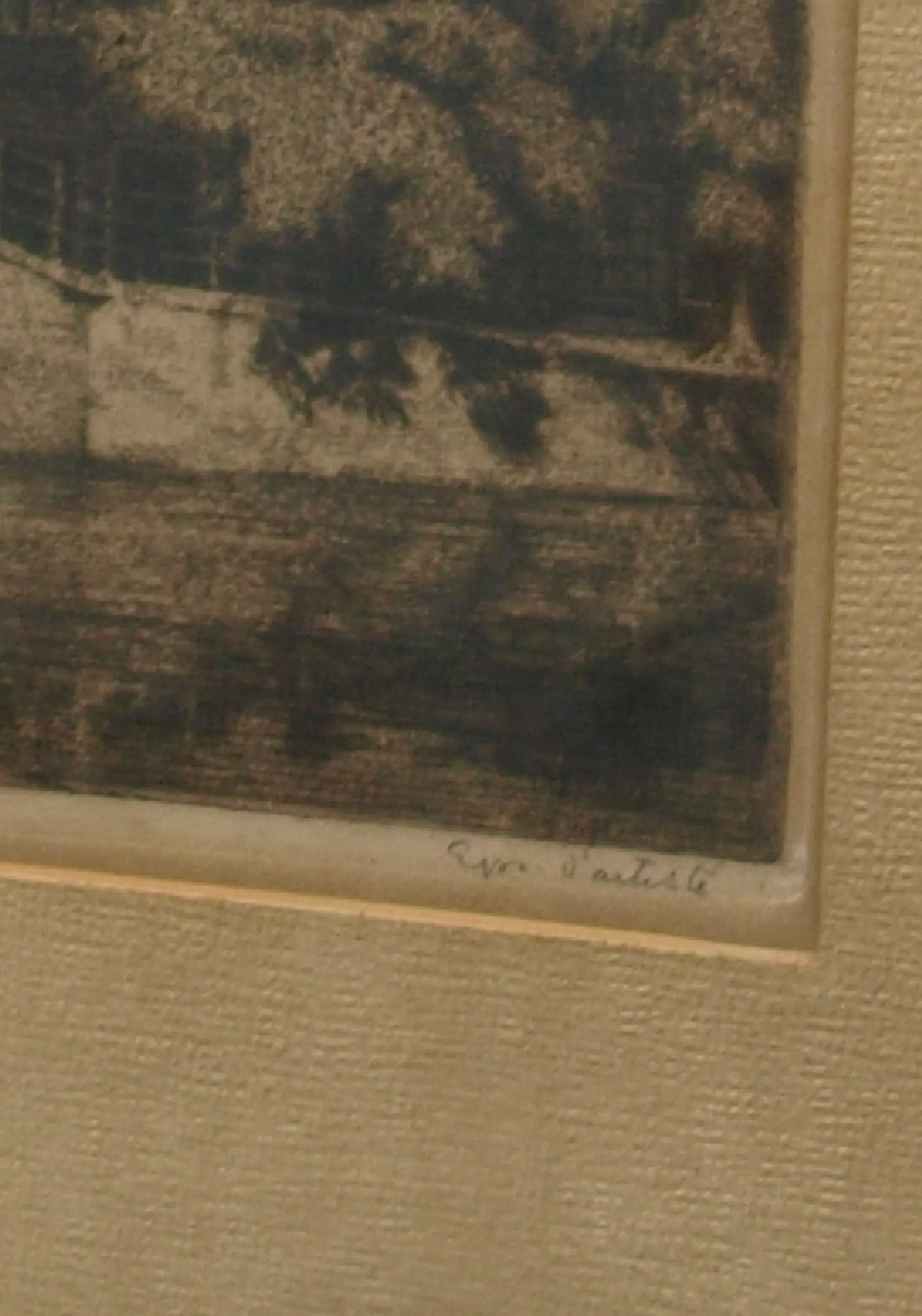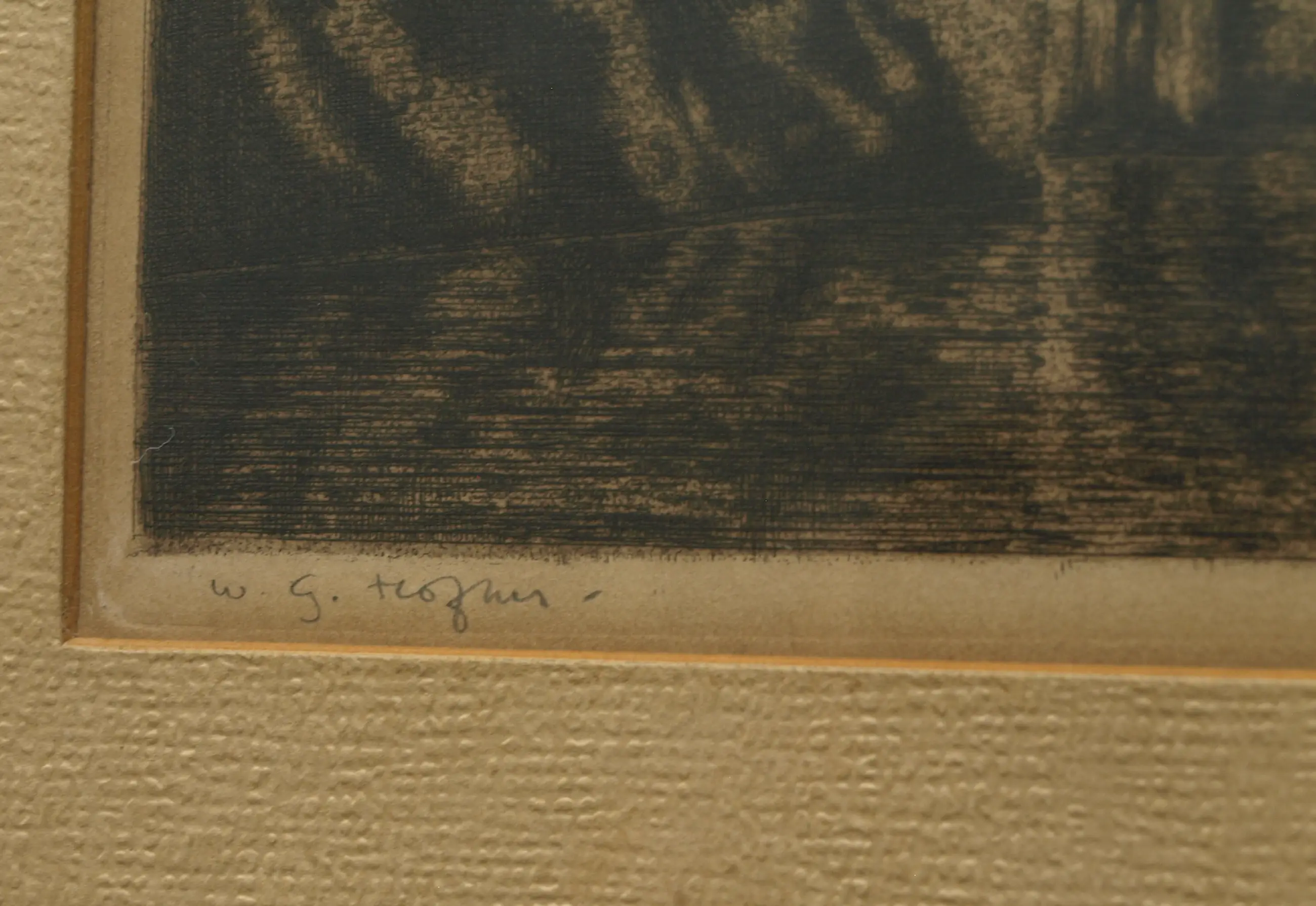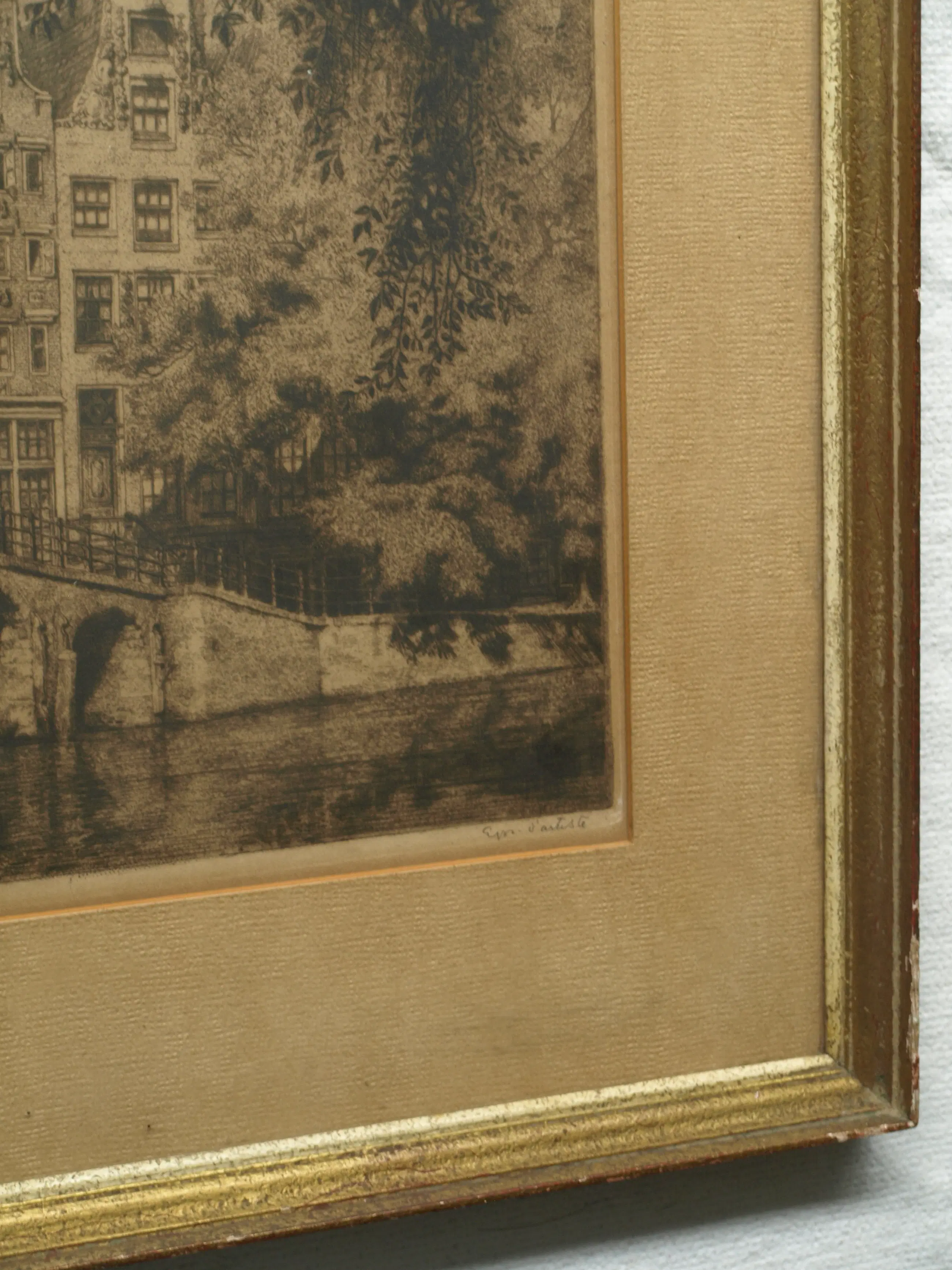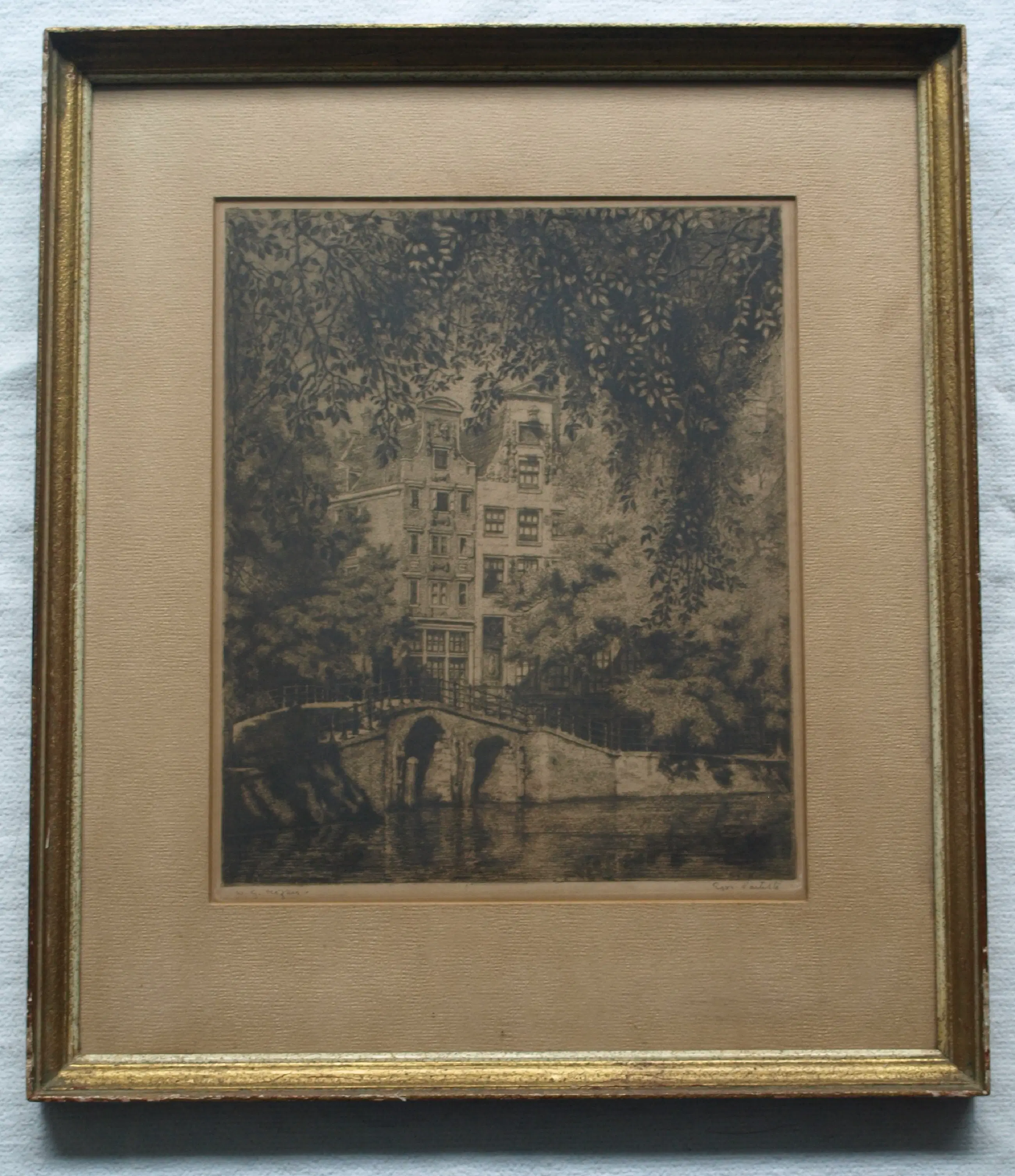Een ingelijste ets uit 1928 van de Nederlandse kunstenaar Willem Gerard Hofker (1902-1981). De afbeelding is de brug op de hoek van de Leidsegracht en de Herengracht in Amsterdam. -Gesigneerd met potlood linksonder en ook gesigneerd en gedateerd in de etsplaat rechtsonder. Een eigen druk van de kunstenaar (épreuve d’artiste). -Ingelijst in de originele houten lijst met passe-partout en glasplaat. -Afmetingen: Lijst, 50 x 43½ x3 cm. Beeld / ets, 32 x 26½ cm. -Conditie: De ets is in goede staat. Het papier van de ets en het passe-partout is verkleurd door de tand des tijds. De lijst heeft slijtplekjes en is wat ‘verweerd’. Zie ook de foto’s. Kan zo aan de muur.