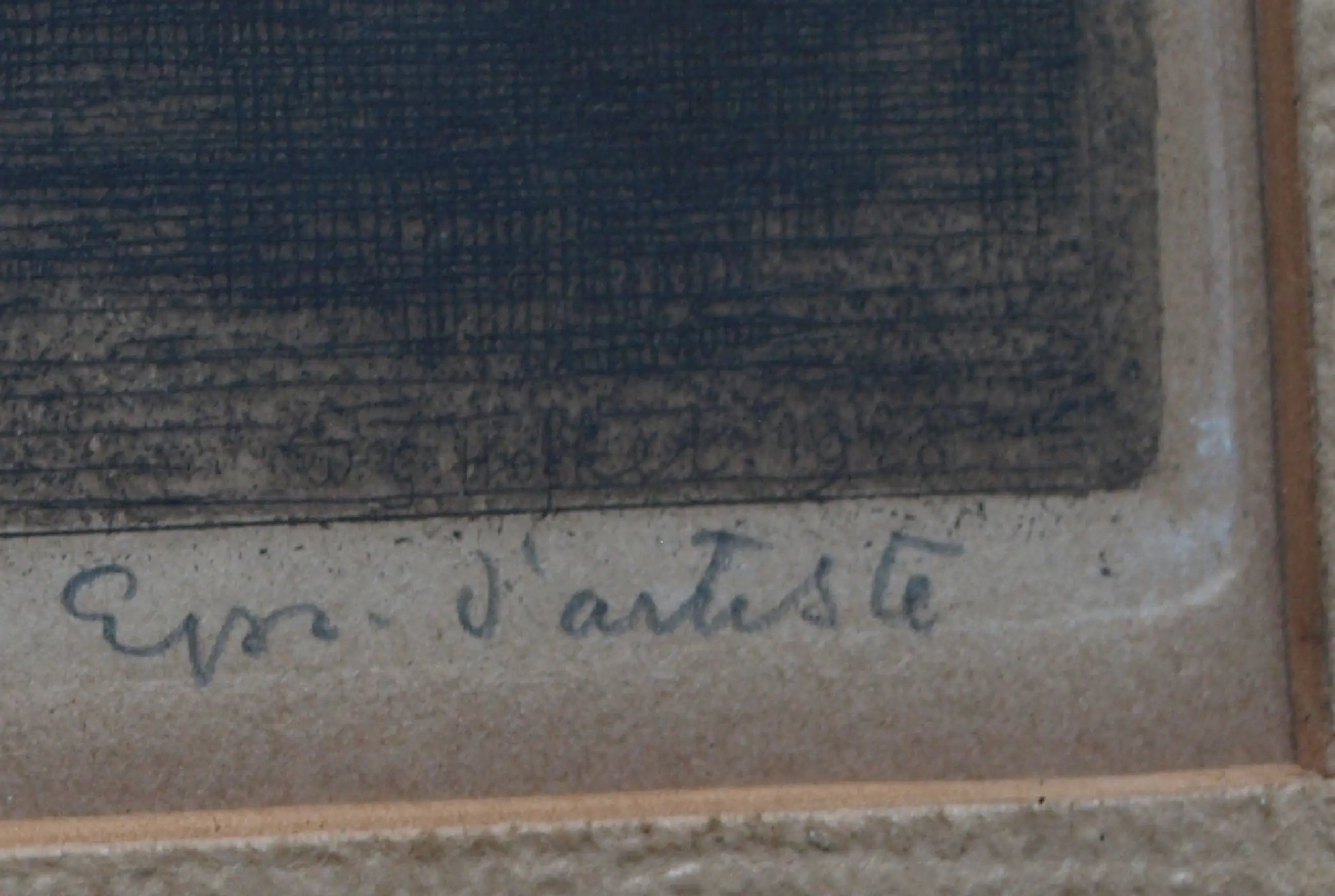 De ets is in goede staat. Het papier van de ets en het passe-partout is verkleurd door de tand des tijds. De lijst heeft slijtplekjes en is wat ‘verweerd’.