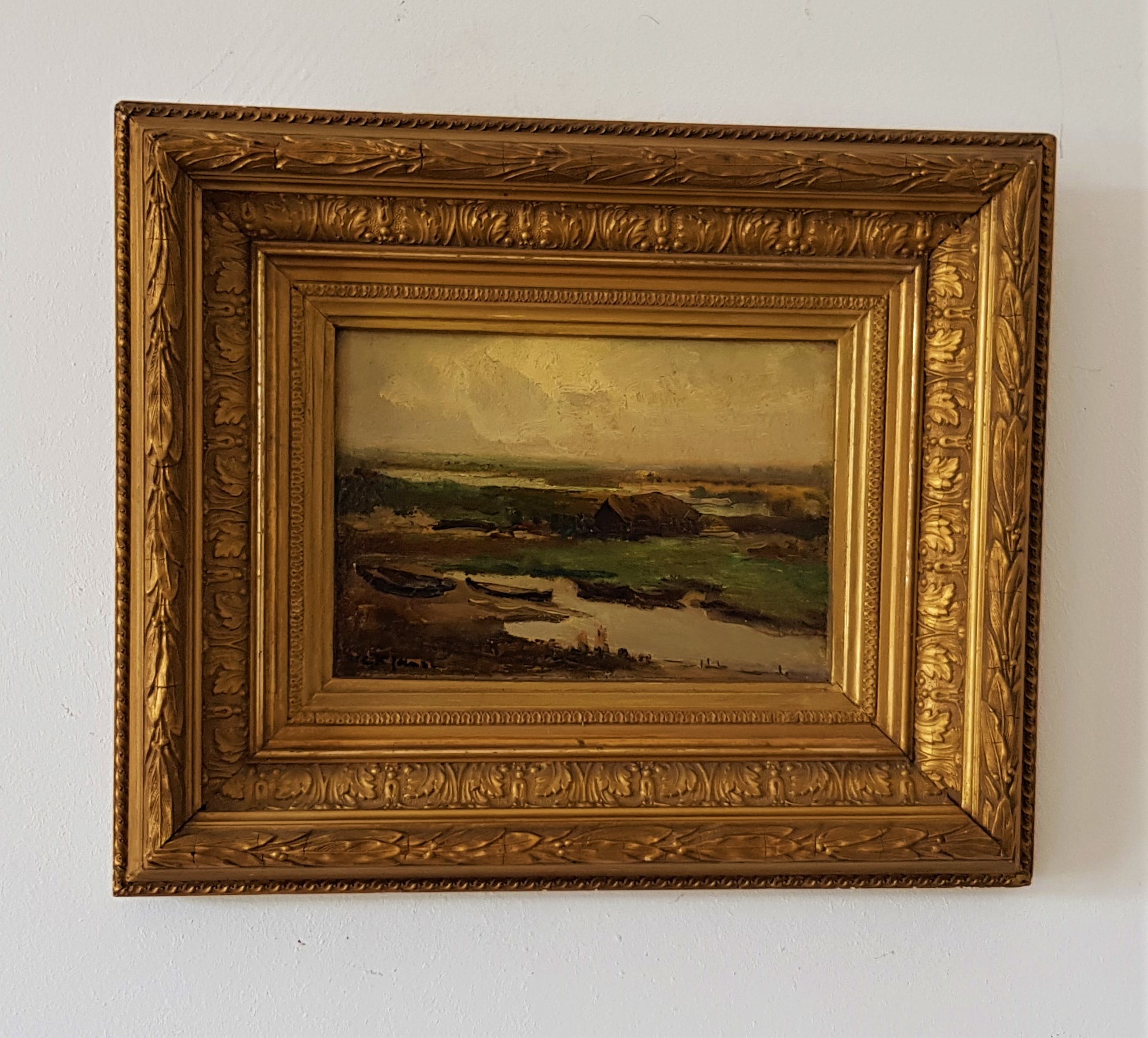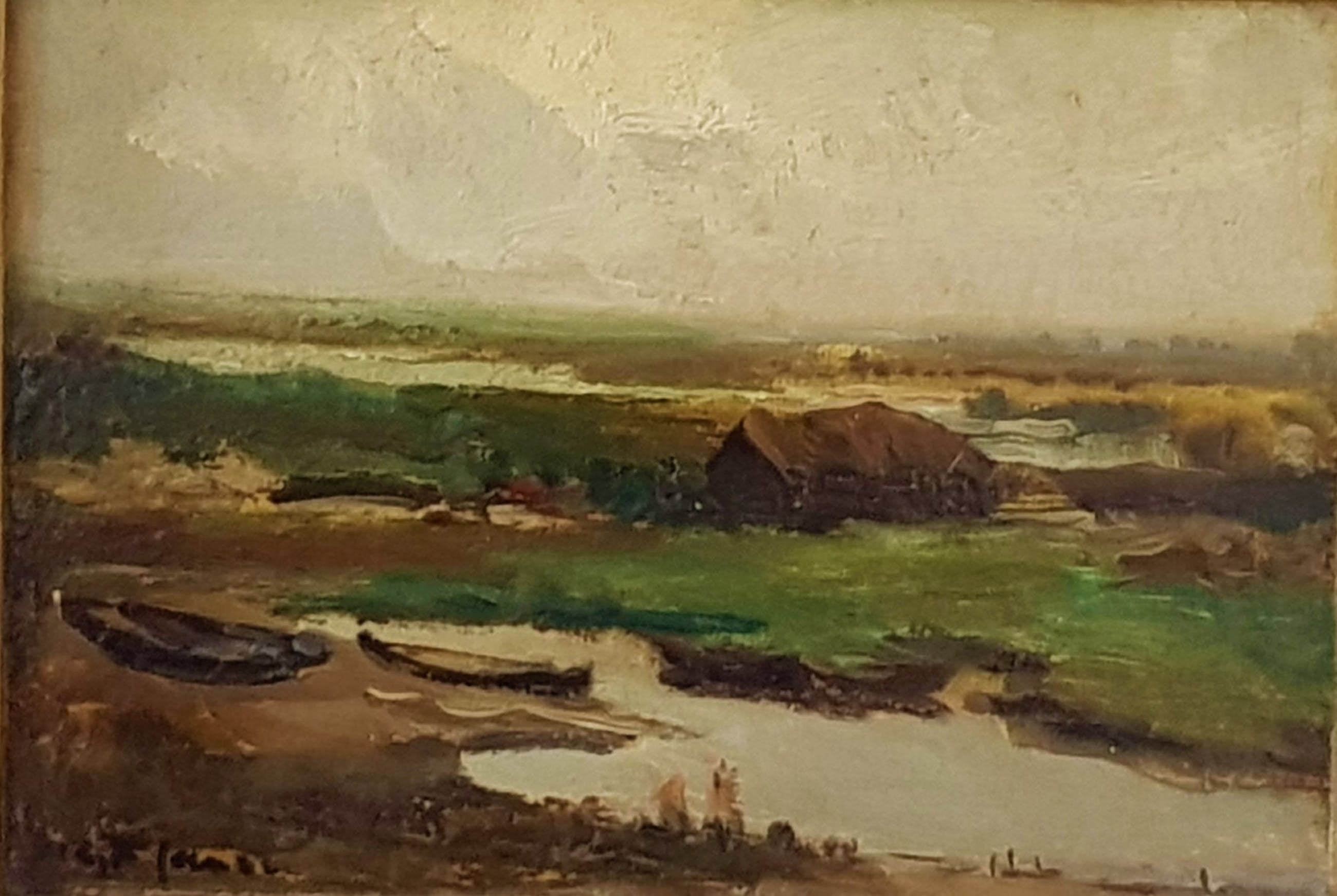 Willem George Frederik JANSEN. Voordat hij zich in 1908 als vrij schilder in Blaricum vestigde werkte W.G.F. Jansen (1871 - 1949) als decoratieschilder bij de porseleinfabriek Rozenburg in Den Haag en als plateelontwerper in Gouda. Zijn werk kan getypeerd worden als nabloei van de Haagse School. Het was vooral Jacob Maris die hij bewonderde, hetgeen tot uiting komt in zijn vlotte penseelvoering en liefde voor het puur Hollandse landschap. Hij schilderde zee- en strandgezichten, intieme boerenerven, riviergezichten onder hoge luchten, weidelandschappen en stille heidelandschappen met schapen. Hij werd alom geprezen om zijn sterk ontwikkeld gevoel voor kleurnuances, vooral in gekleurde witten, groenen en grijzen. Musea: Singermuseum Laren en Zuiderzeemuseum in Enkhuizen.