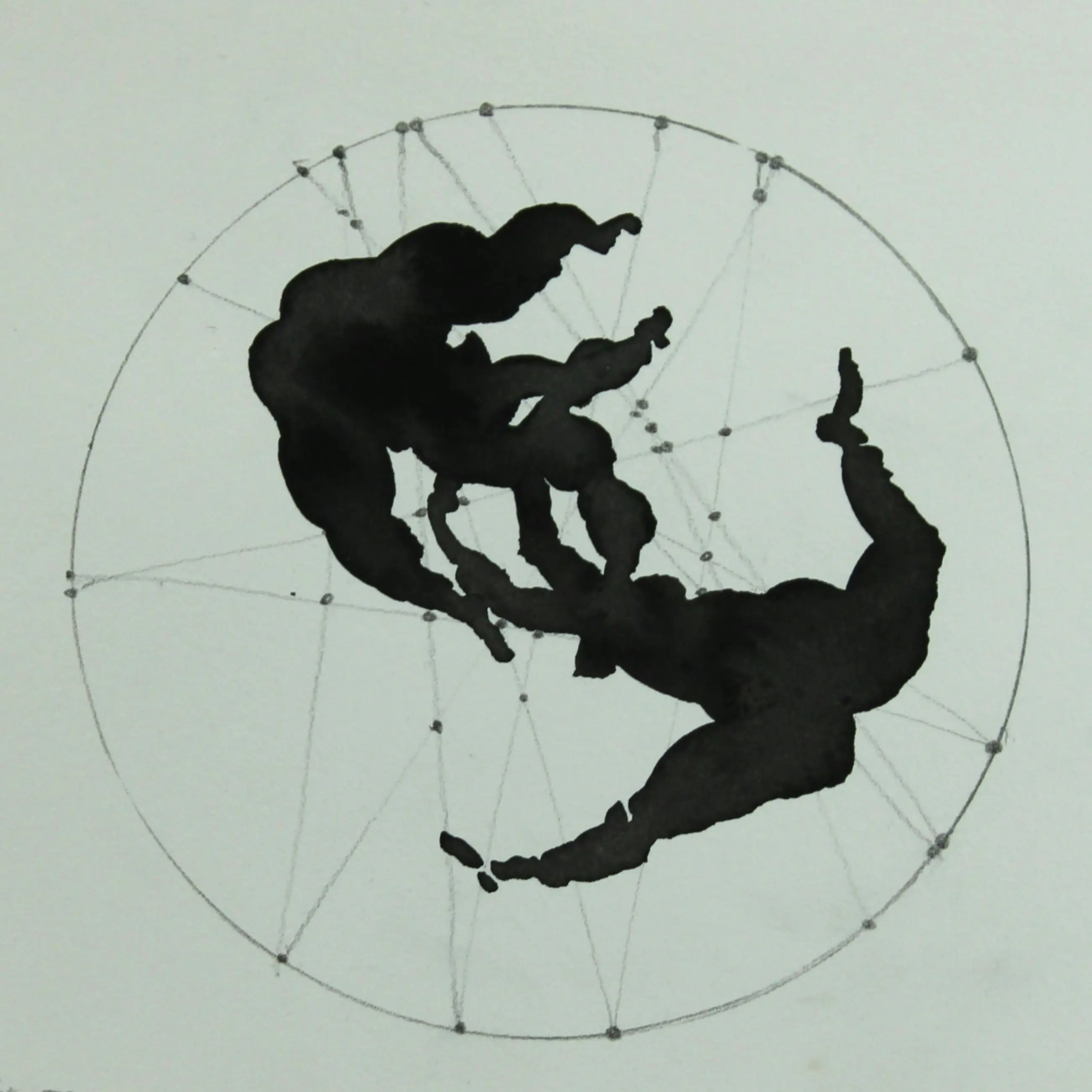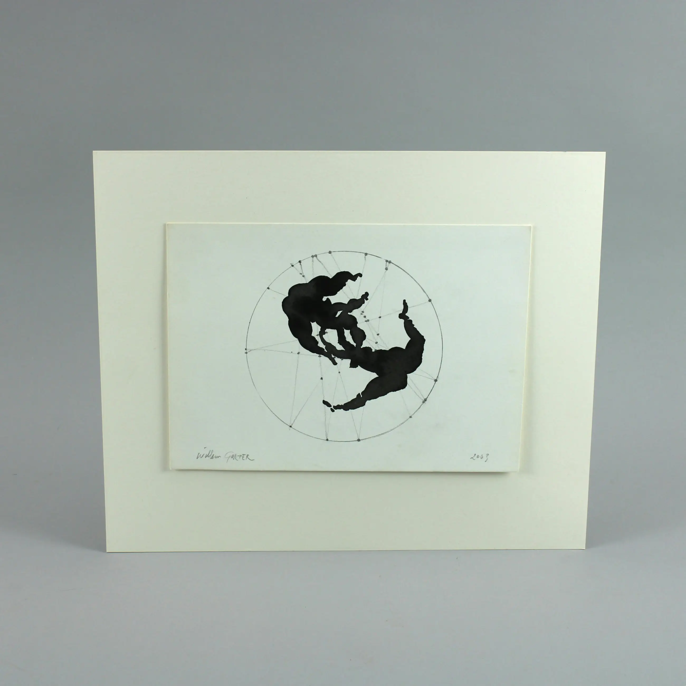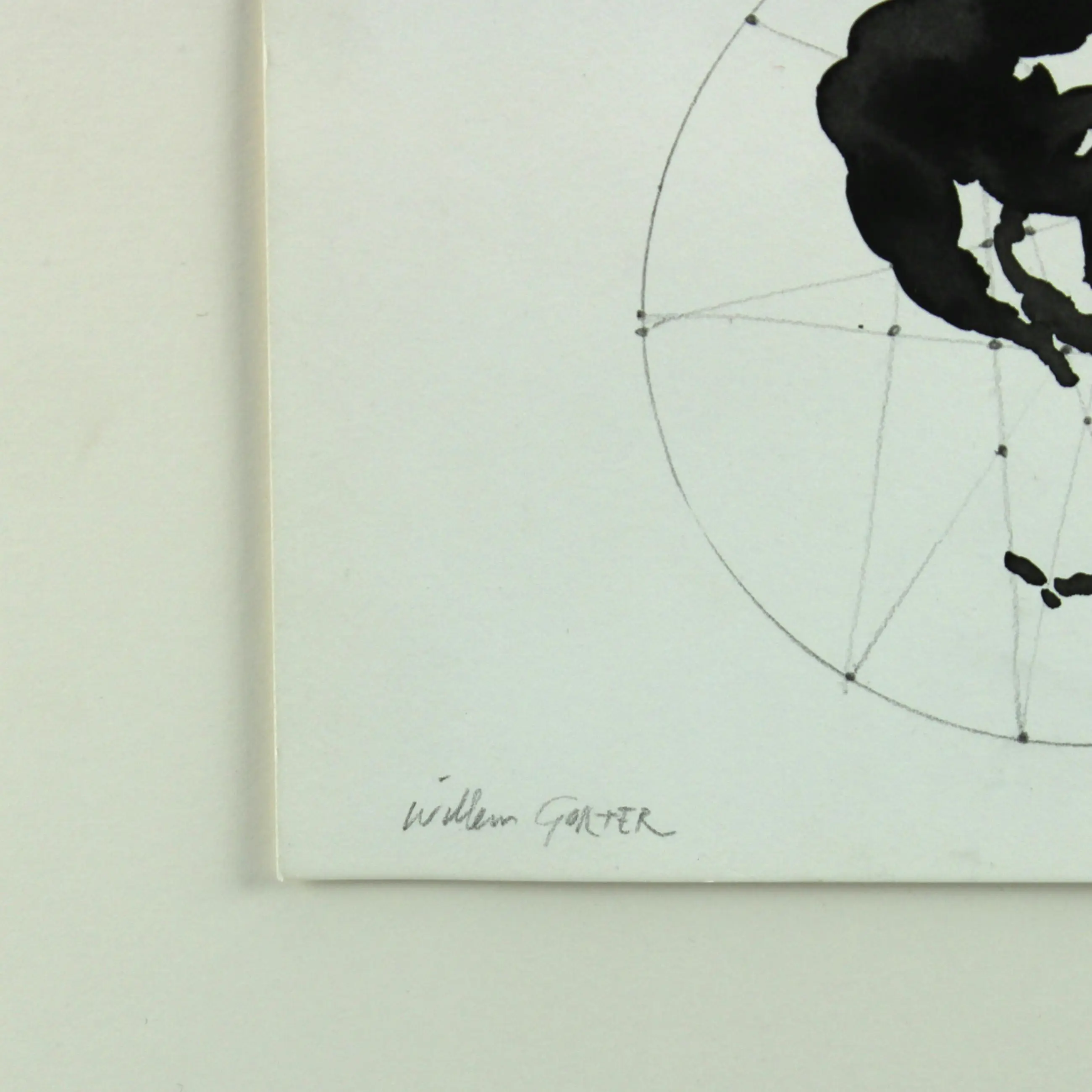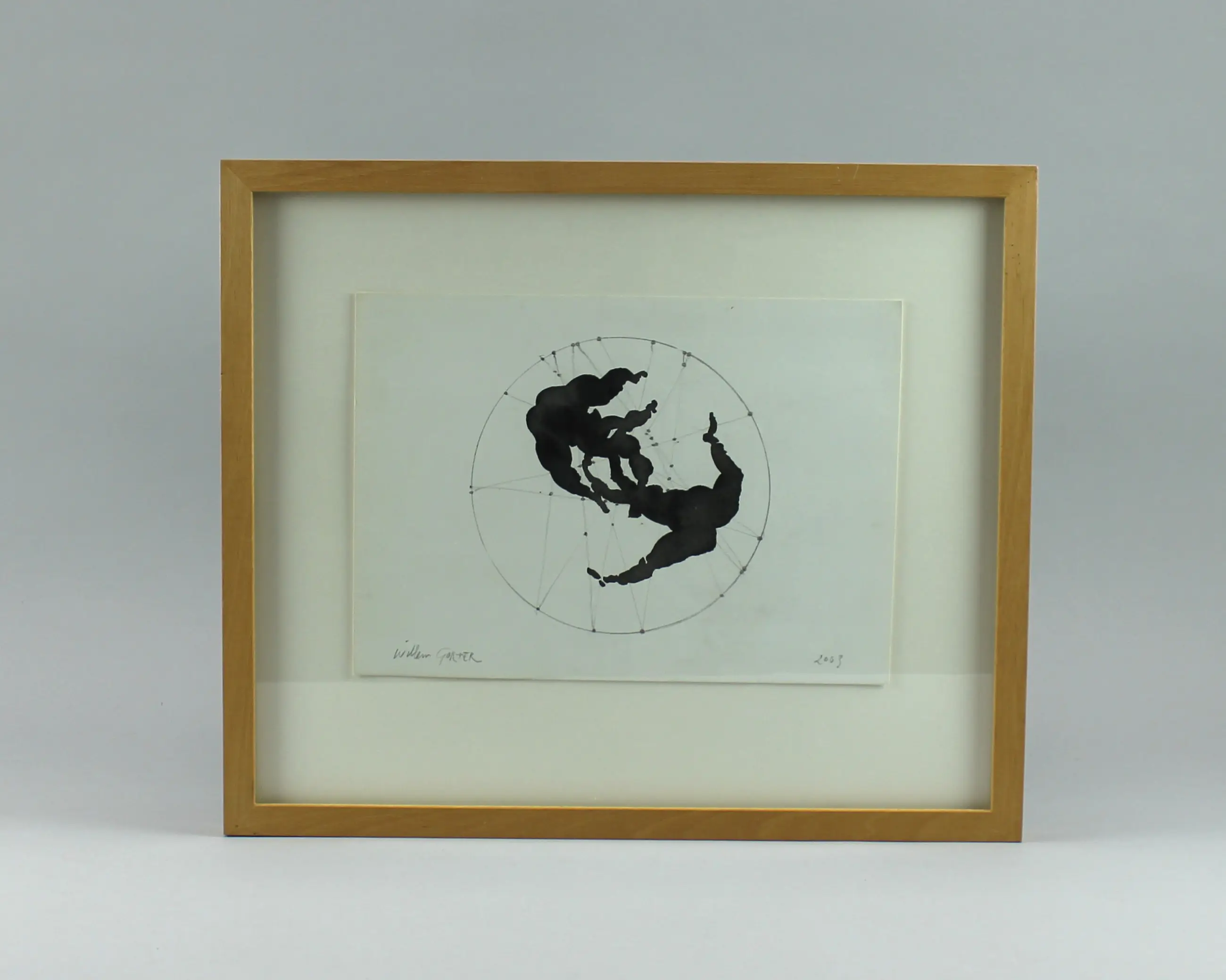 Gemengde techniek, potlood en inkt, in een naturel houten lijst.