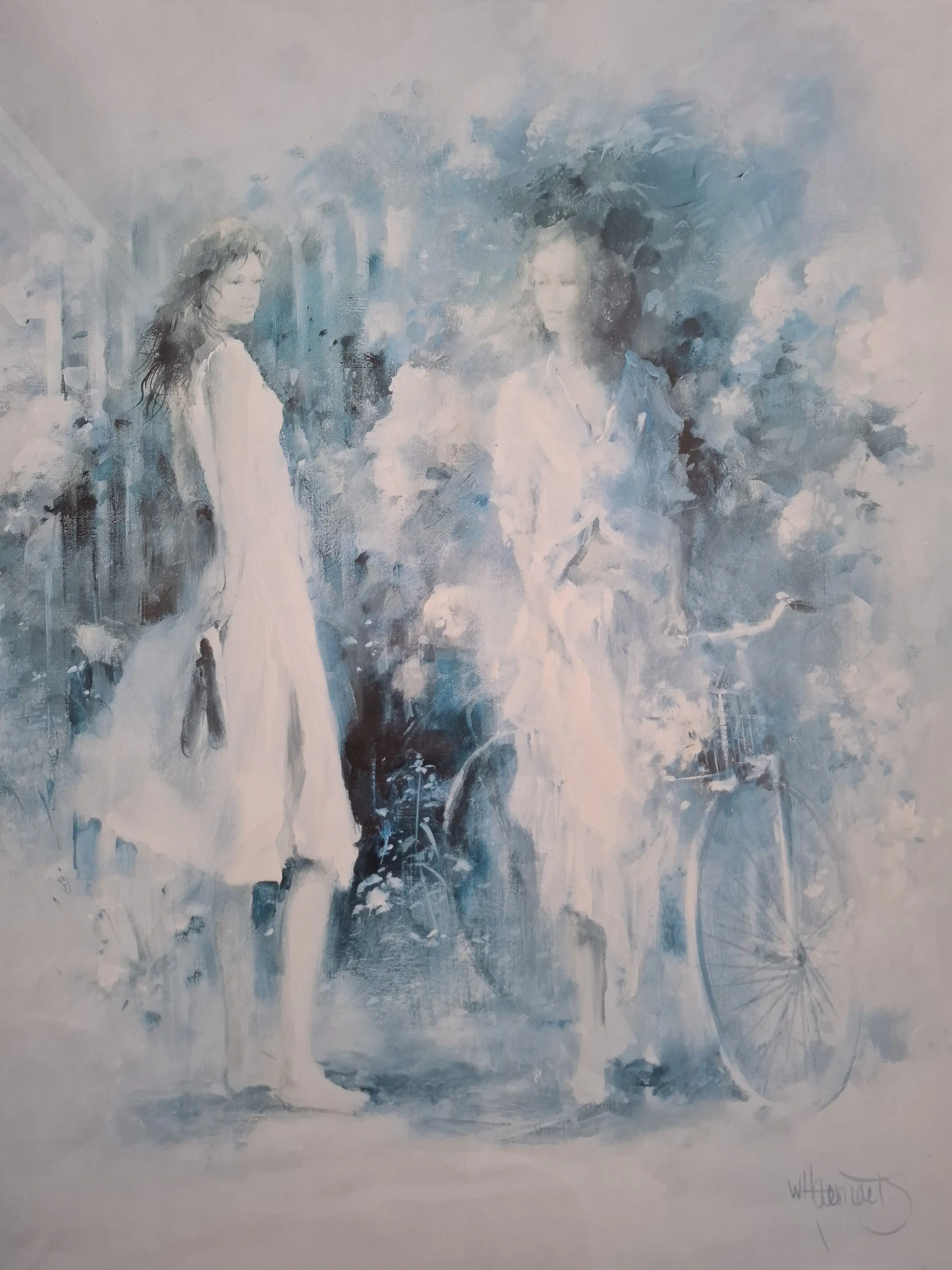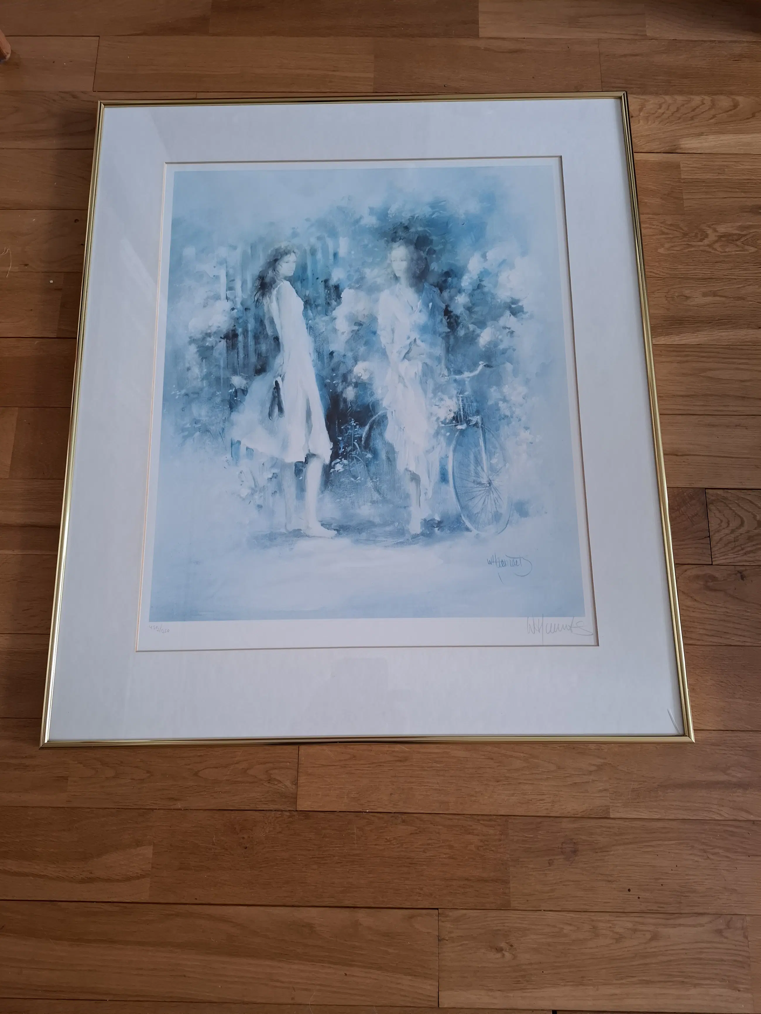 Mooi romantisch beeld van 2 vrouwen met fiets in soft blue pastel. In zeer goede staat verkerend kunstwerk dit geldt ook voor het passe partout en de lijst.