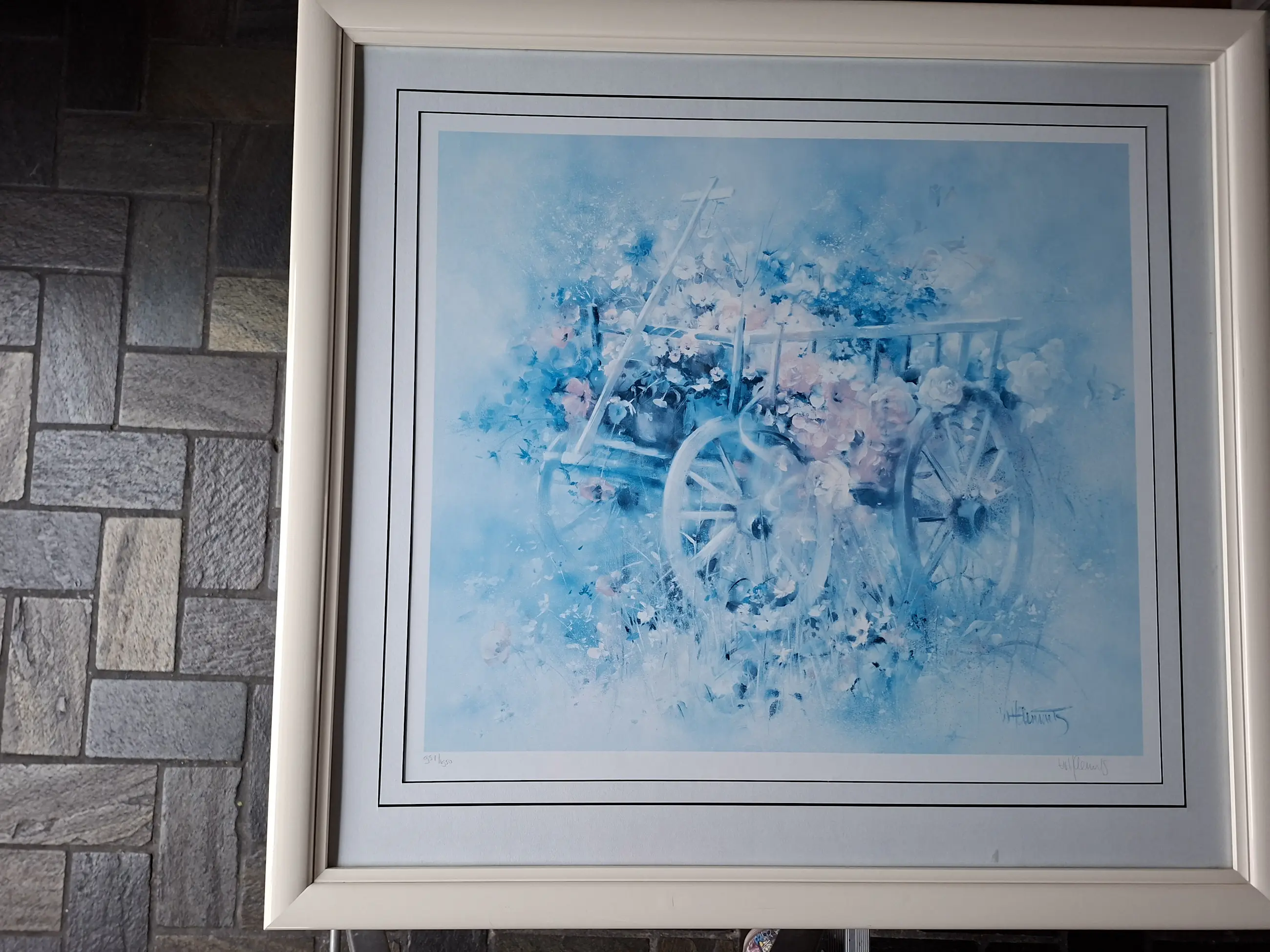 Te Koop: Grote Lithografie ; " Boerenkar met Bloemen " In 1989 op een Beurs van een Kunsthandel gekocht een Lithografie gemaakt door "Willem Haenraerts". Romantische steendruk - ong. 70 cm. breed en ong. 65 cm. hoog. Met passe - partout - ong. 90 cm x 64 cm. Het geheel is in zeer goede staat altijd op directie kantoor gehangen. Conditie dus zeer goed. Hand gesigneerd nr 951 / 1950 Alleen ophalen.