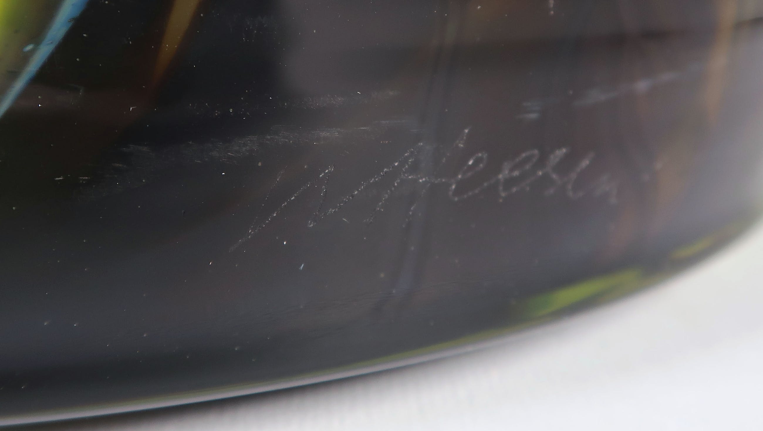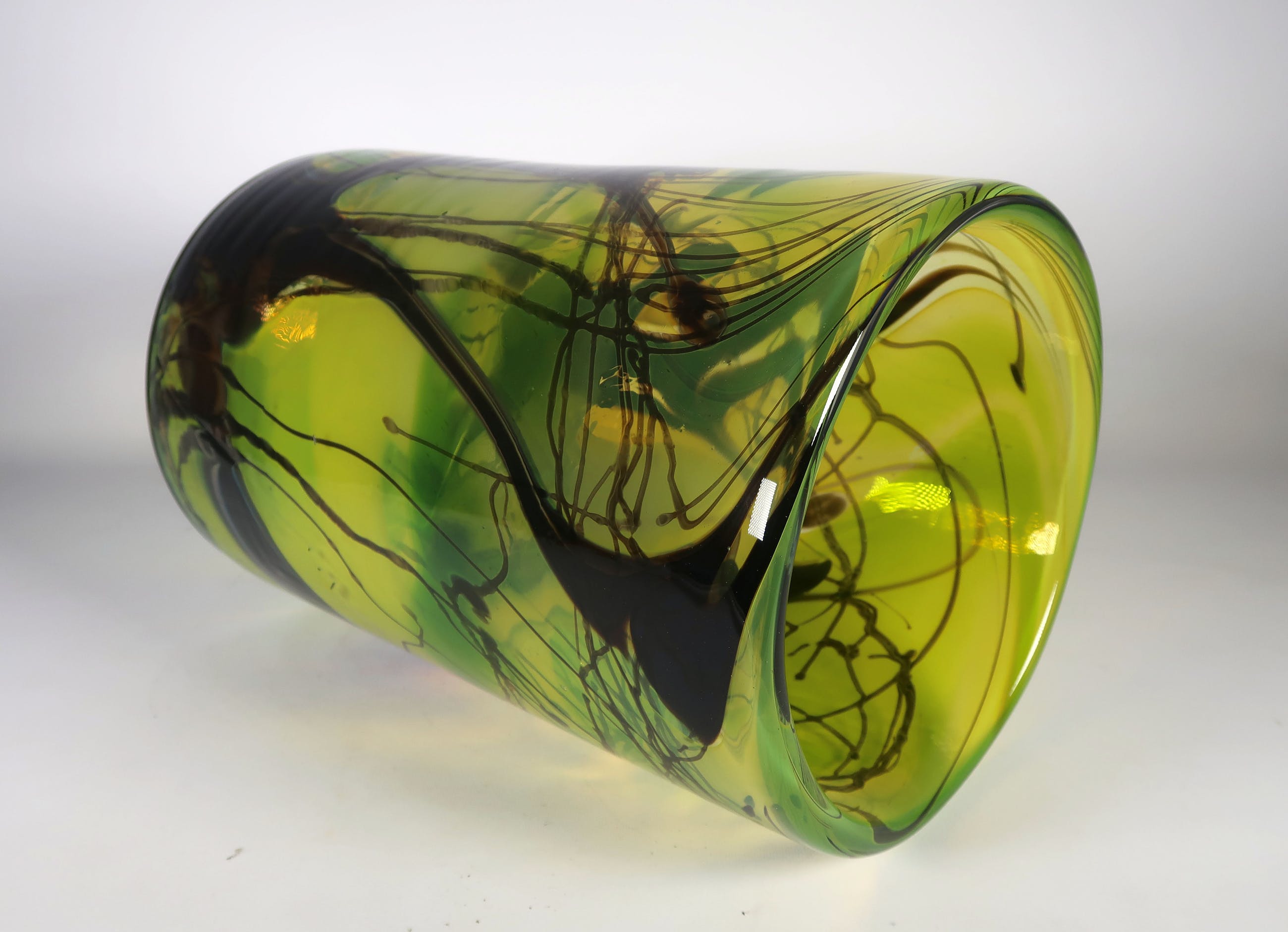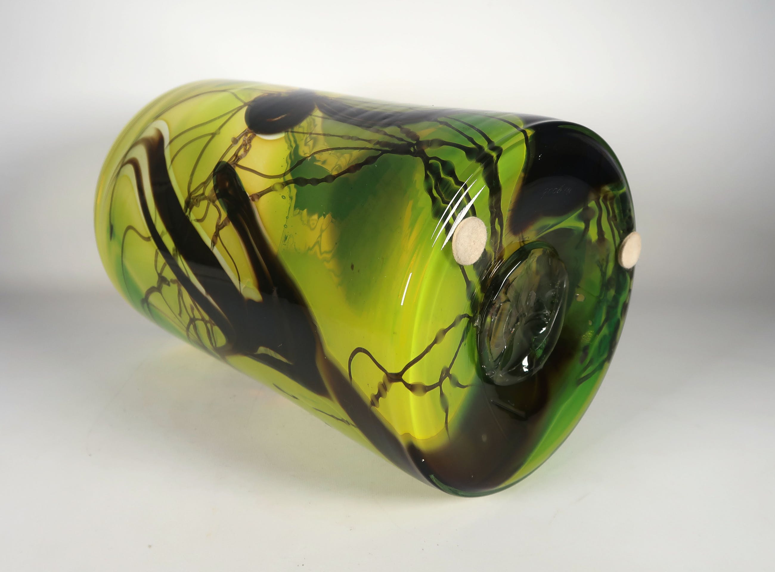 Groen met geel en zwarte glazen unica vaas, gesigneerd met: ''W Heesen 900614''