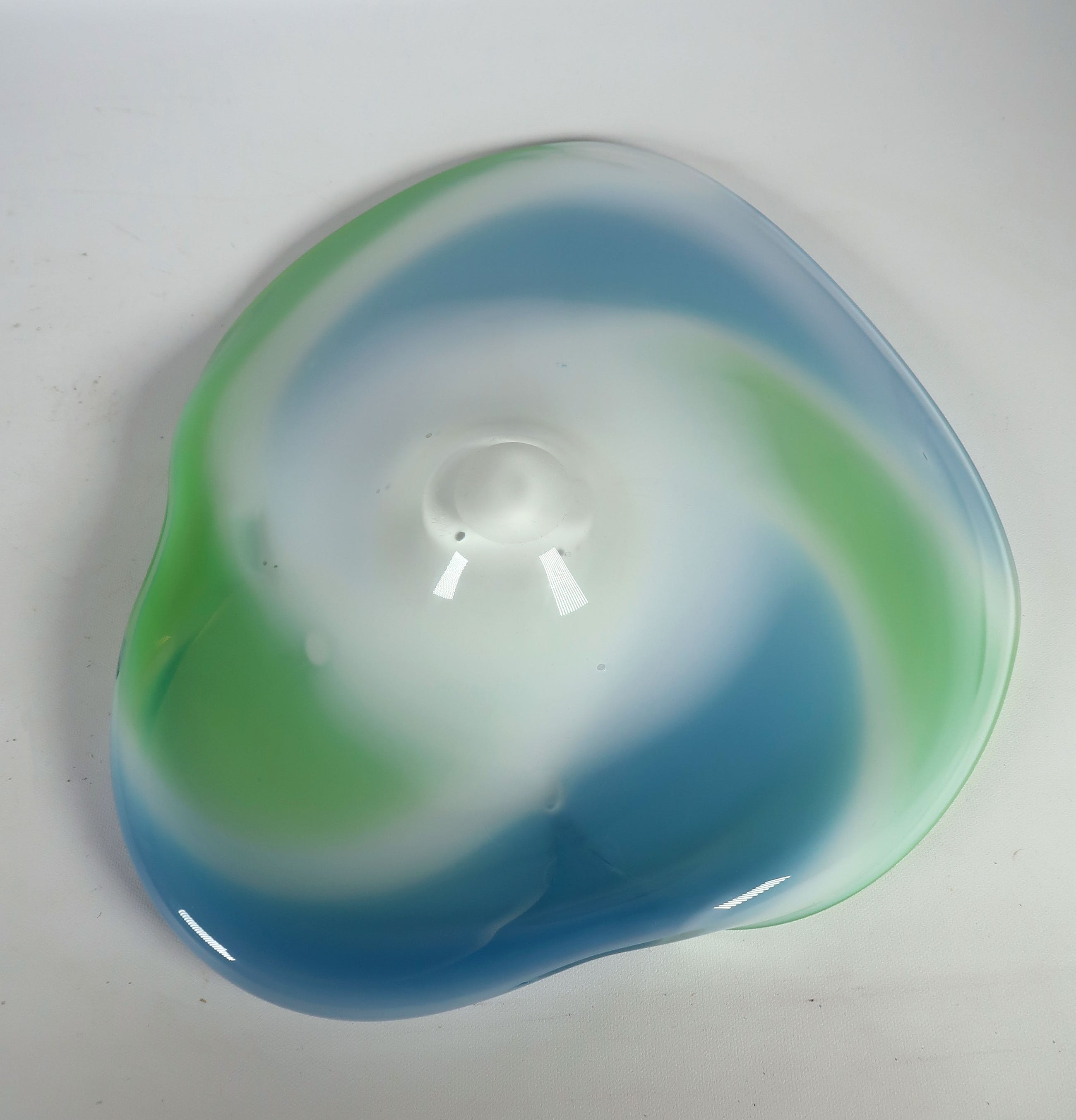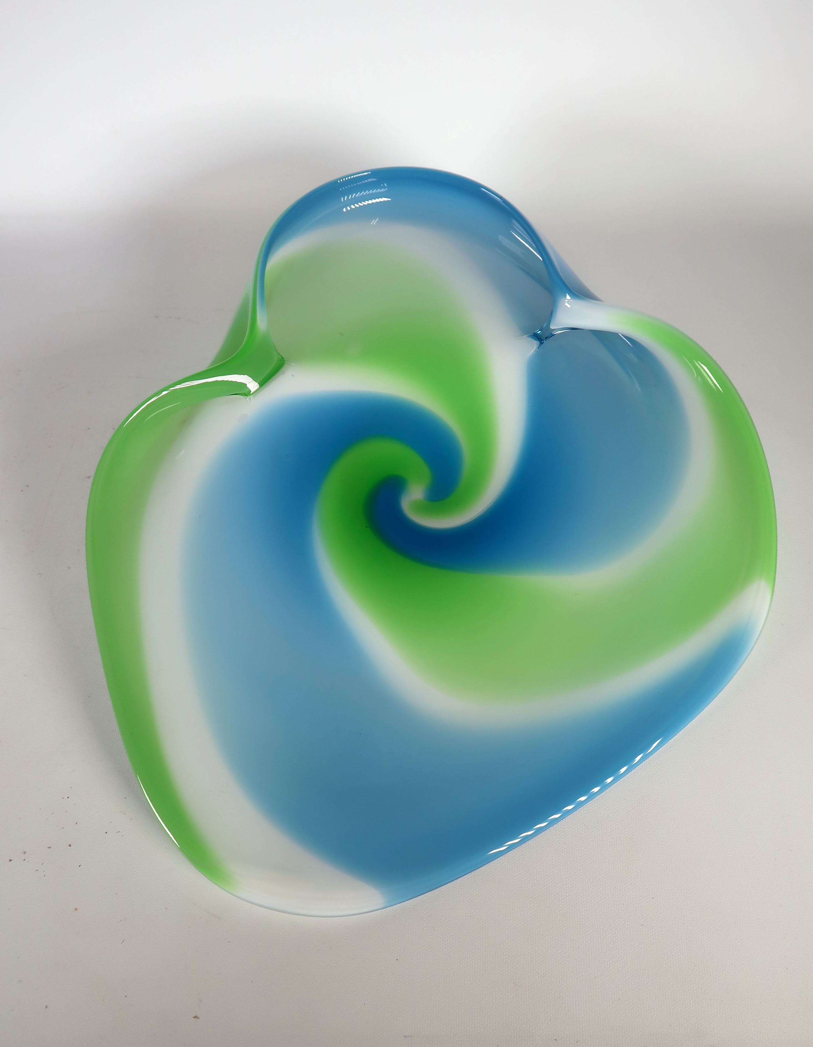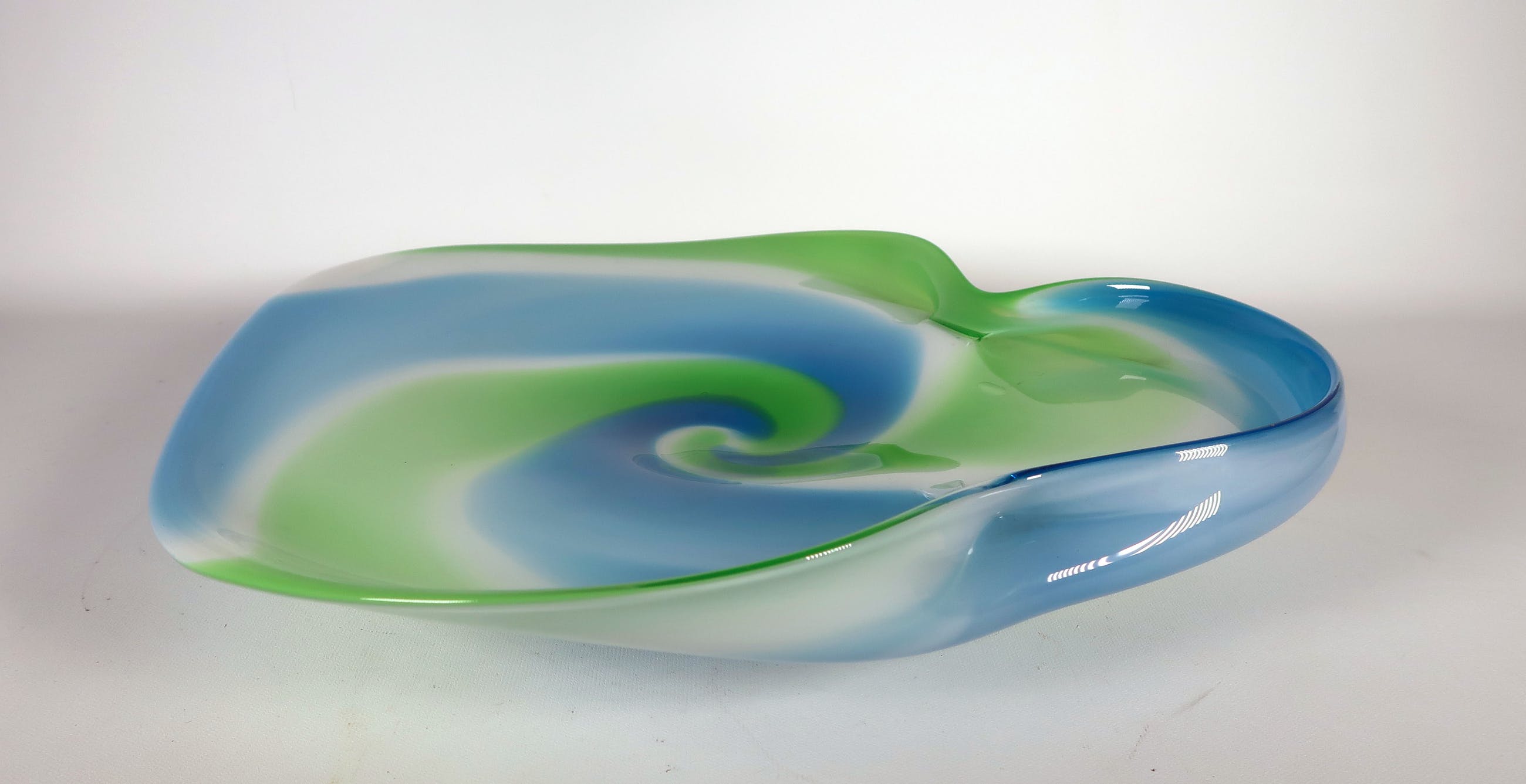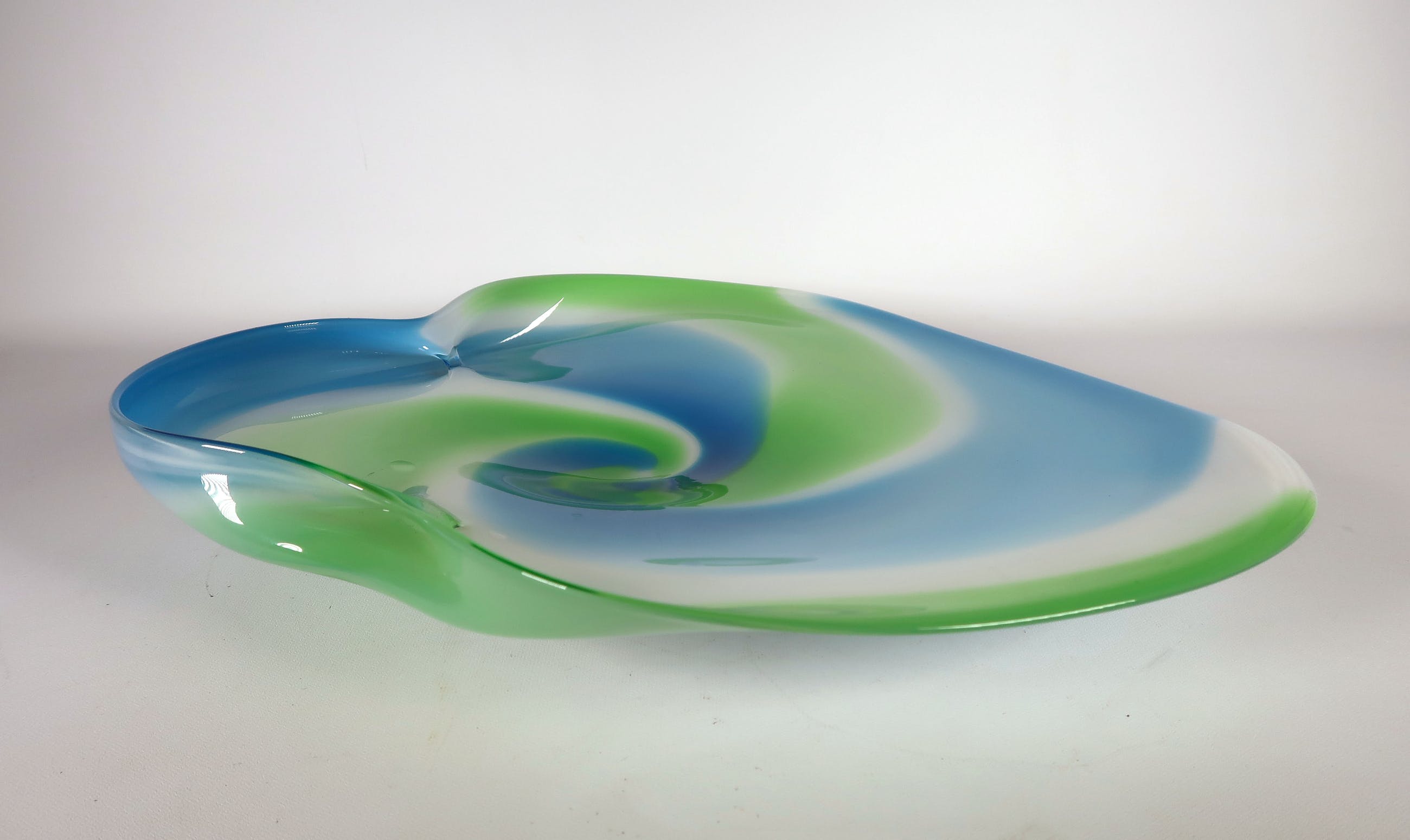 Blauw, wit en groen glazen unica schaal met spiraalvorm, gesigneerd met: ''W Heesen Oude Horn 911133''