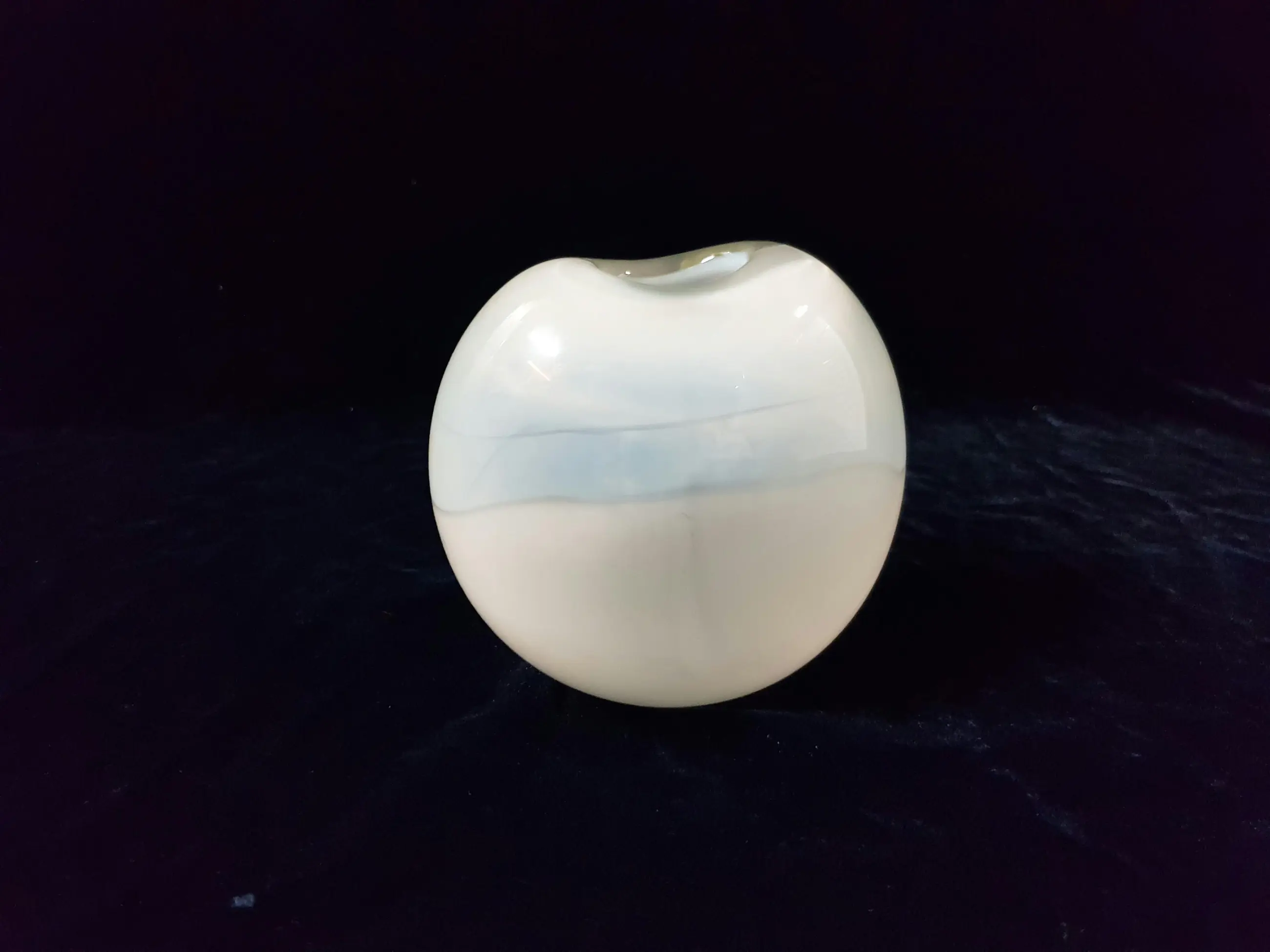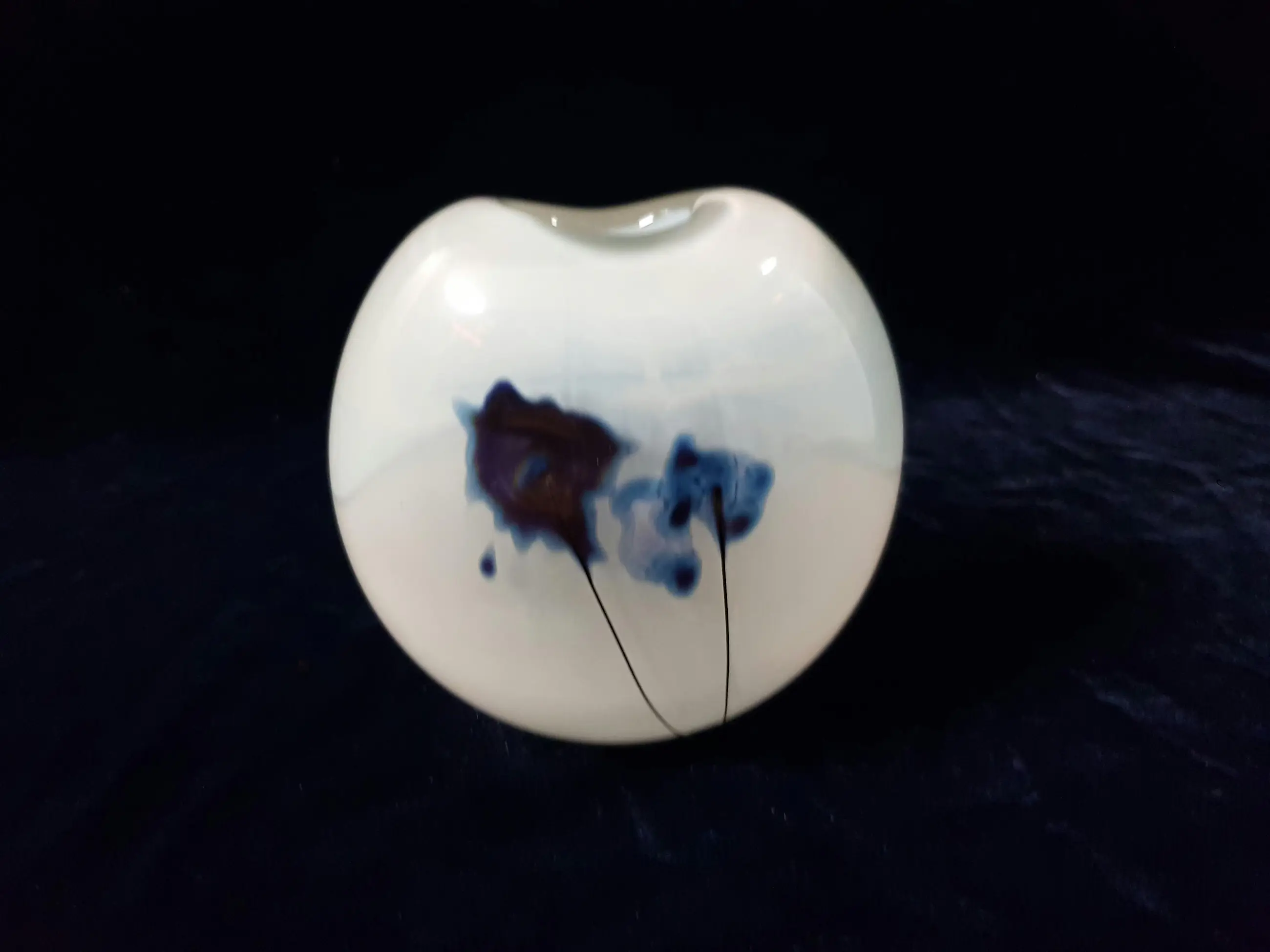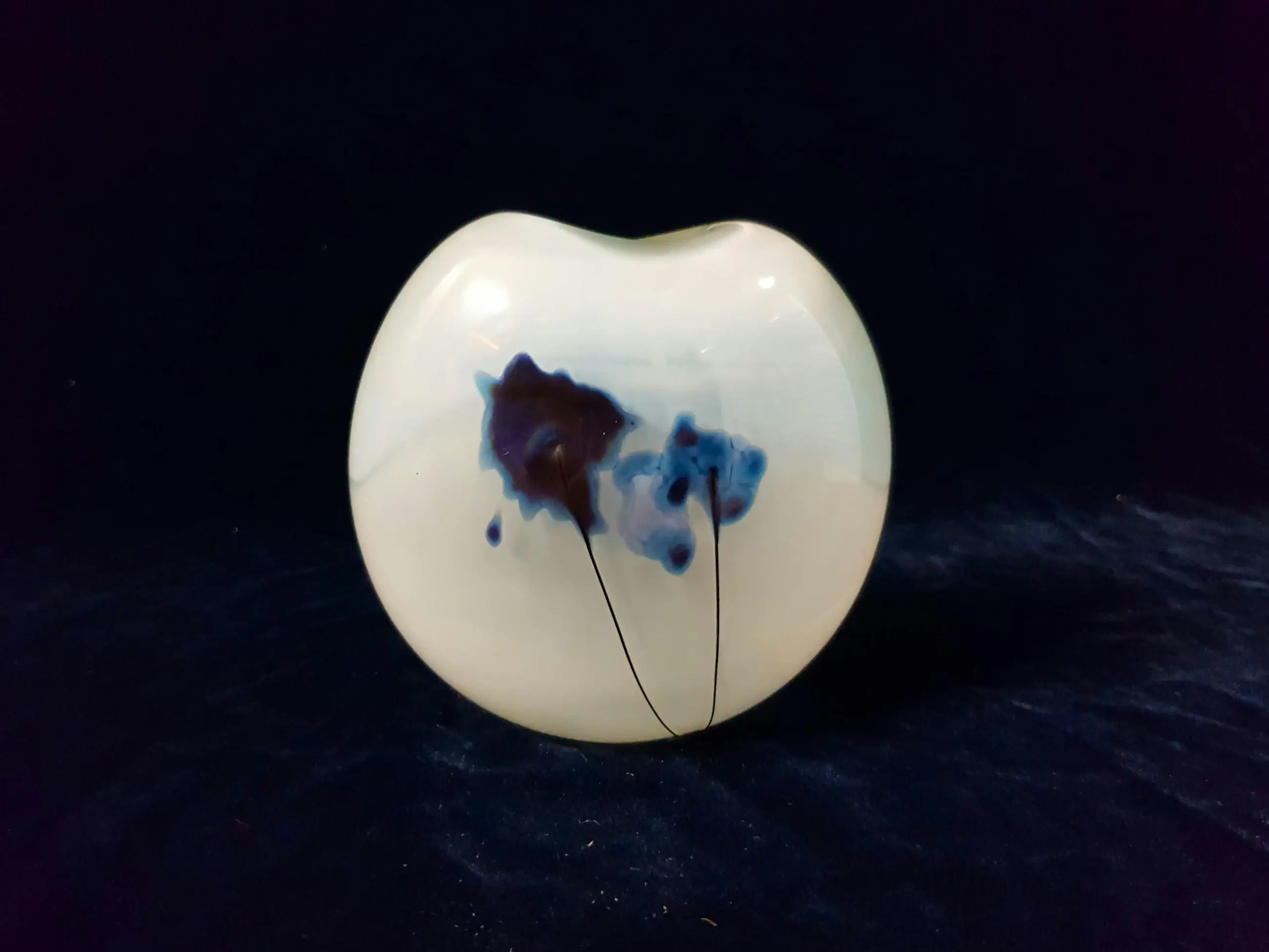 Materiaal: Opaalglas (melkglas) met een abstracte, landschappelijke decoratie van blauwe en bruine glasmoisels, gecombineerd met de voor Heesen typerende fijne zwartgetrokken glasdraden.