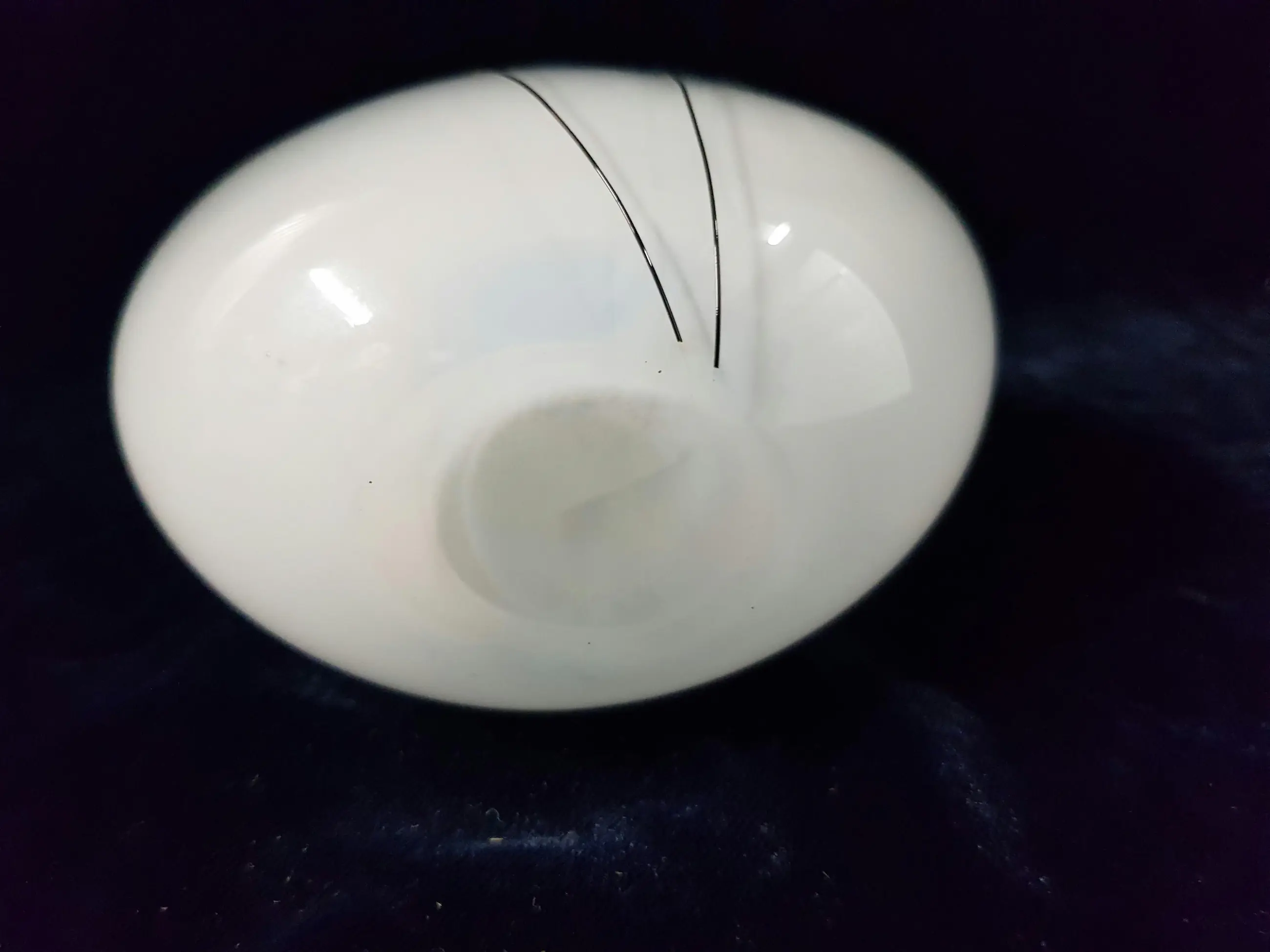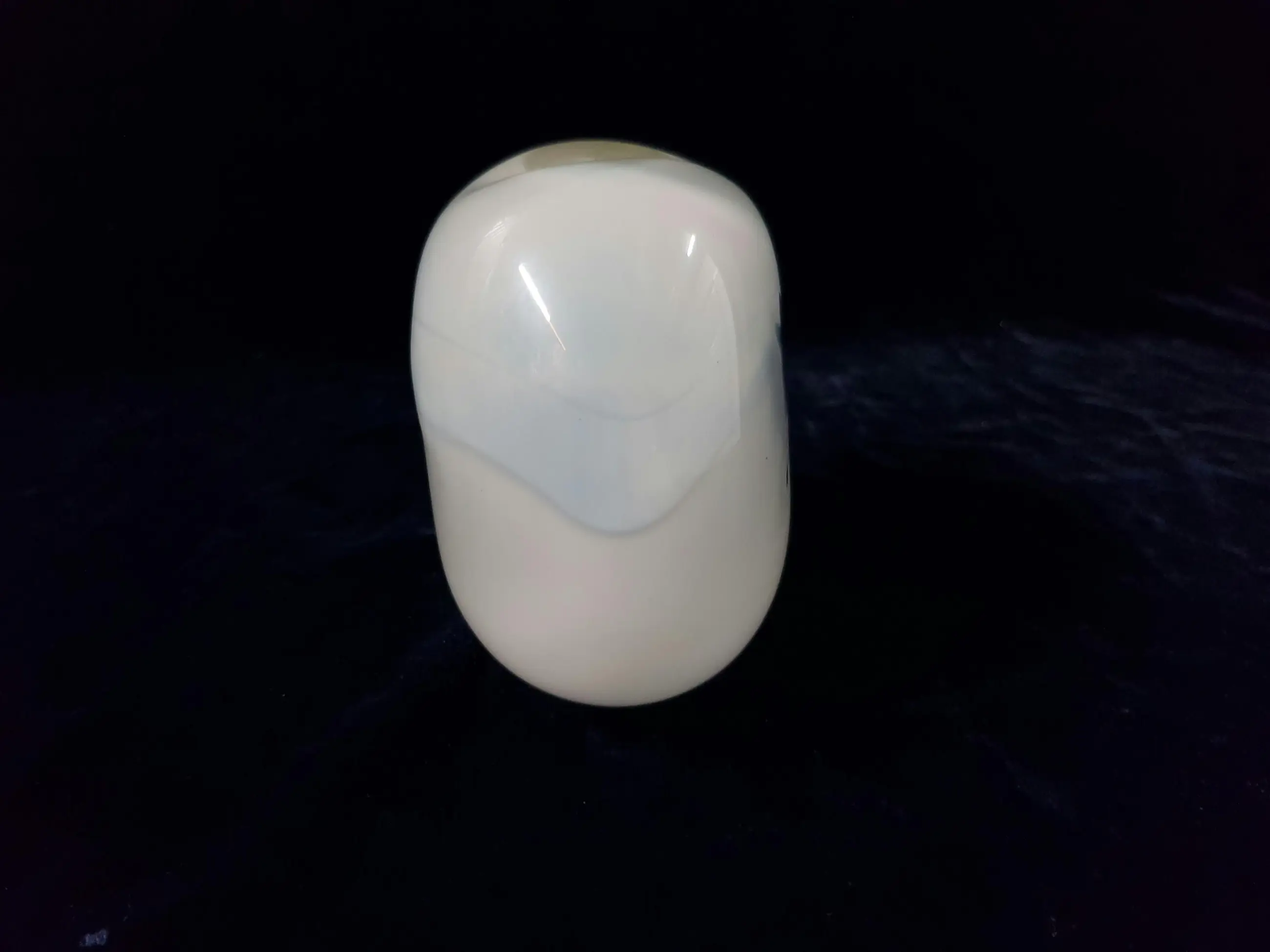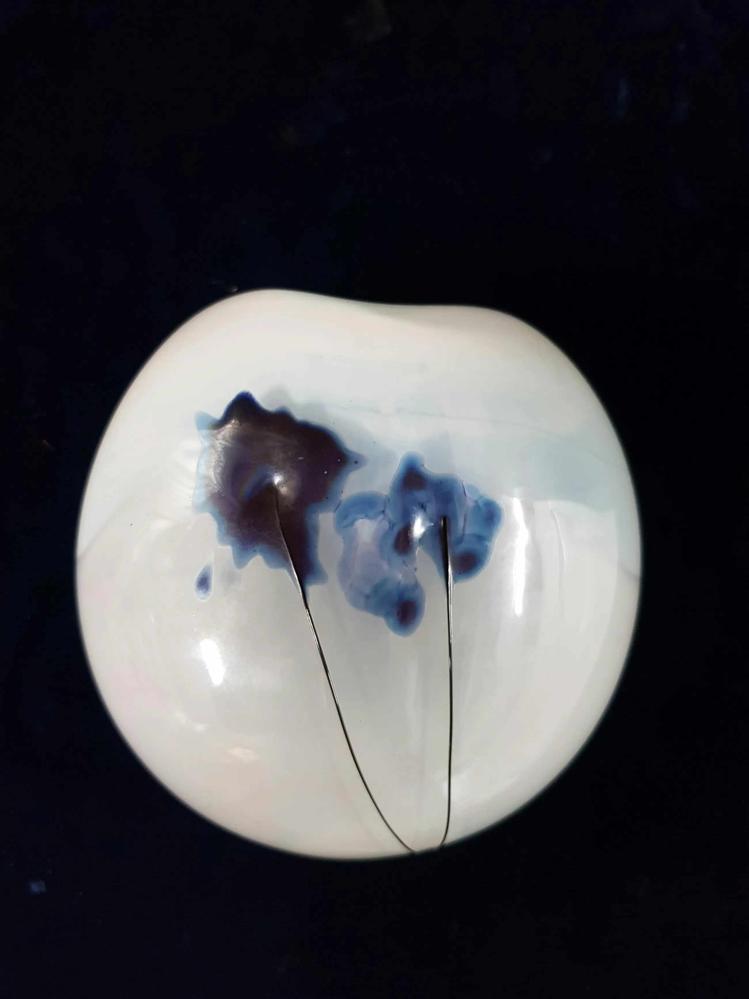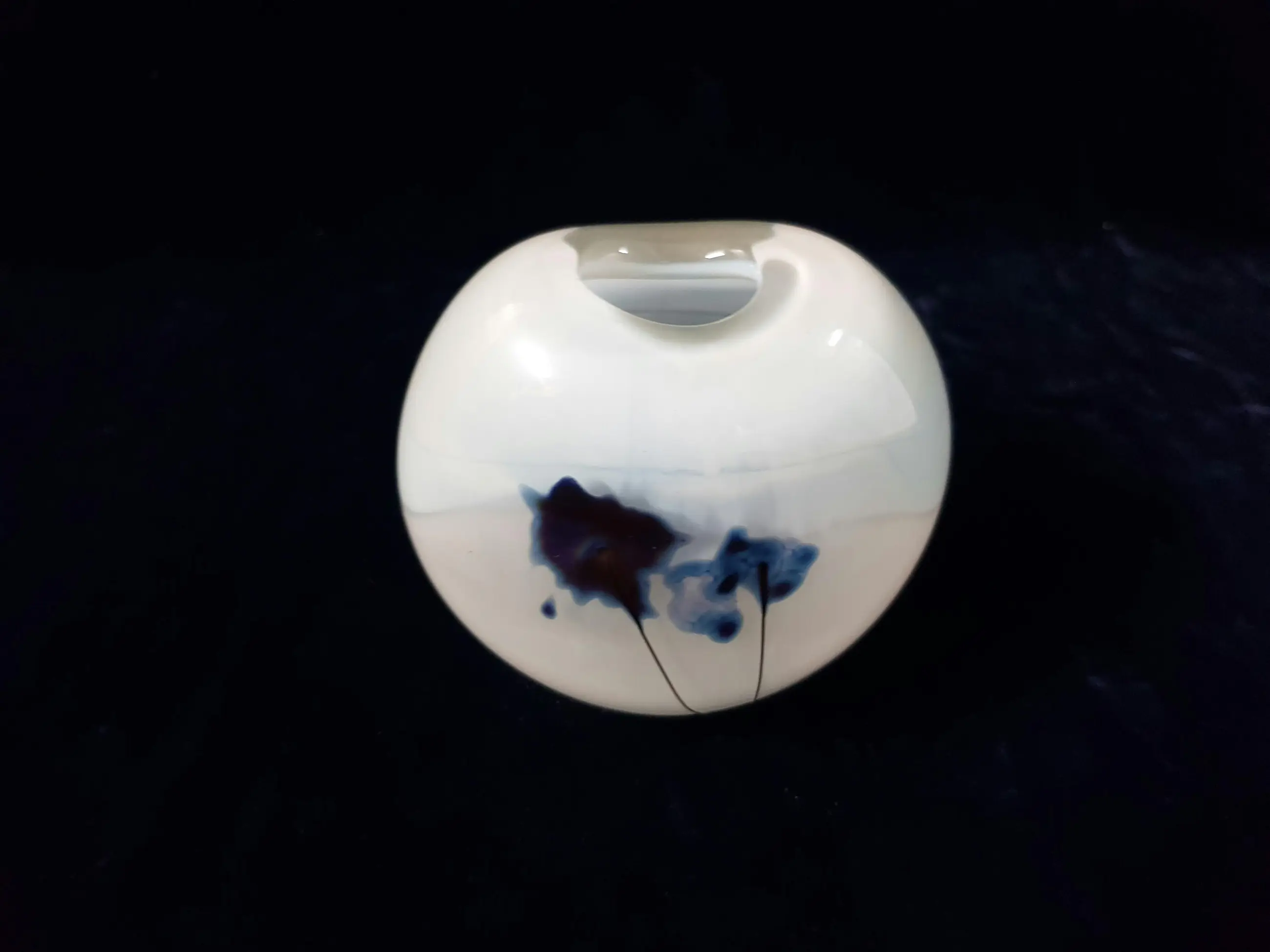 Materiaal: Opaalglas (melkglas) met een abstracte, landschappelijke decoratie van blauwe en bruine glasmoisels, gecombineerd met de voor Heesen typerende fijne zwartgetrokken glasdraden.