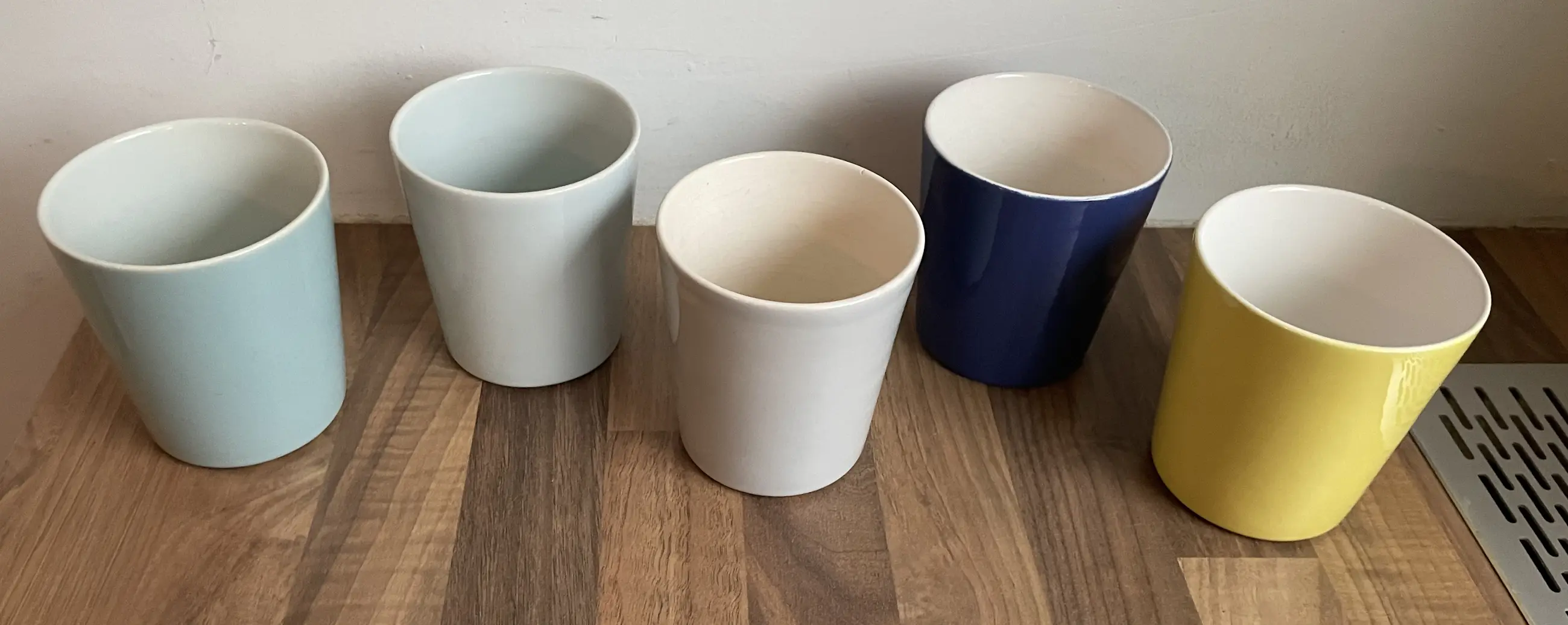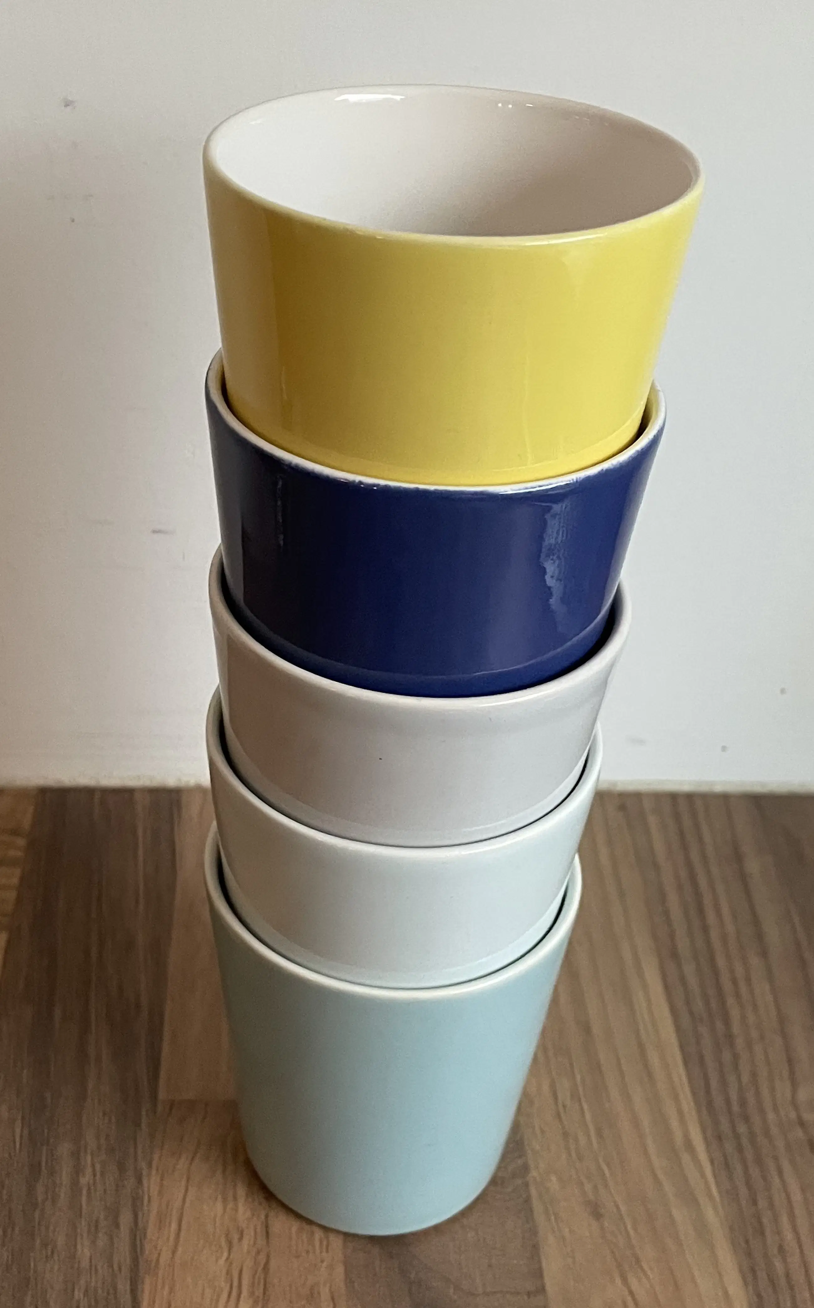 Alle vijf in perfecte conditie, voorzien van een blindmerk aan de onderkant en in vijf verschillende kleuren;