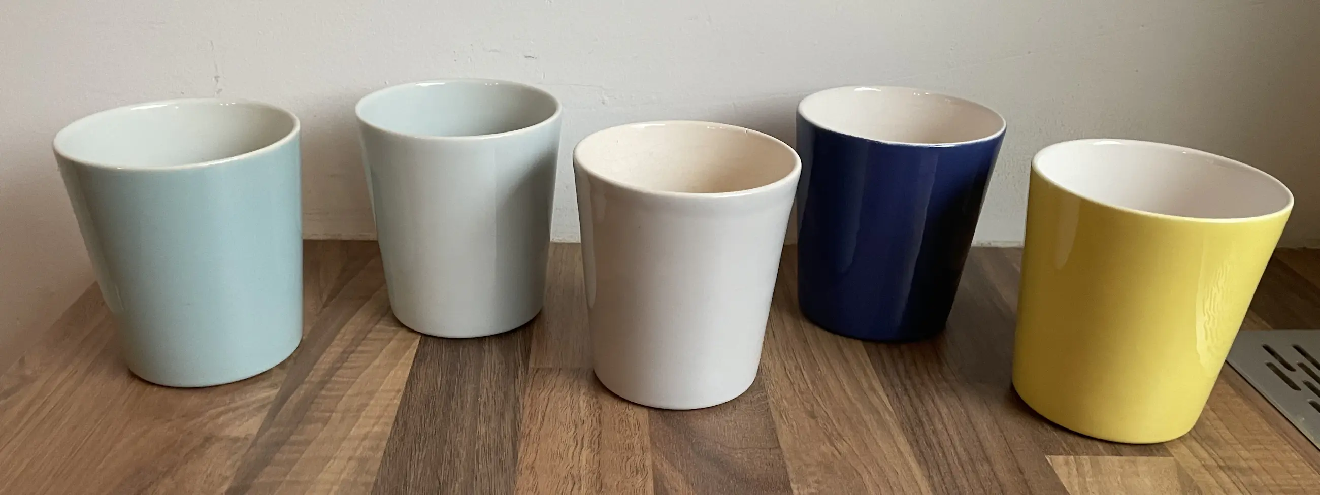 Vijf vintage aardewerken melk of koffiebekers van Fris Edam - ontwerp W.H. De Vries.