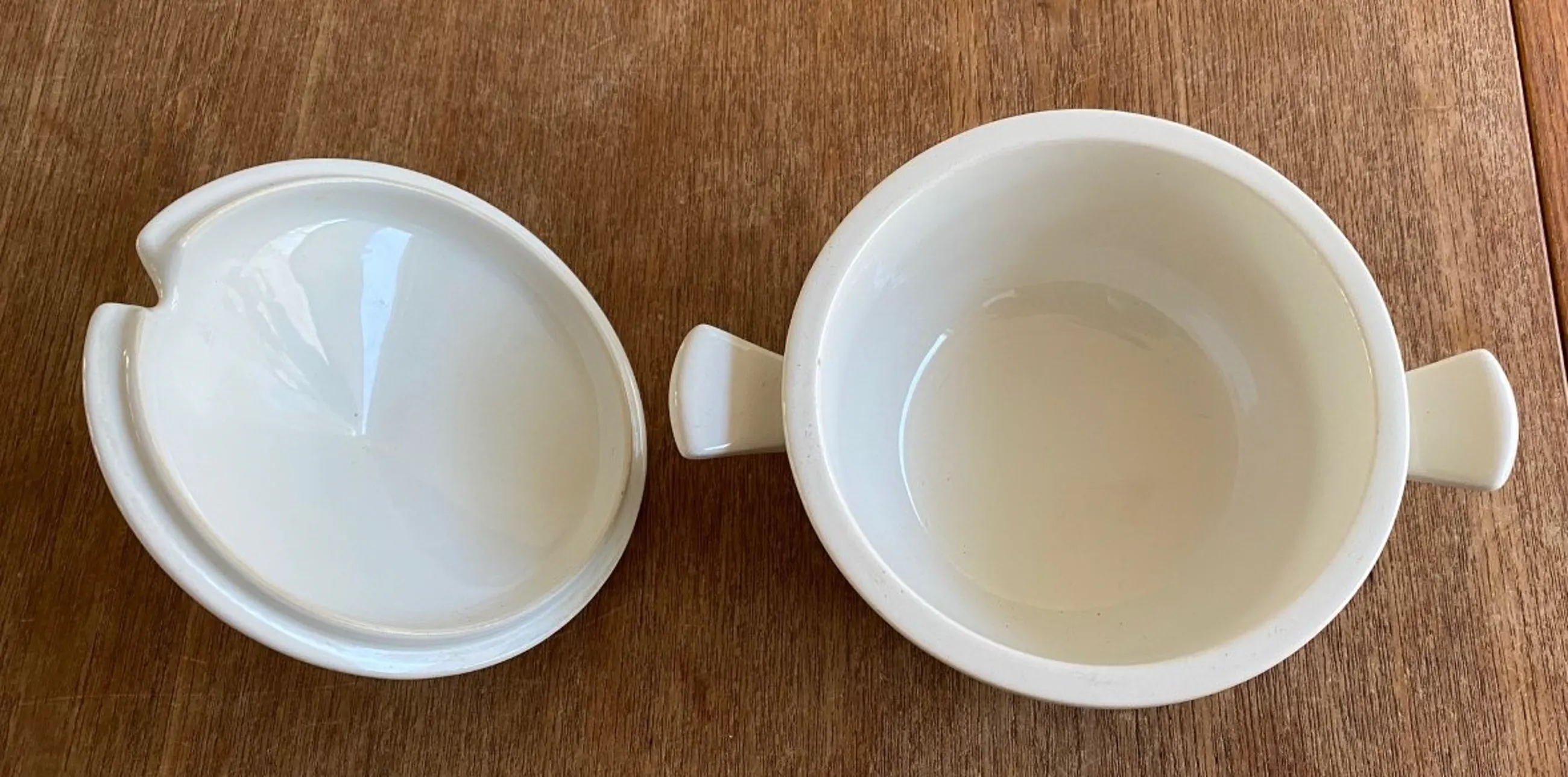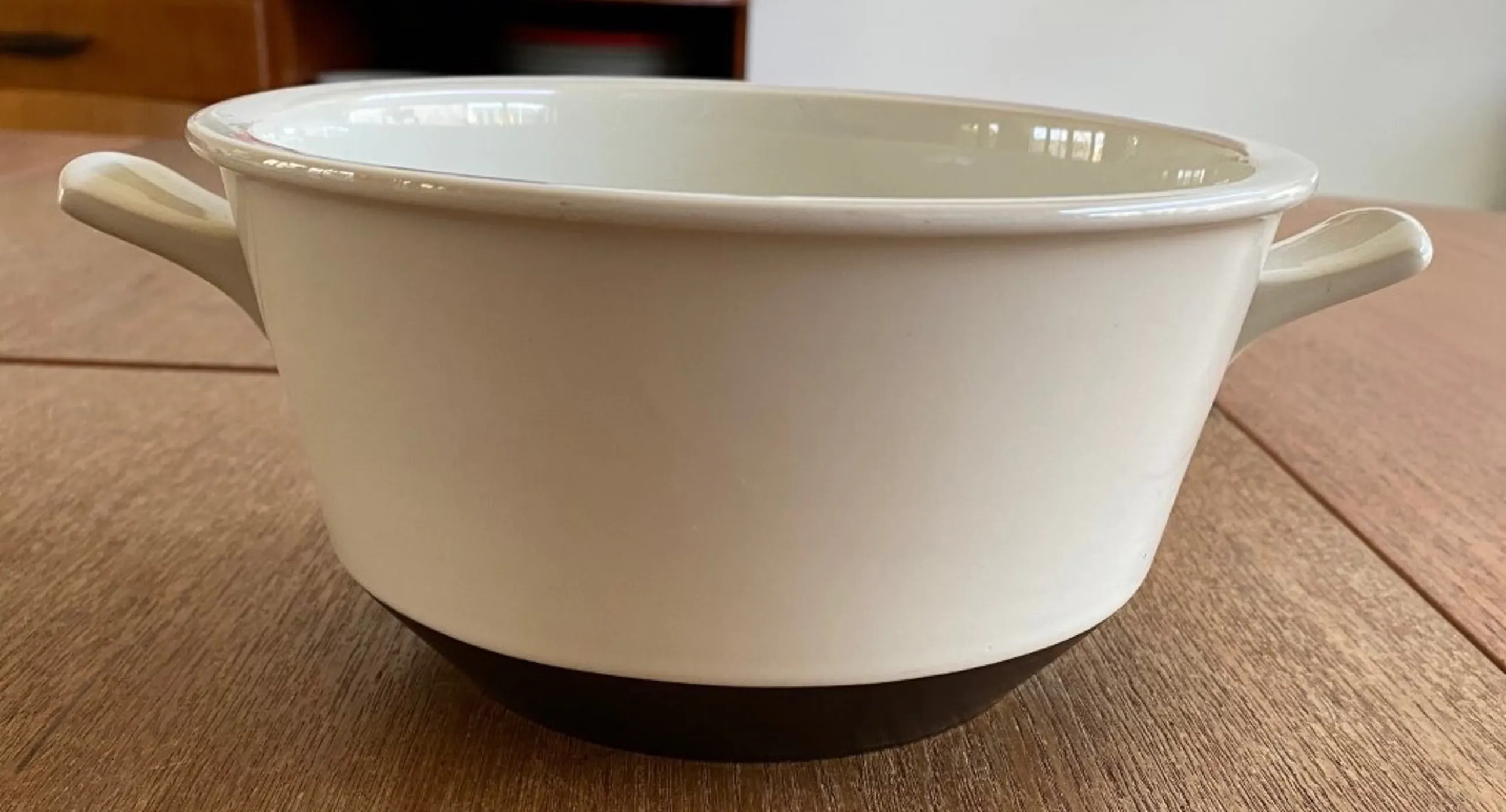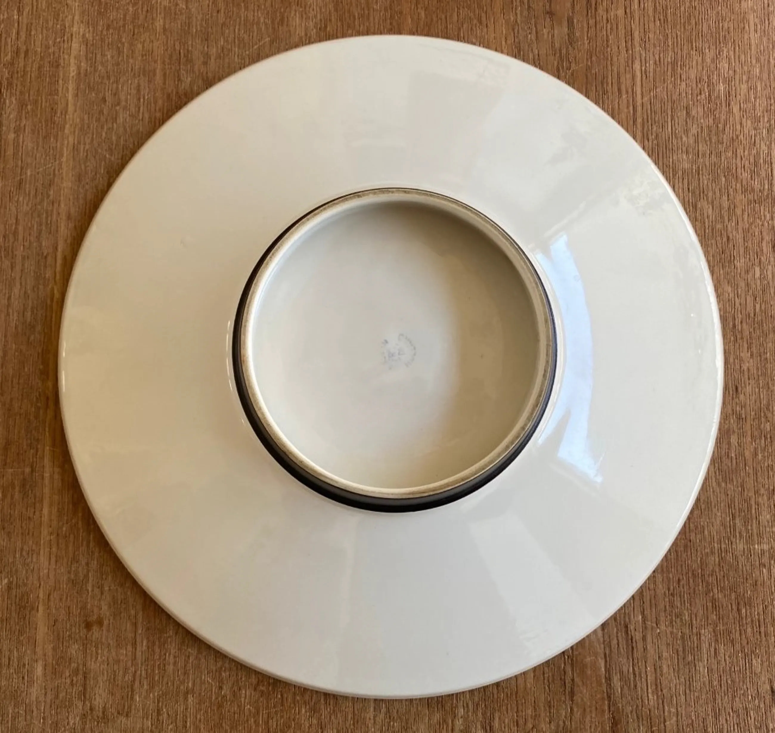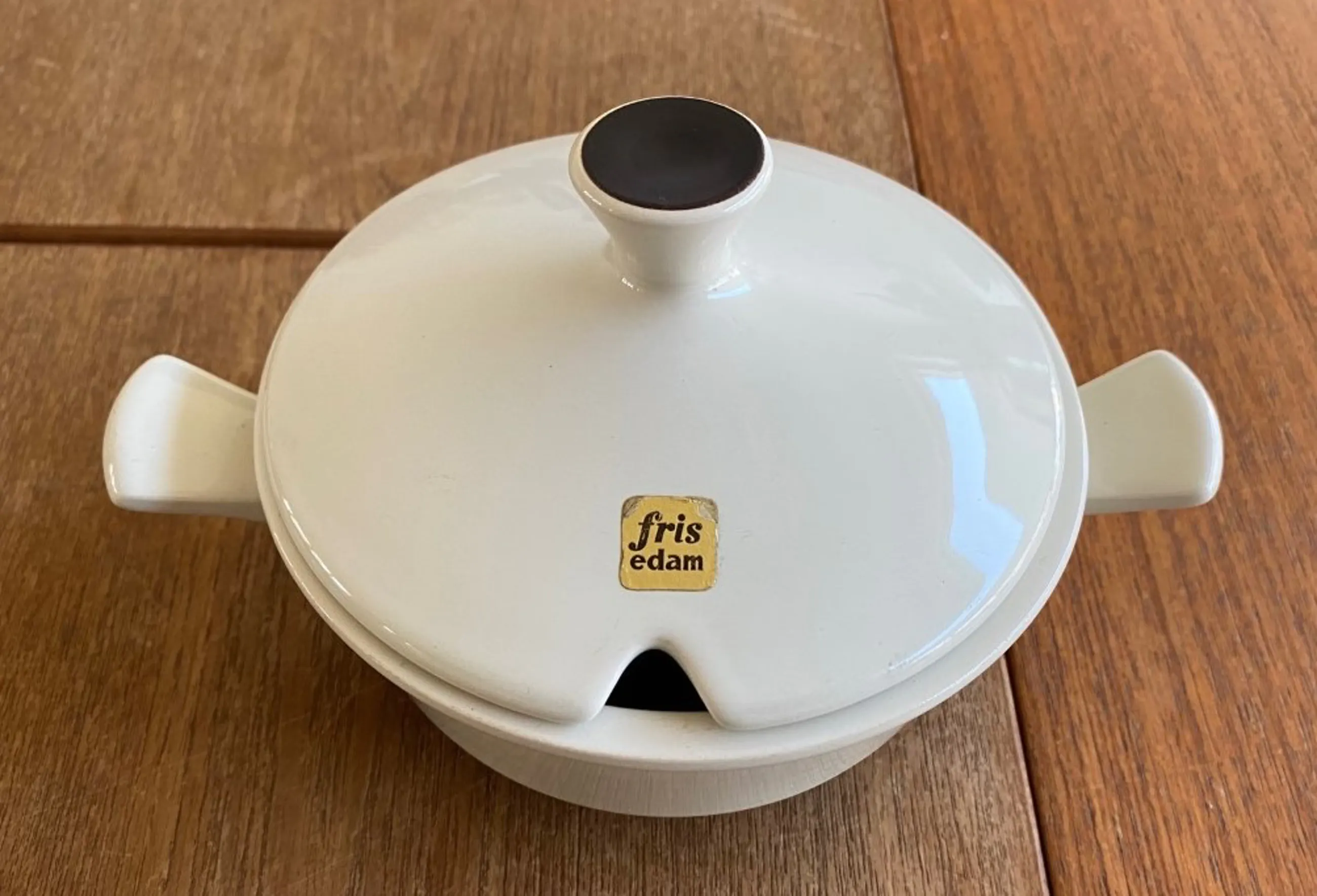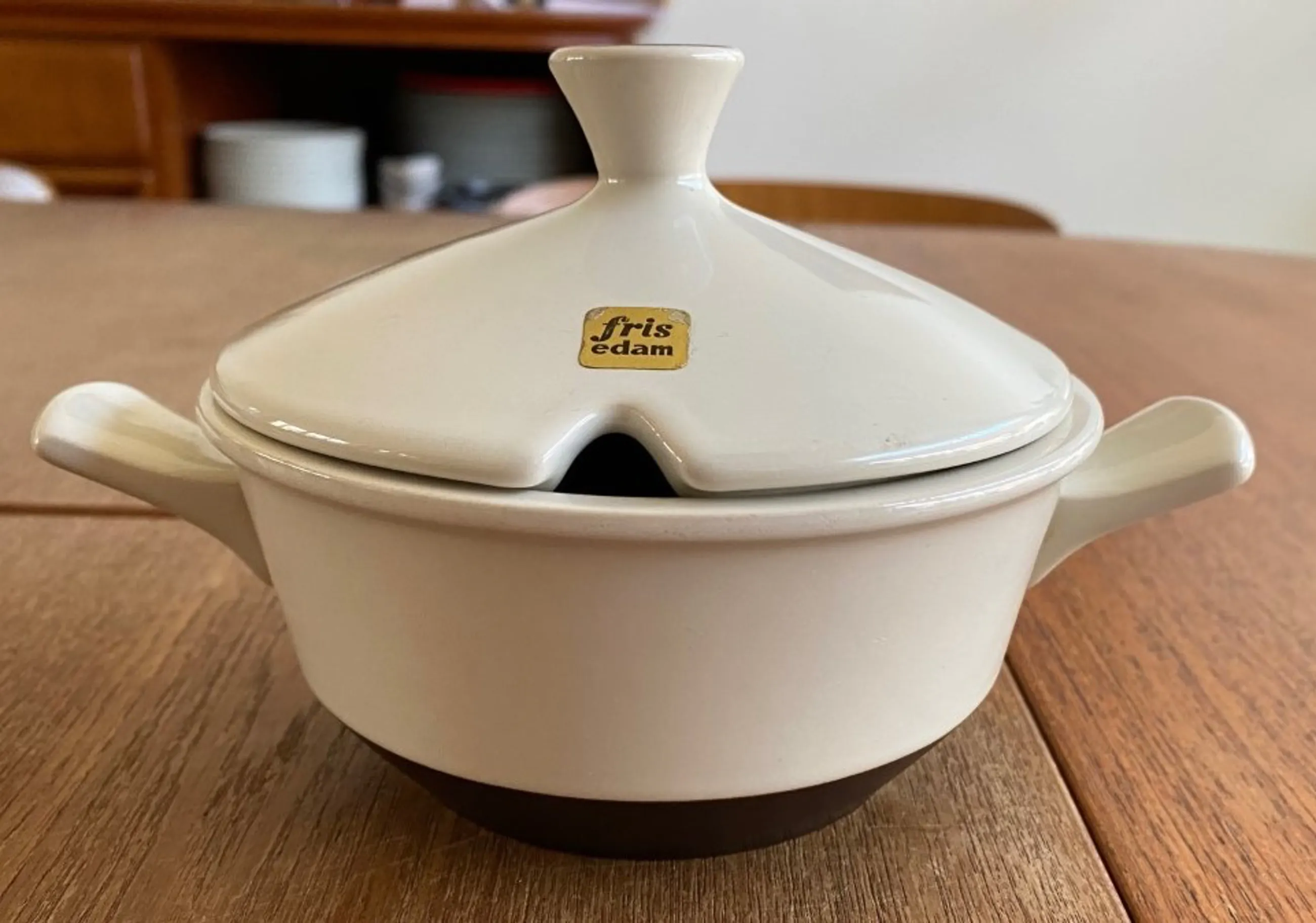 Serviesdelen Jubilant uitgevoerd in ivoor-mat bruin ontwerp W.H. de Vries voor Fris Edam uit 1959. Het betreft een fruitschaal/cakeschaal/suikerpot/2x aardappel of groente schaal/3 x grote serveerschaal/ 2x kleine serveerschaal.