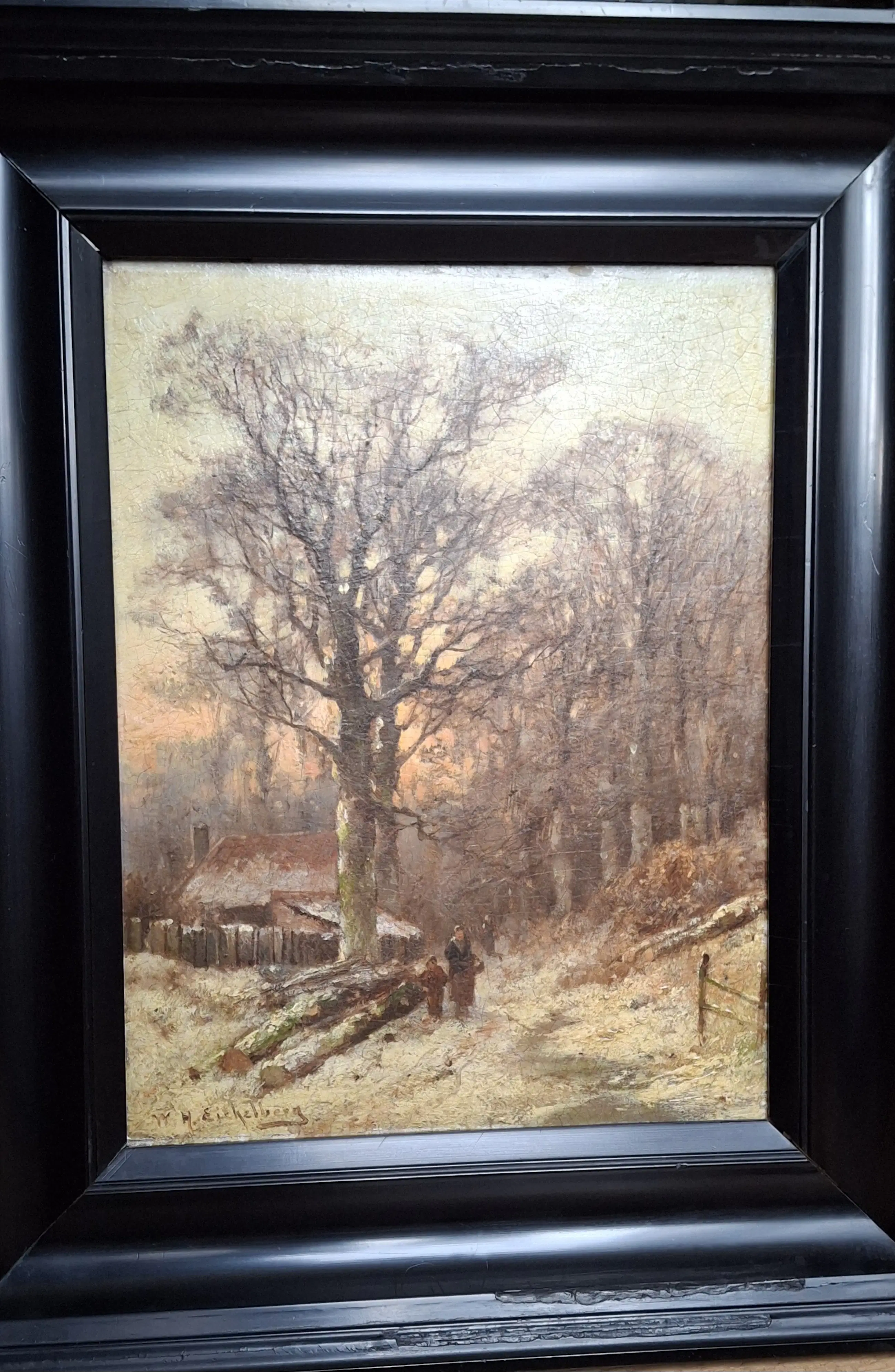 Olieverf op houten paneel. Een winter tafereel van een huisje in het bos met ondergaande zon. Is ingelijst. De lijst heeft gebruikerssporen maar kan men makkelijk verwijderen en eventueel vervangen.