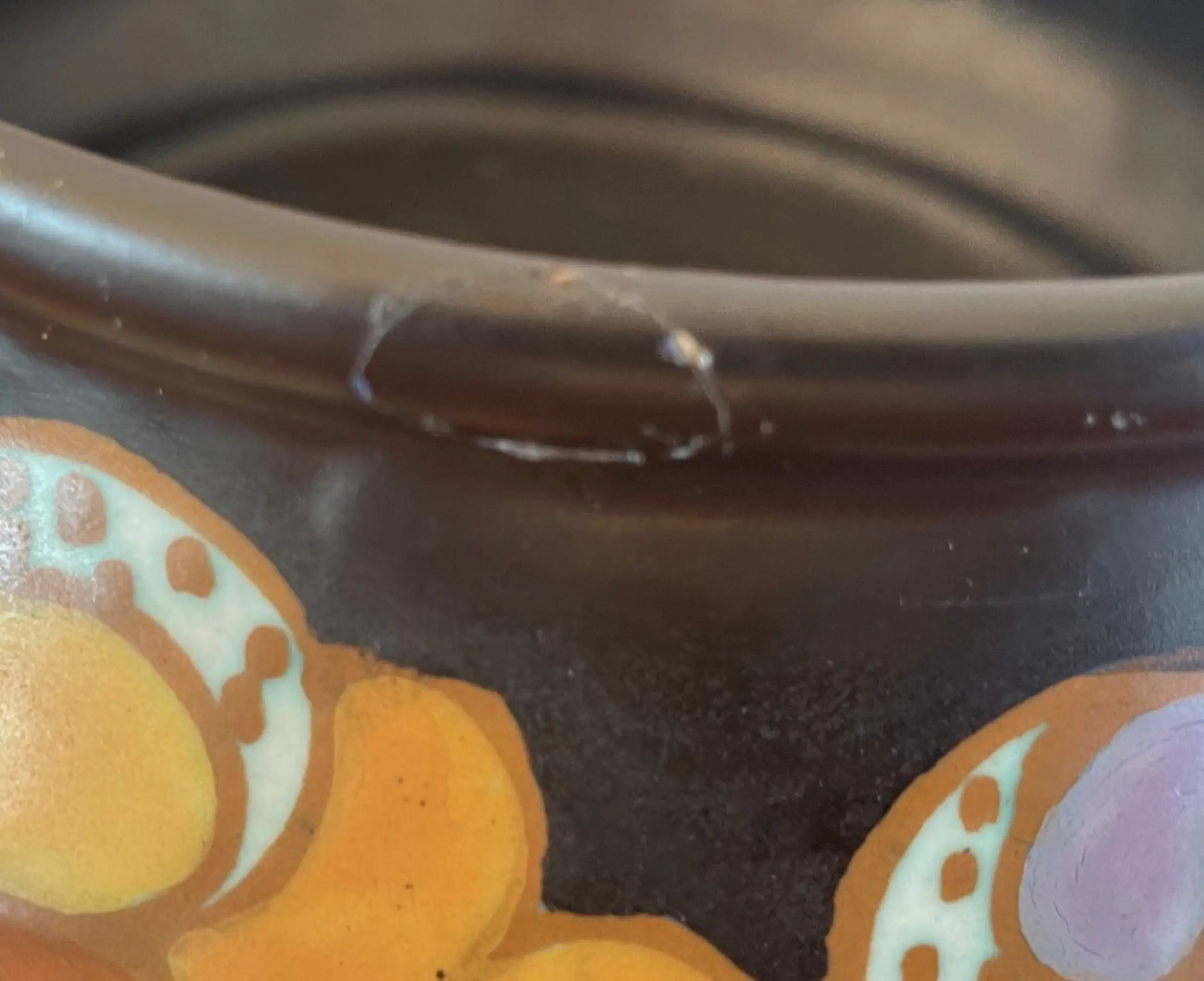 De jardiniere heeft een gerepareerde chip aan de zijkant. Verder in goede conditie.