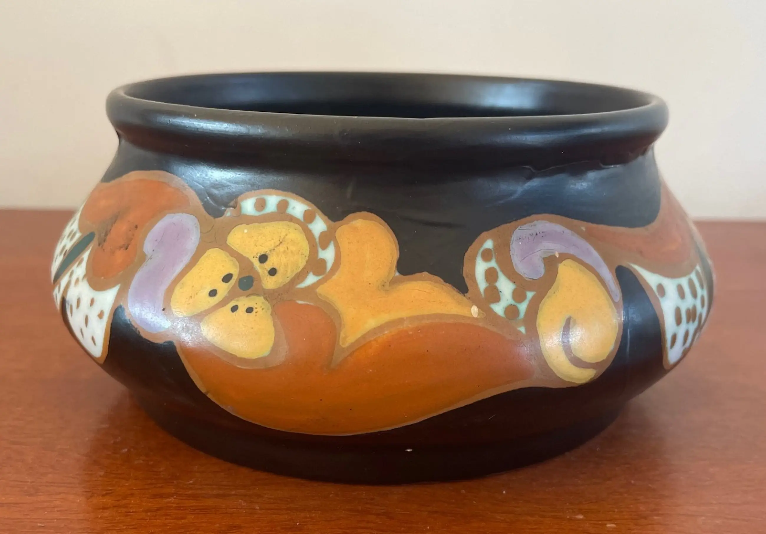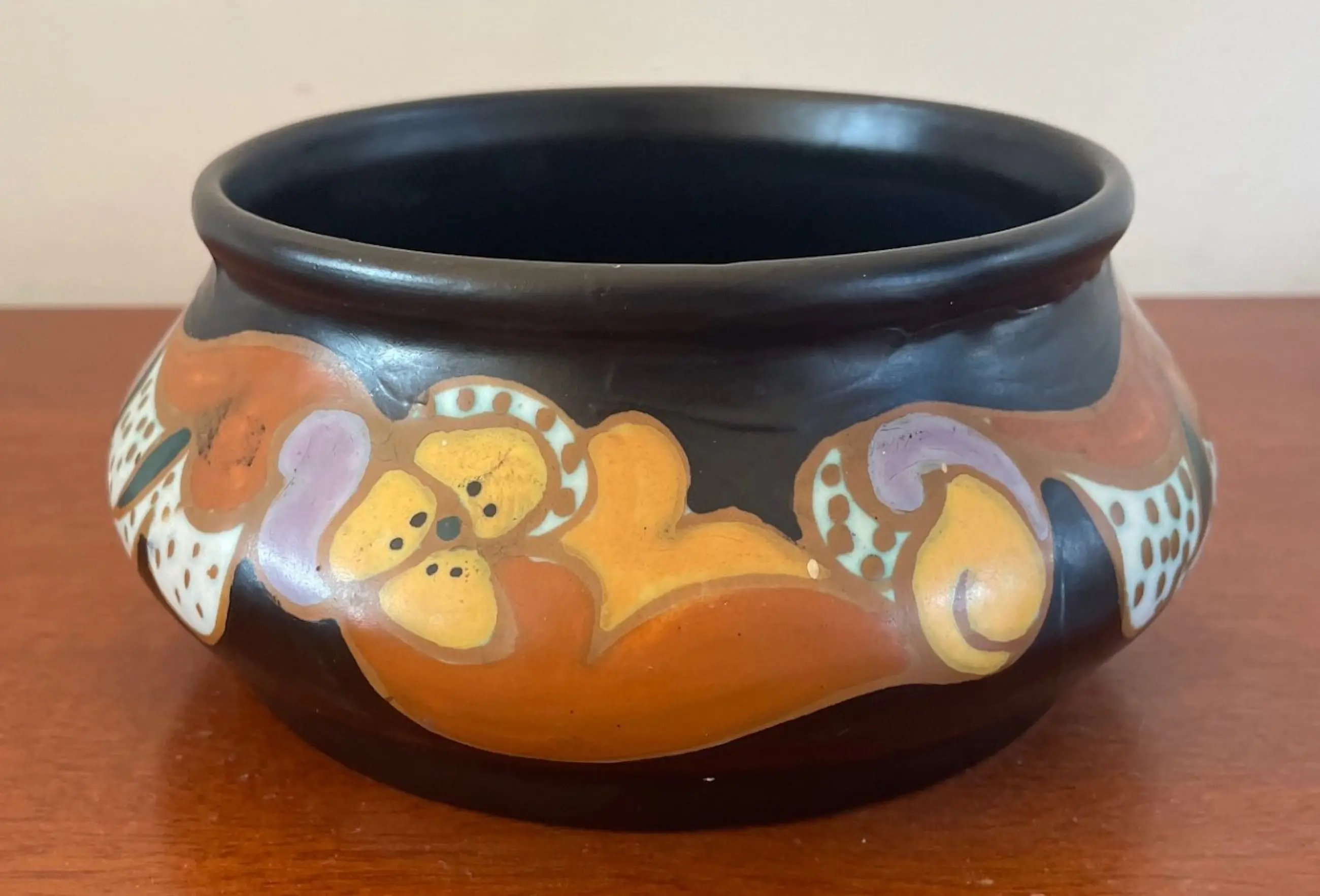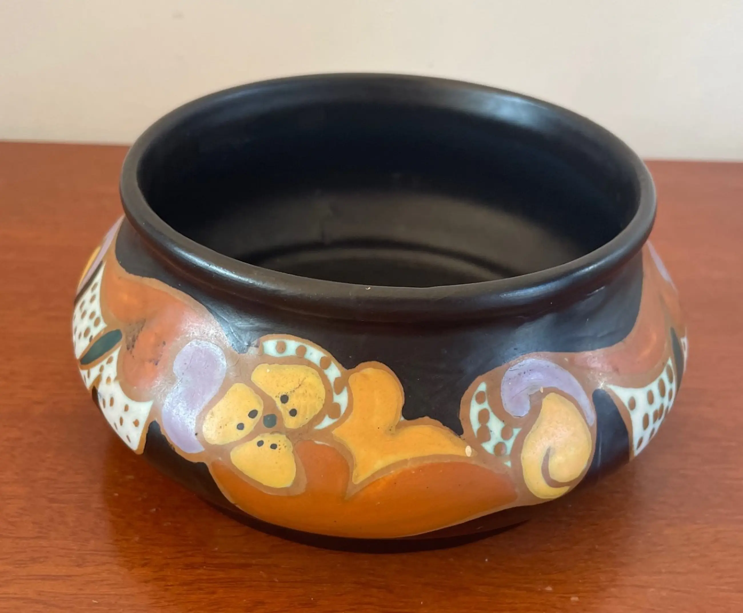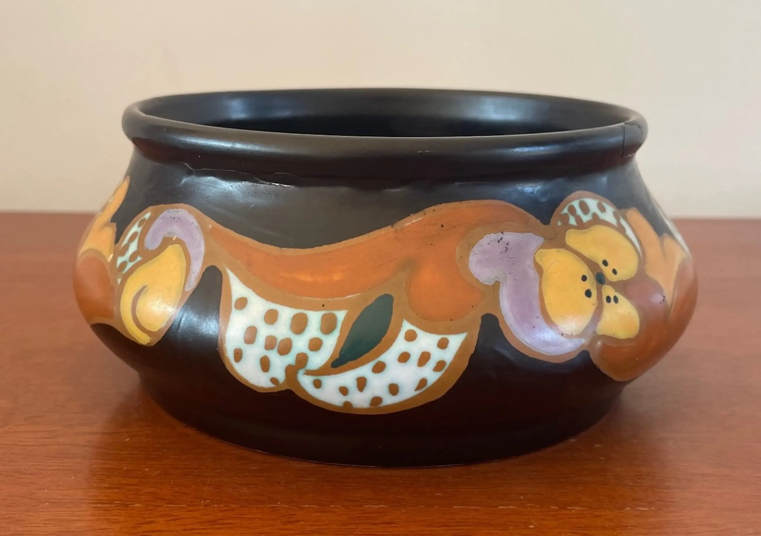 Mooie platelen Jardiniere model 52 ontwerp W.H. van Norden voor de ESKAF (Eerste Steenwijker Kunstaardewerk Fabriek). De Jardiniere is gemaakt rond 1930 en heeft een strak floraal decor.