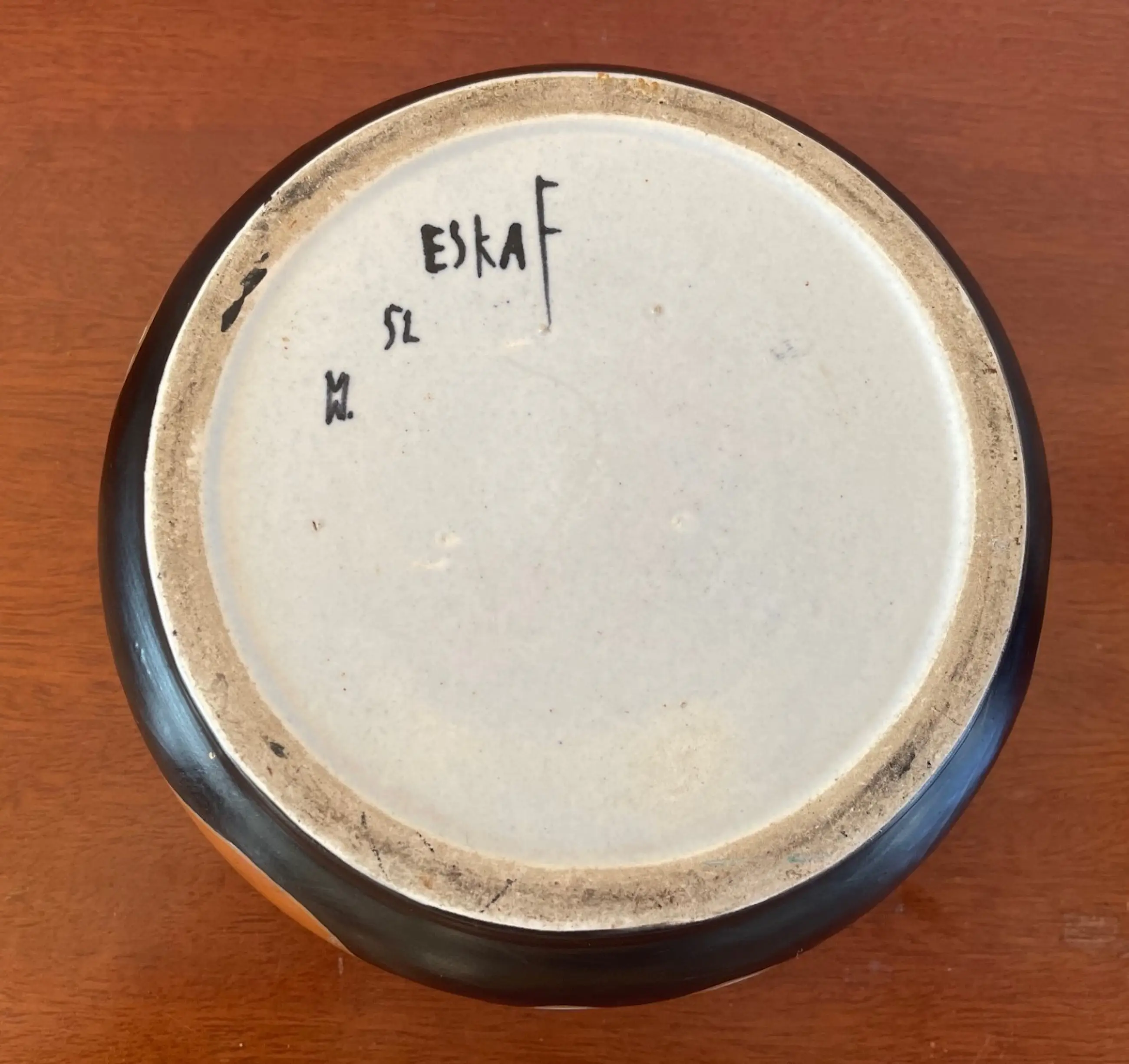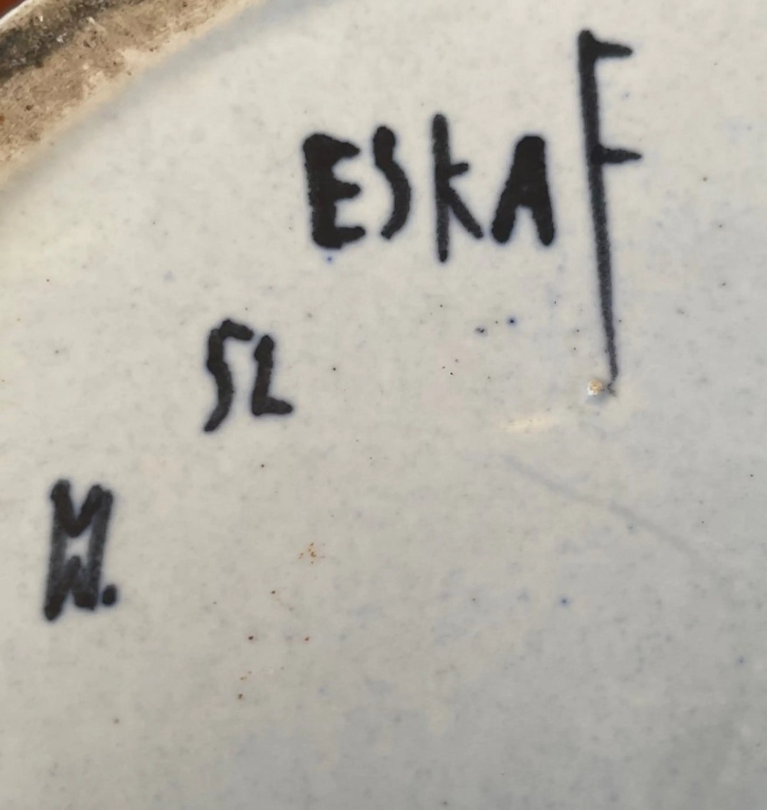 - Aan de onderkant is de Jardiniere als volgt gemerkt, handgeschreven in het zwart: ESKAF, nr 52 en een signatuur of monogram van een onbekende decorateur.