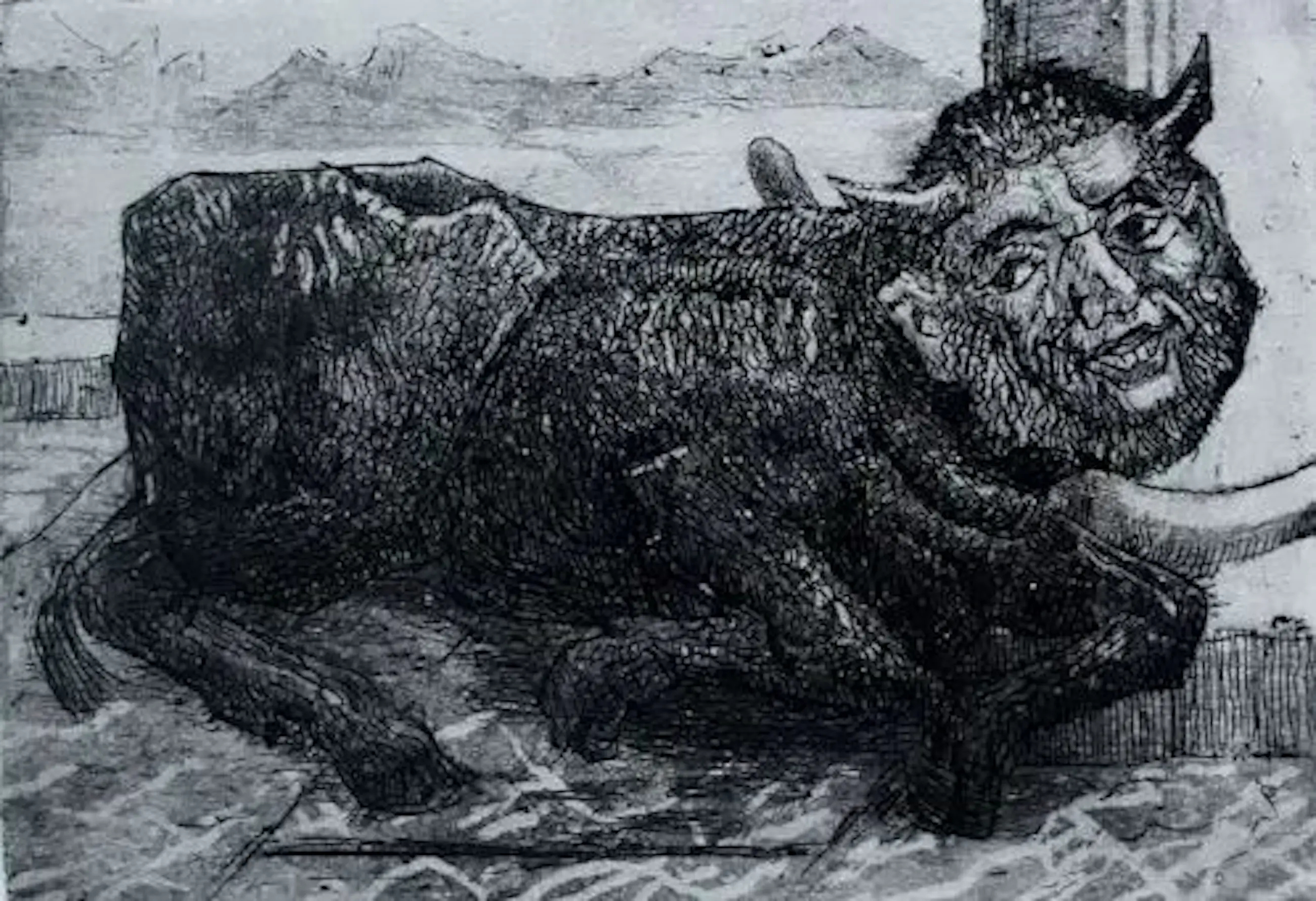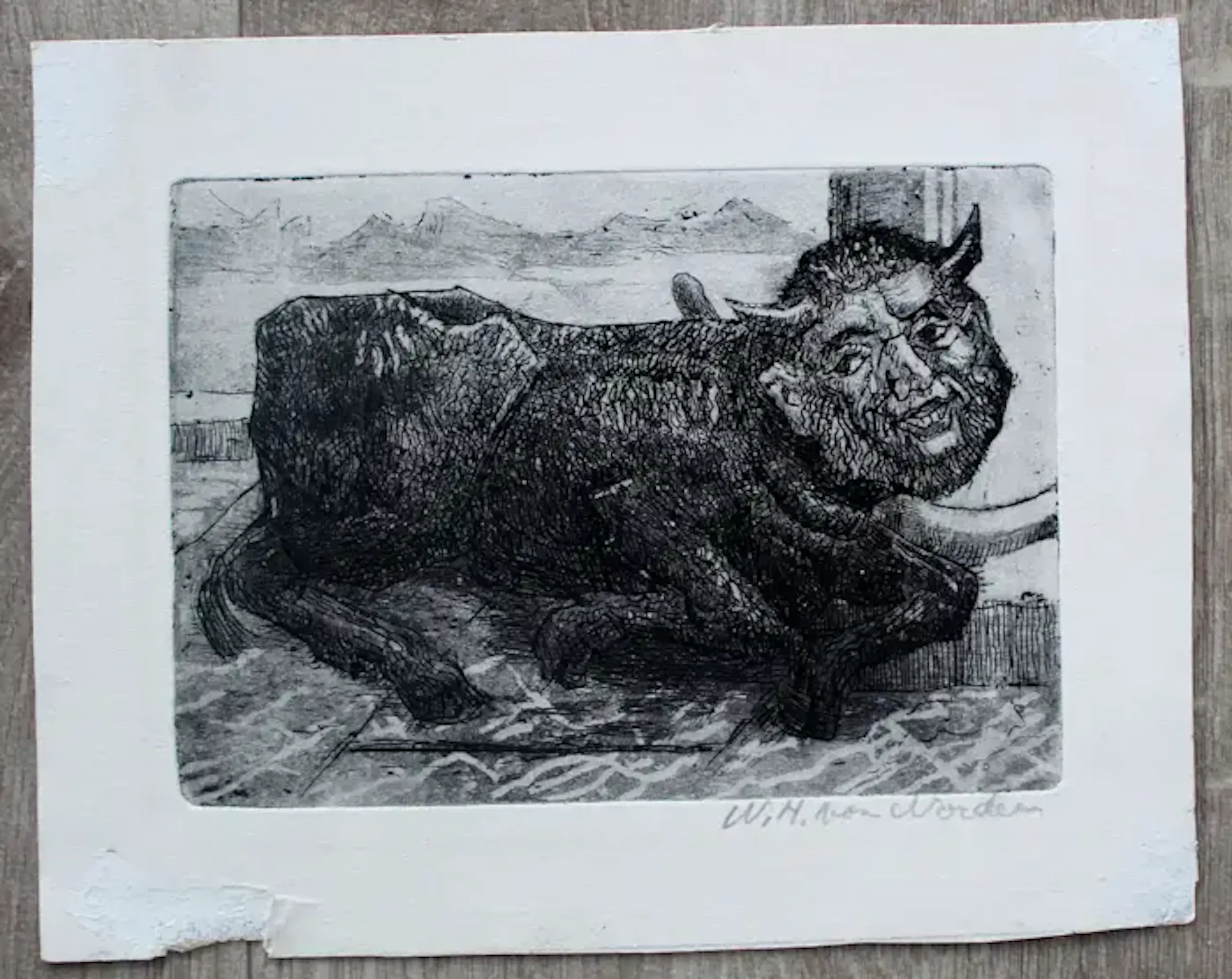 Ets van Willem Hendrik van Norden. Titel: de dood van de minotaurus. Afmetingen blad: H18 x b23cm. Afmetingen voorstelling H12,5 x b17,3cm. Het werk is rechtsonder gesigneerd door de kunstenaar. De authenticiteit van het aangeboden werk kan volledig worden gegarandeerd. Een certificaat van echtheid kan, op aanvraag, worden gemaild.