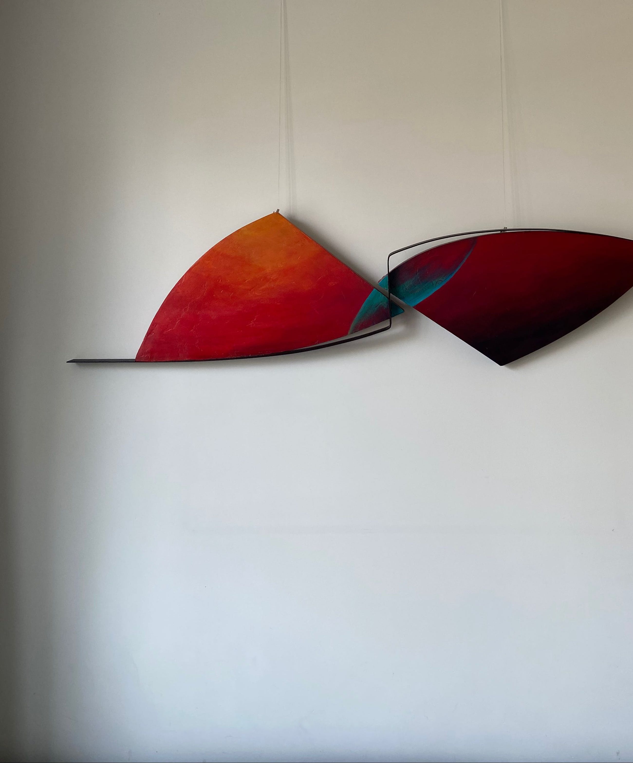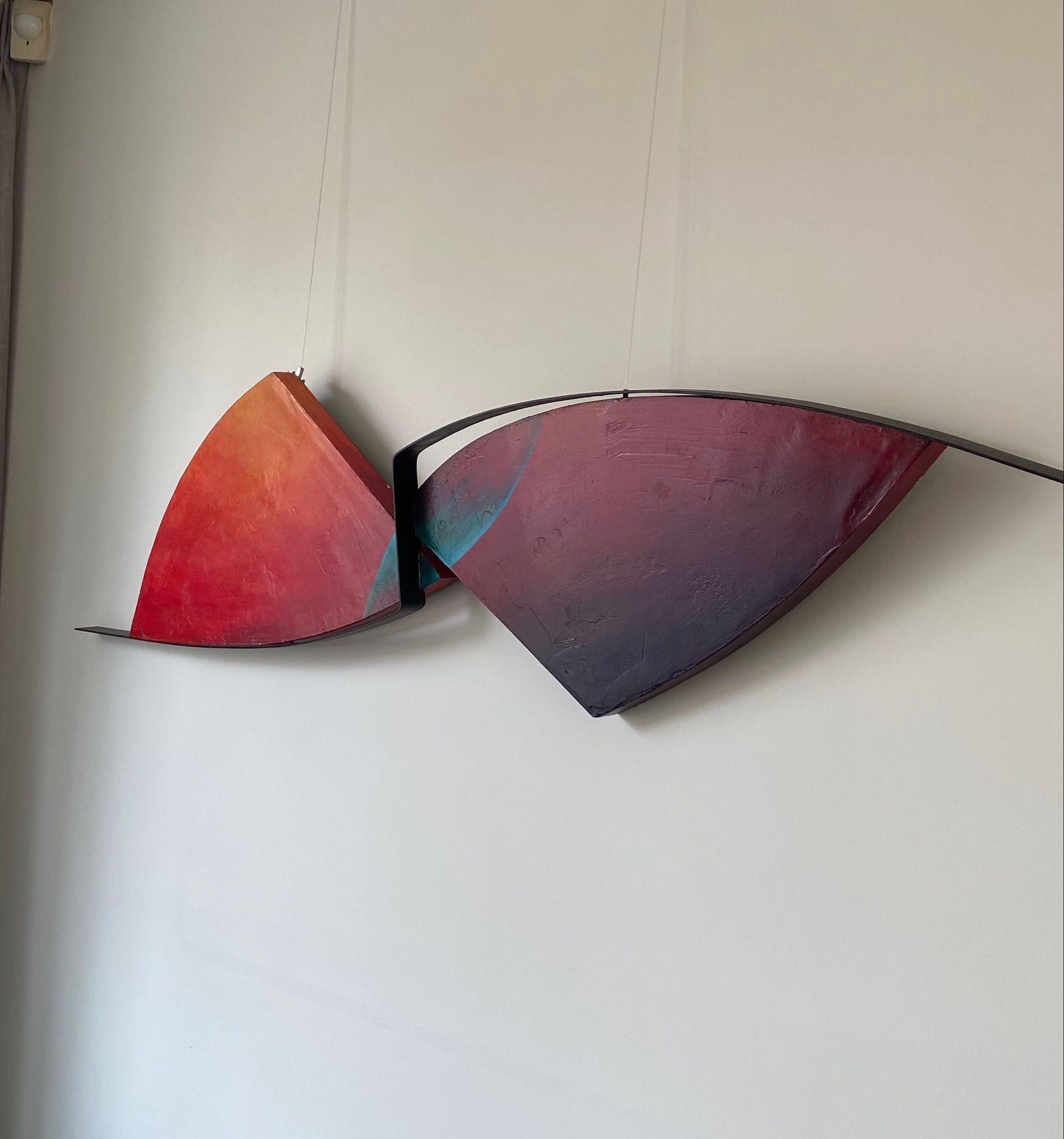 Dit kleurige 2 vlaks schilderwerk vervat in een dynamisch vormgegeven stalen frame is van de hand van de bekende Goudse kunstenaar Willem Hesseling. De breedte maat van 180 cm betreft de stalen uiteinden.