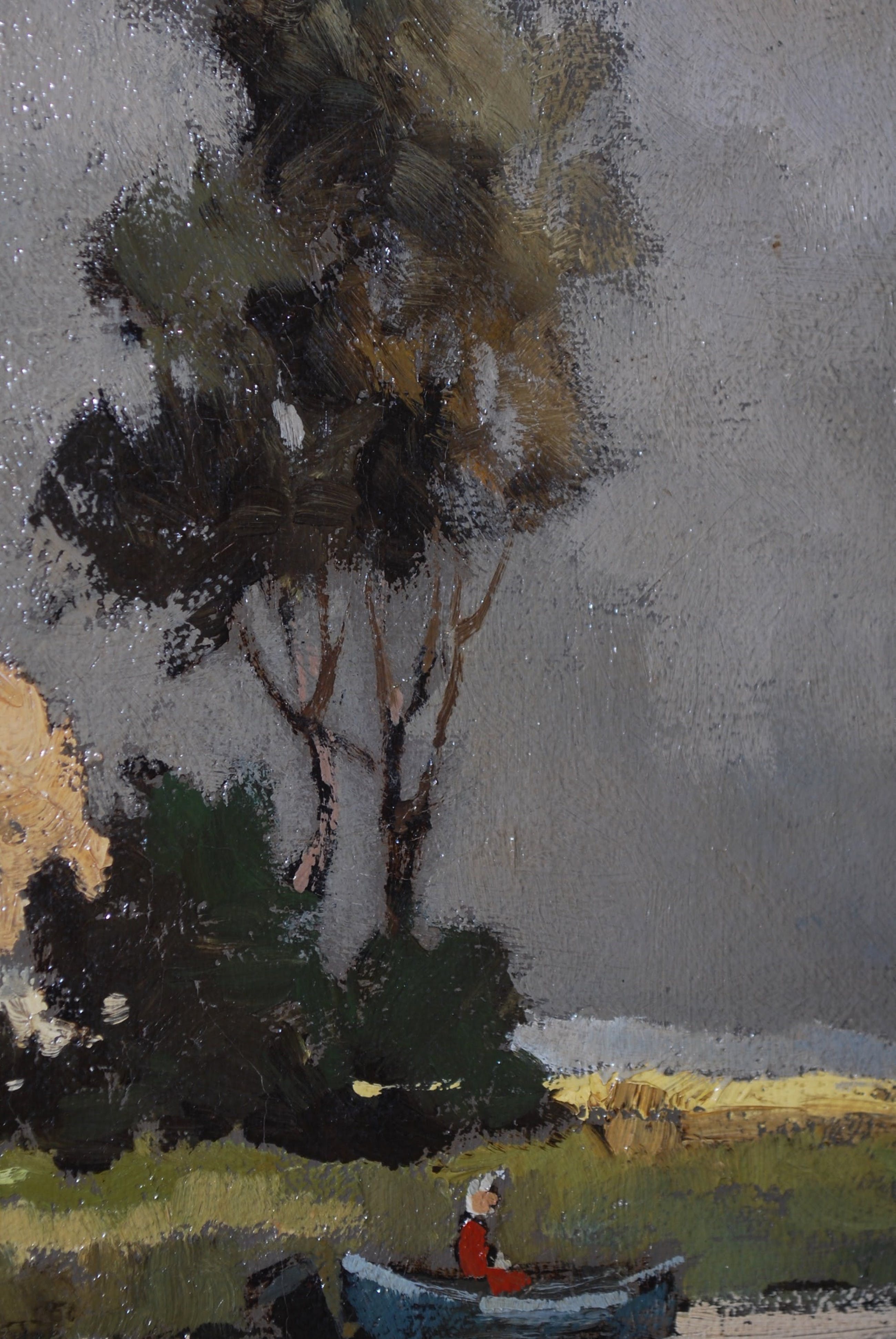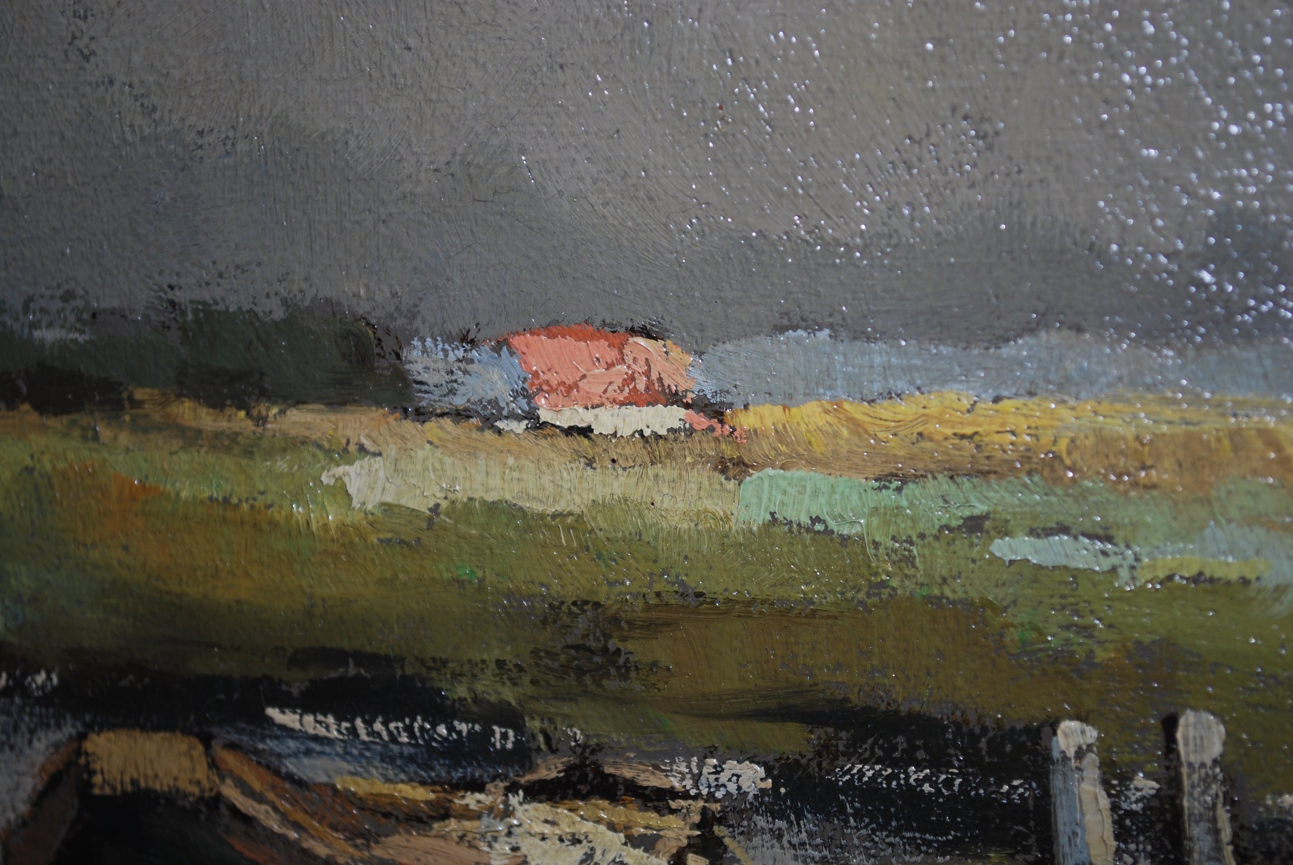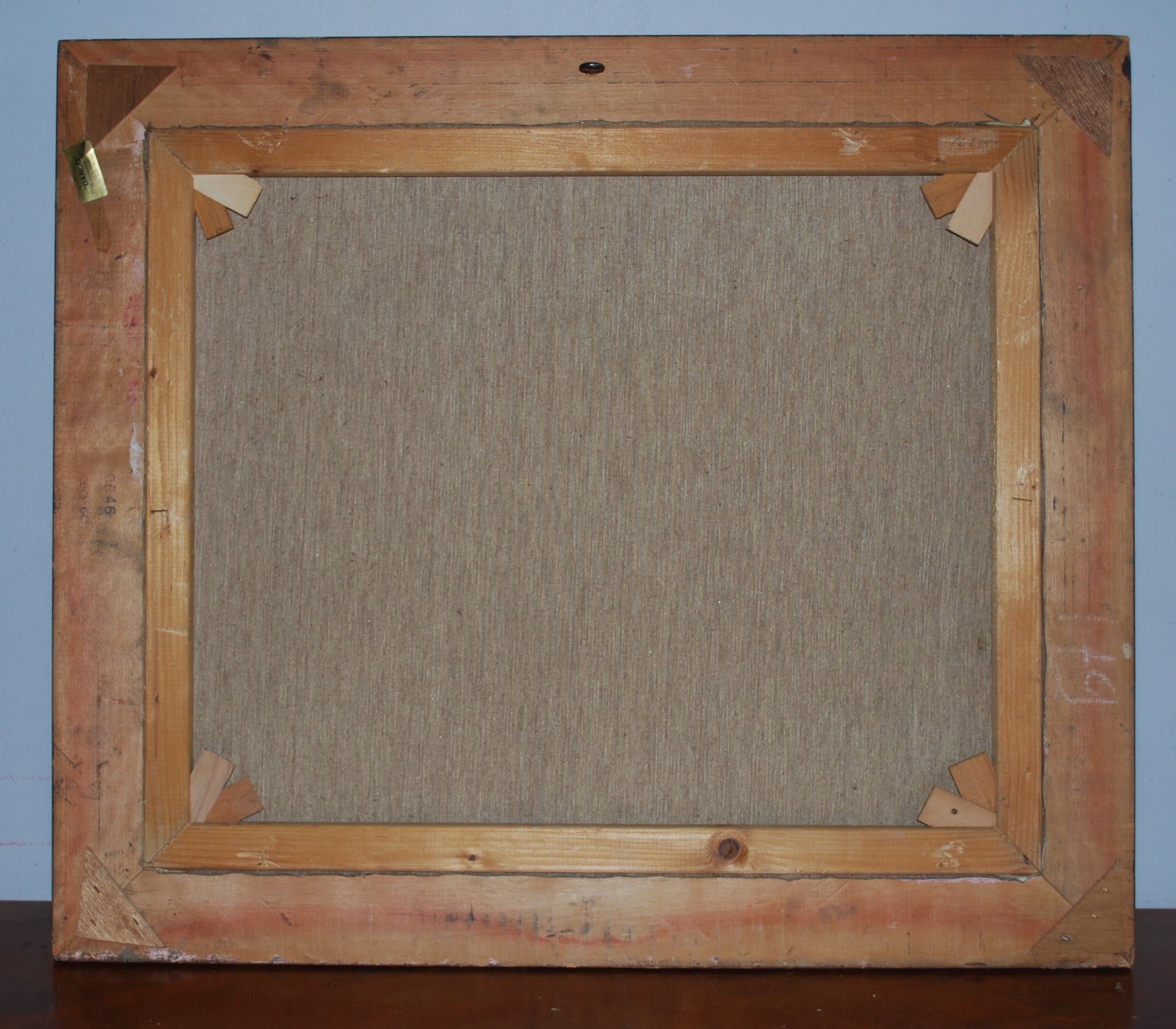 In goede gebruikte staat; cracquelé; 2 minieme plekjes links en aan de onderrand. De lijst heeft wat hoekschade linksboven.