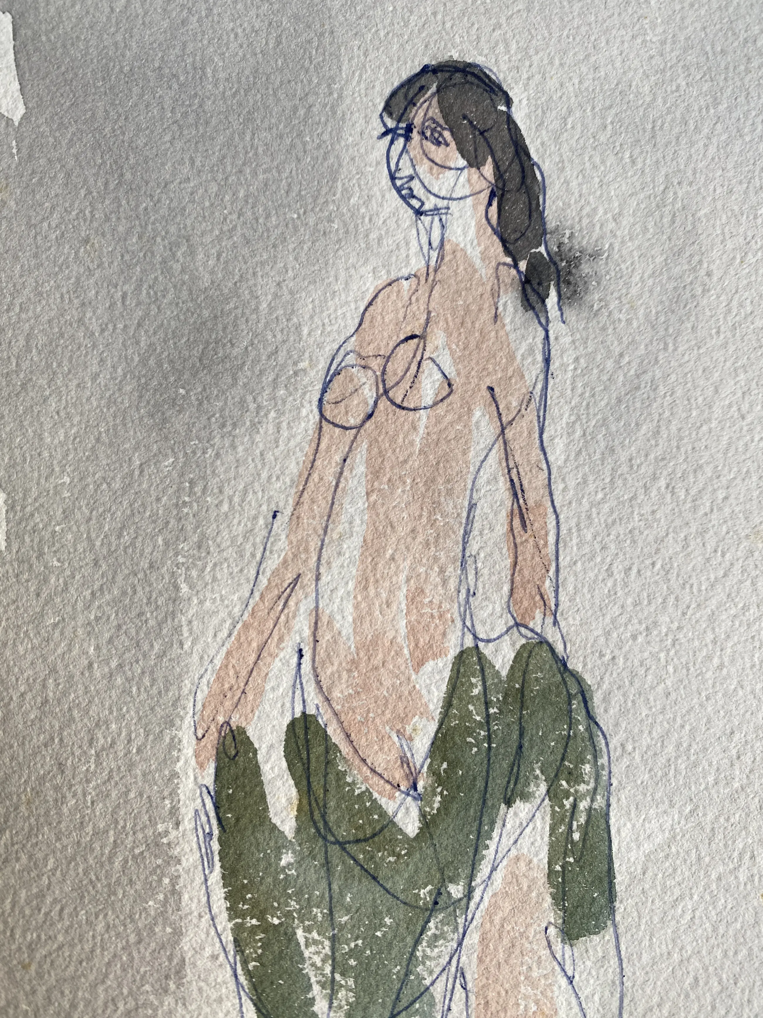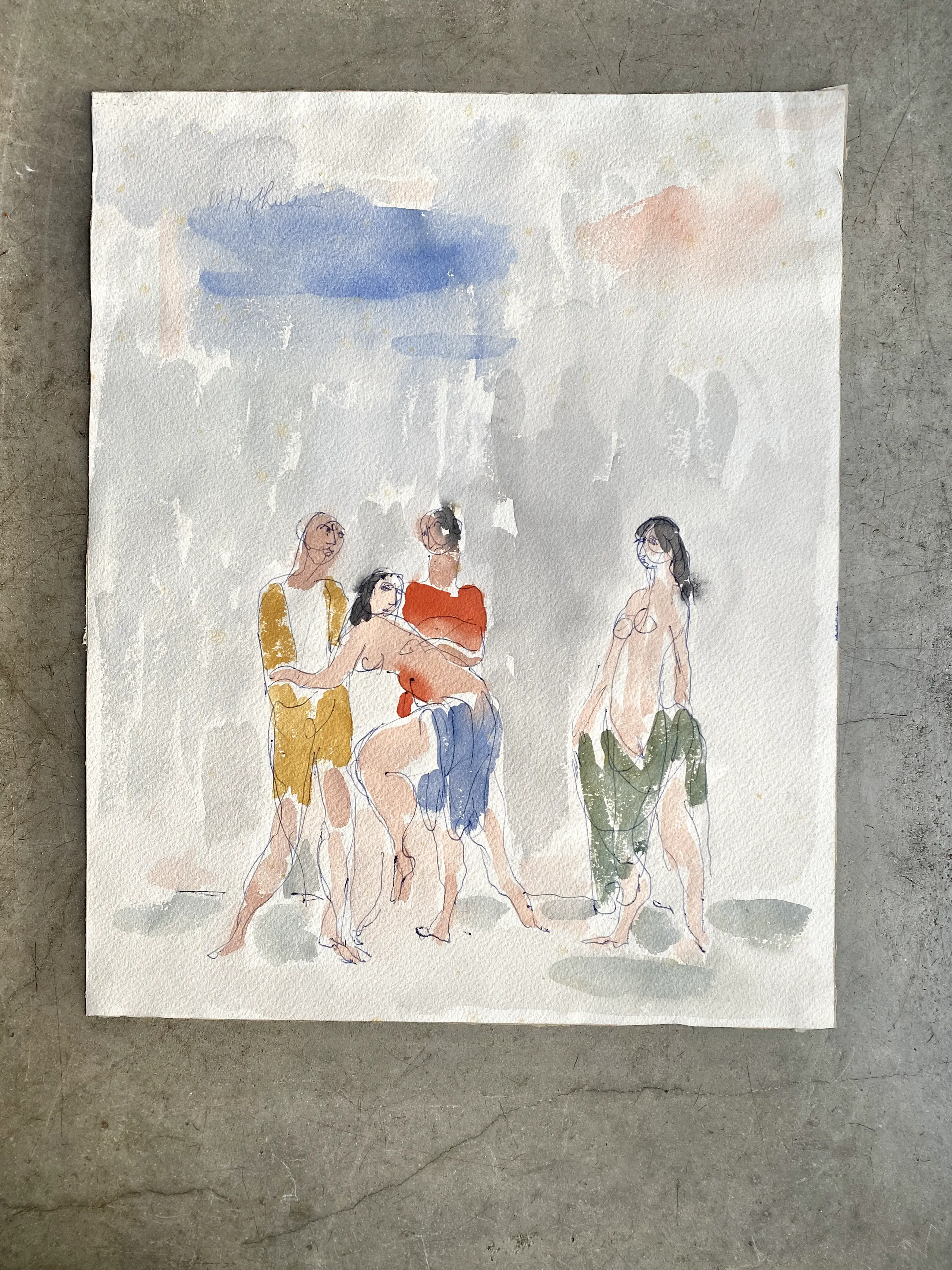 Aangeboden: bijzonder mooie voorstelling van Willem Hofhuizen met figuren in een landschap. Tekening in inkt met aquarel. Prachtige origineel werk in zijn kenmerkende stijl.