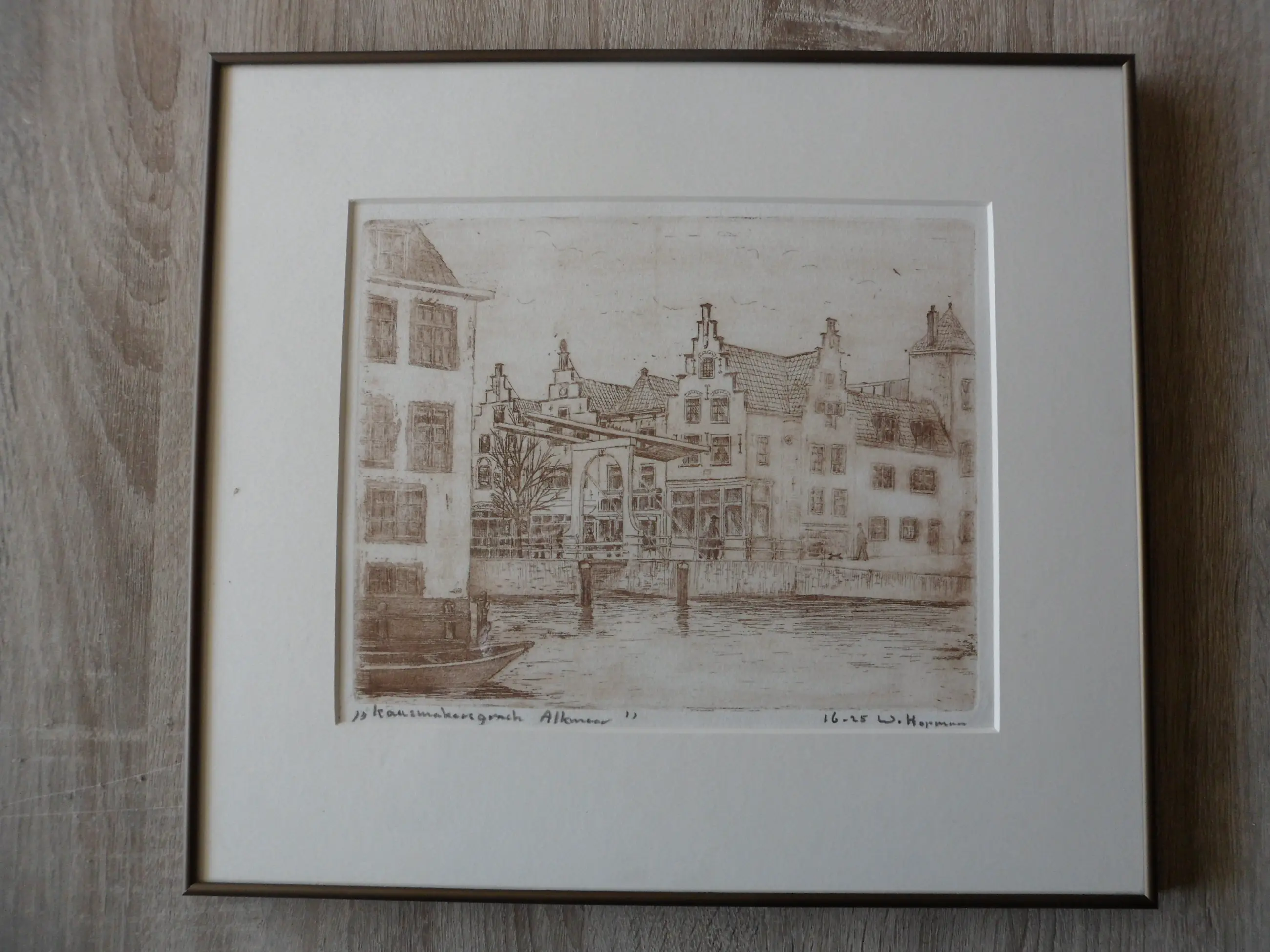 Fraaie ets door Willem Hopman, voorstellende De kaasmakers gracht te Alkmaar.