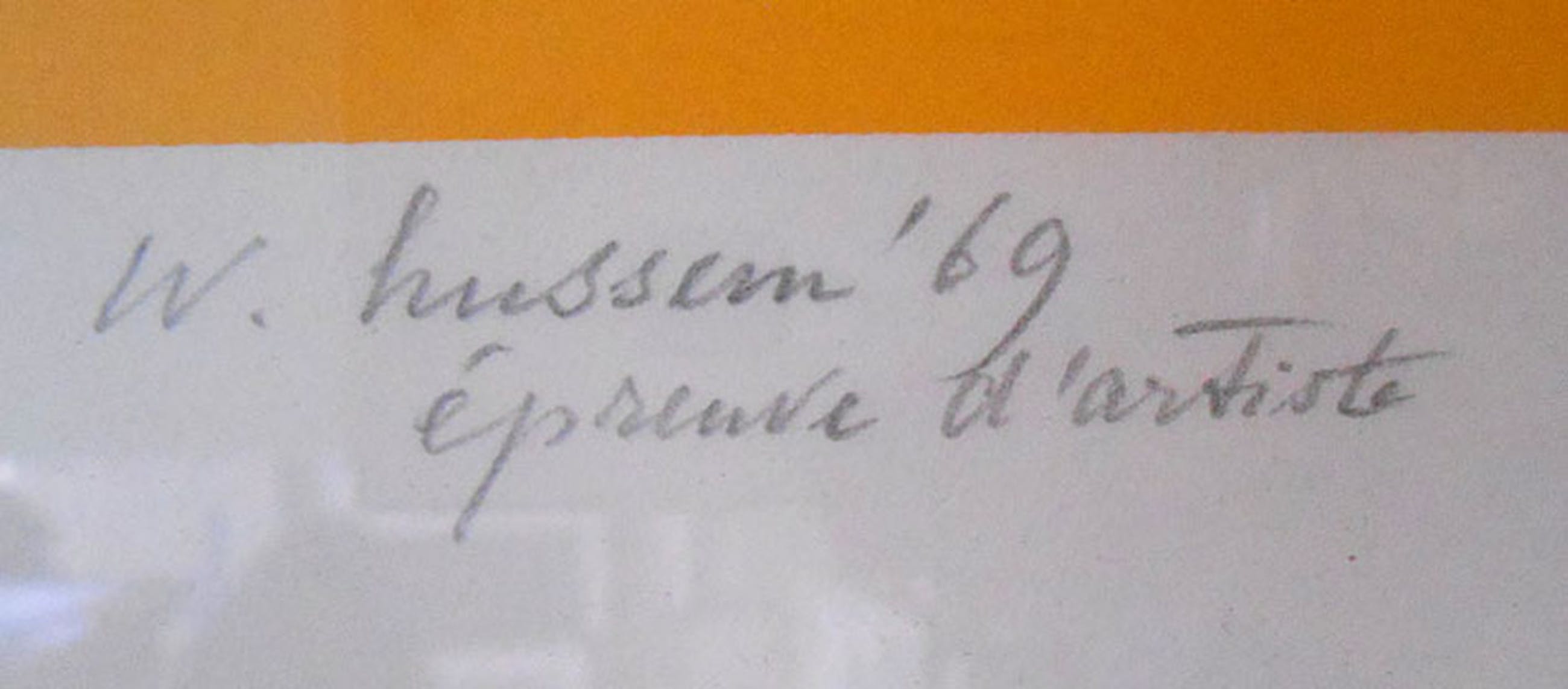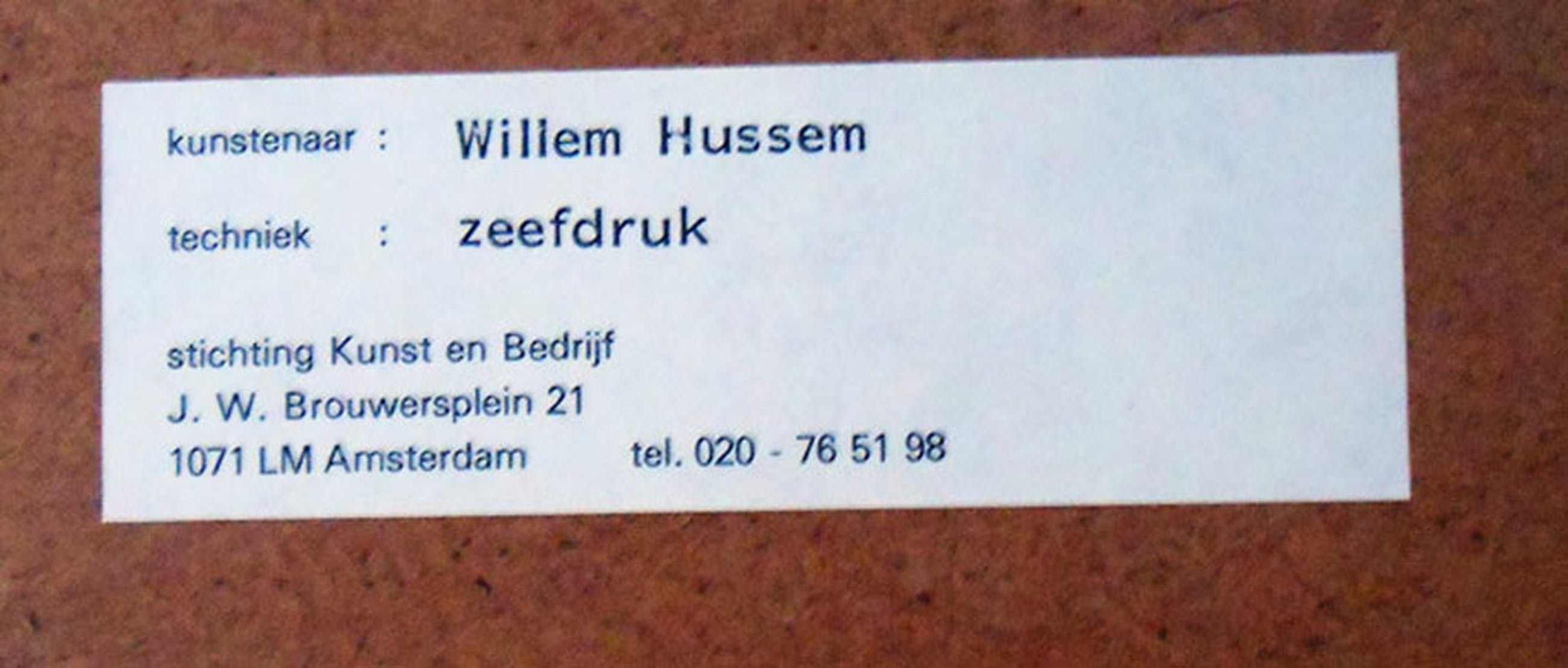Zeefdruk van Willem Hussem, ingelijst achter glas in aluminium lijst, afmeting lijst: 70 x 100 cm.