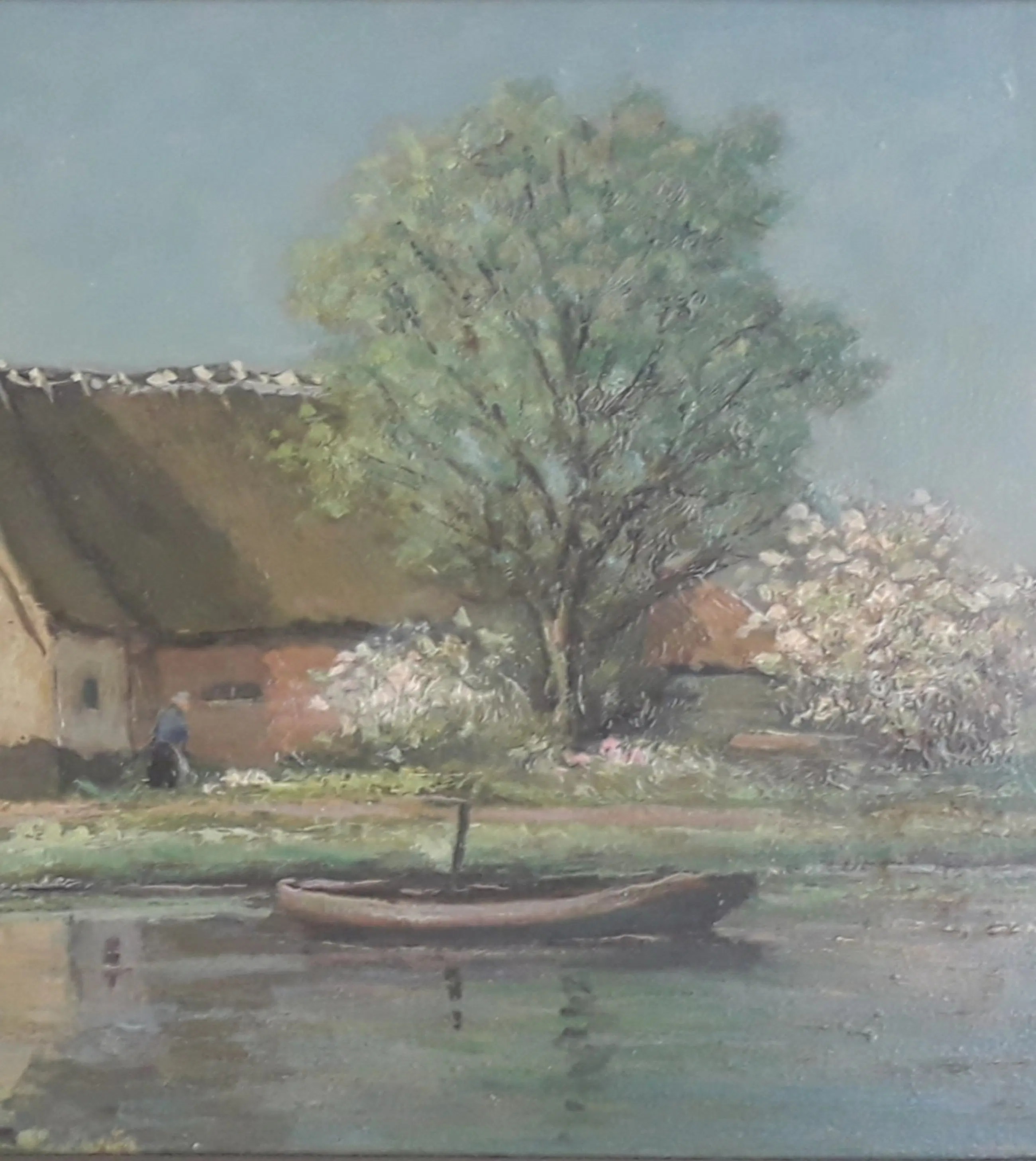 Er lopen enkele kippen over het erf en 2 roeibootjes liggen rustig op het water. Een boerinnetje is in de tuin aan het werk. De prachtige BLOESEMBOMEN zijn in volle bloei.
