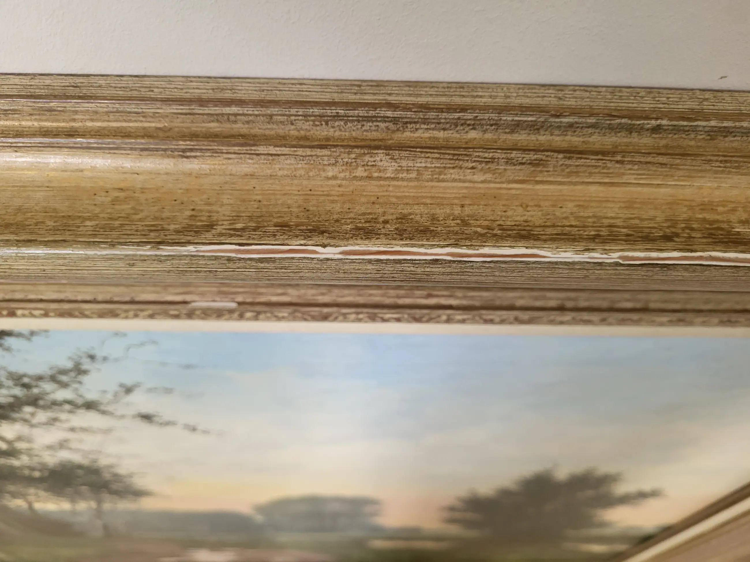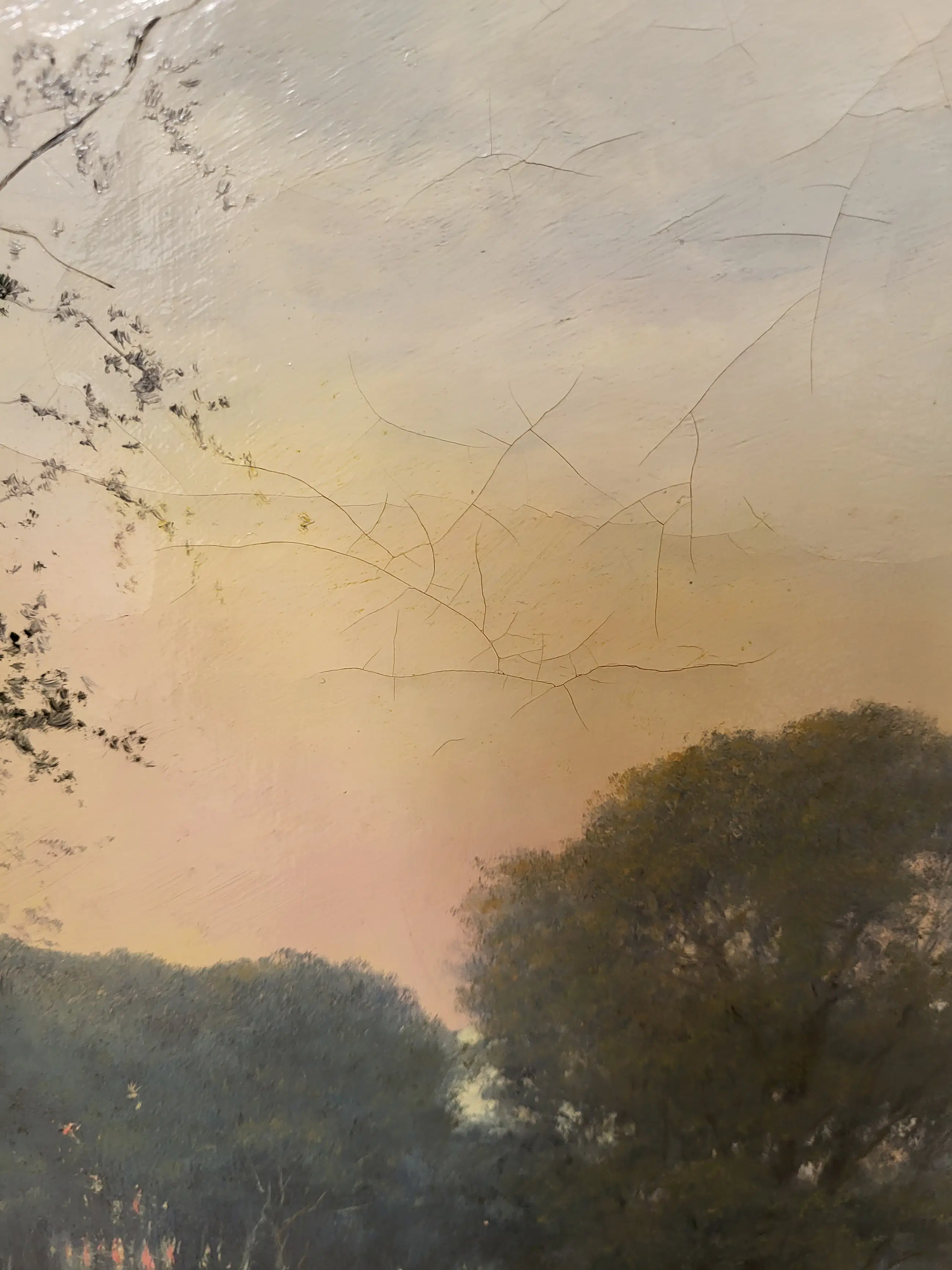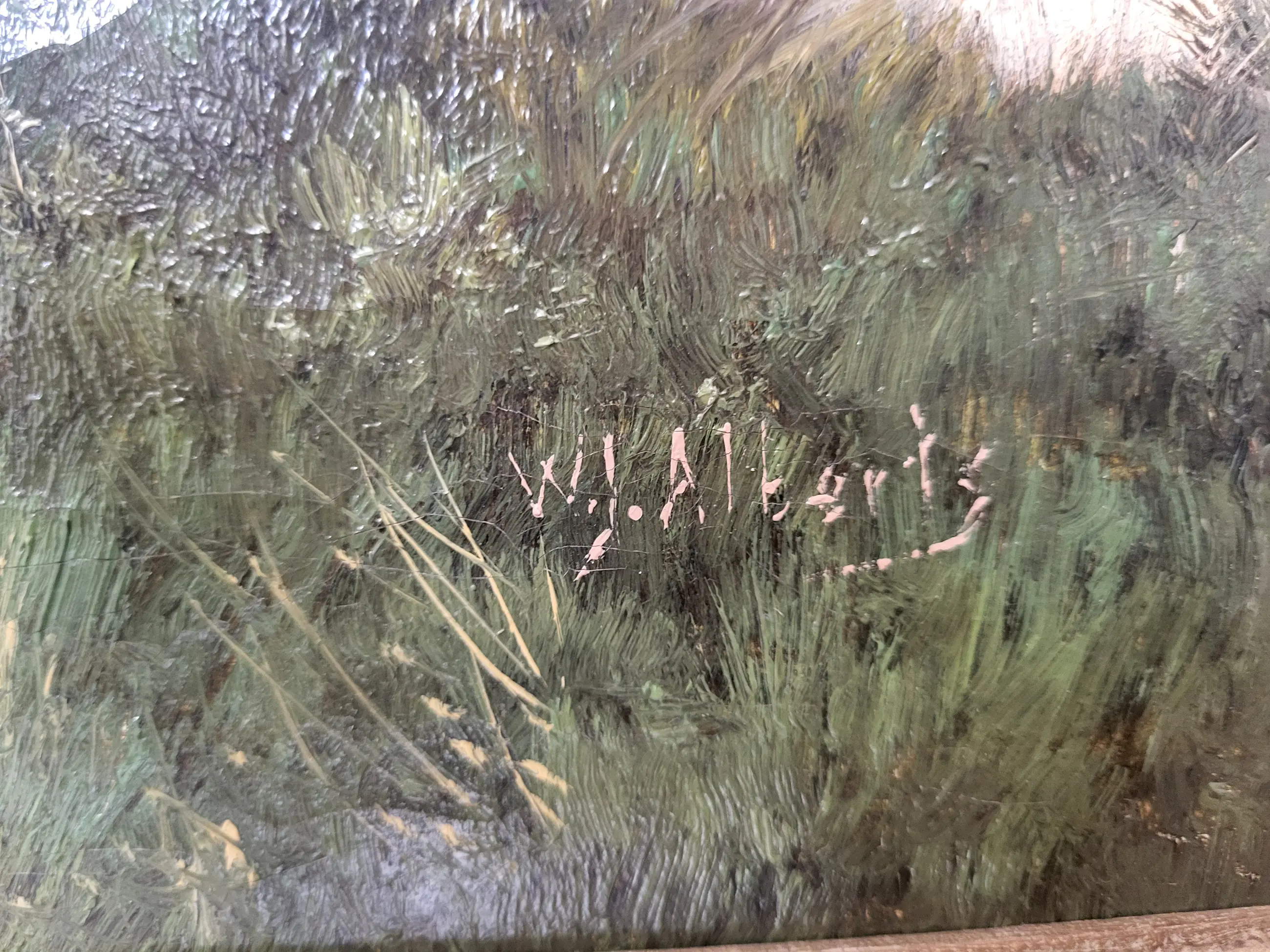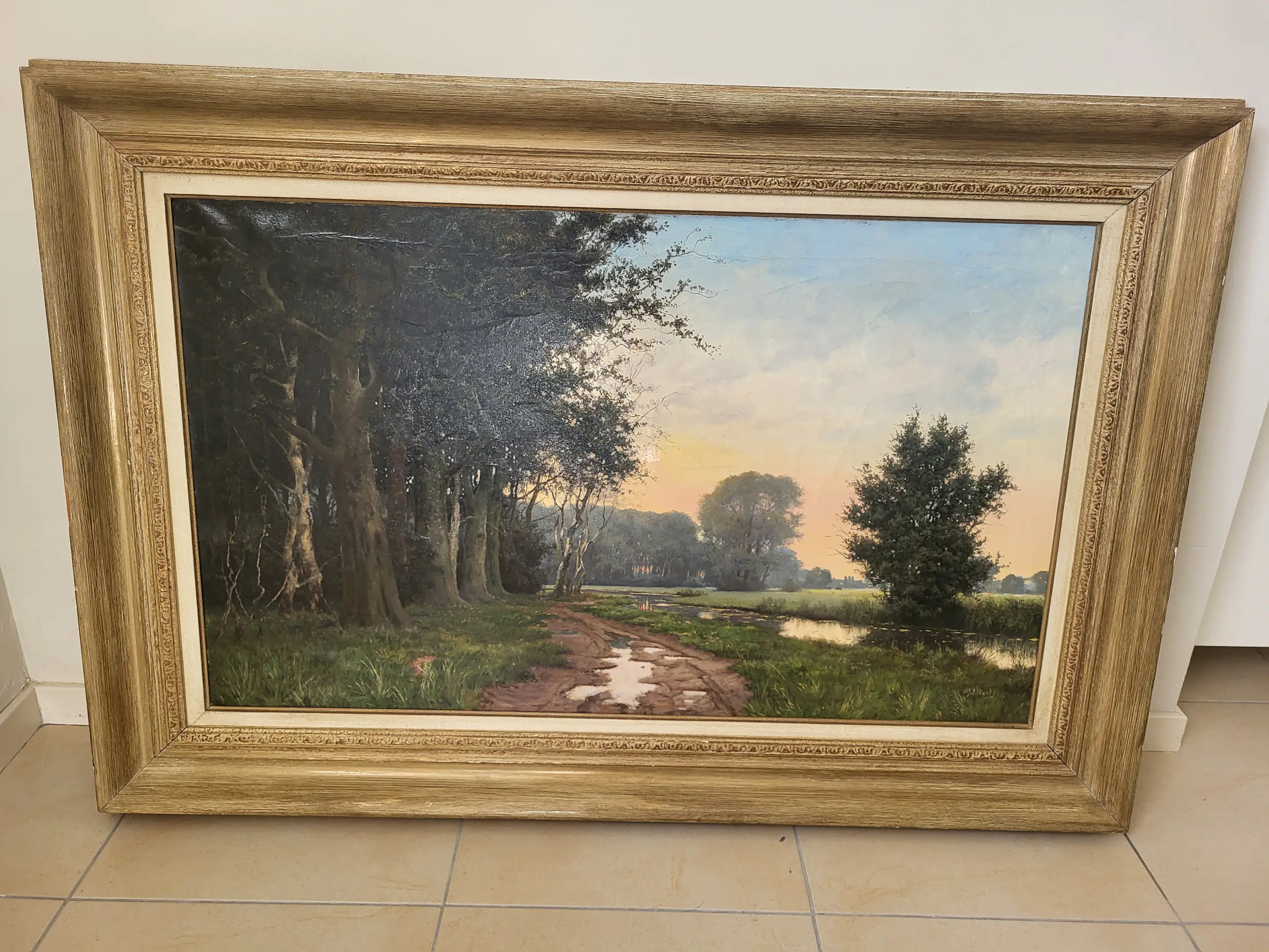 Mooi schilderij van een zicht in het bos langs de beek Veel verschillende kleuren groen, mooie blauwe lucht met een roos/roze gloed van de ondergaande zon. Een oase van rust en Hollandse natuur. Het schilderij heeft een passende lijst met wat licht schade.