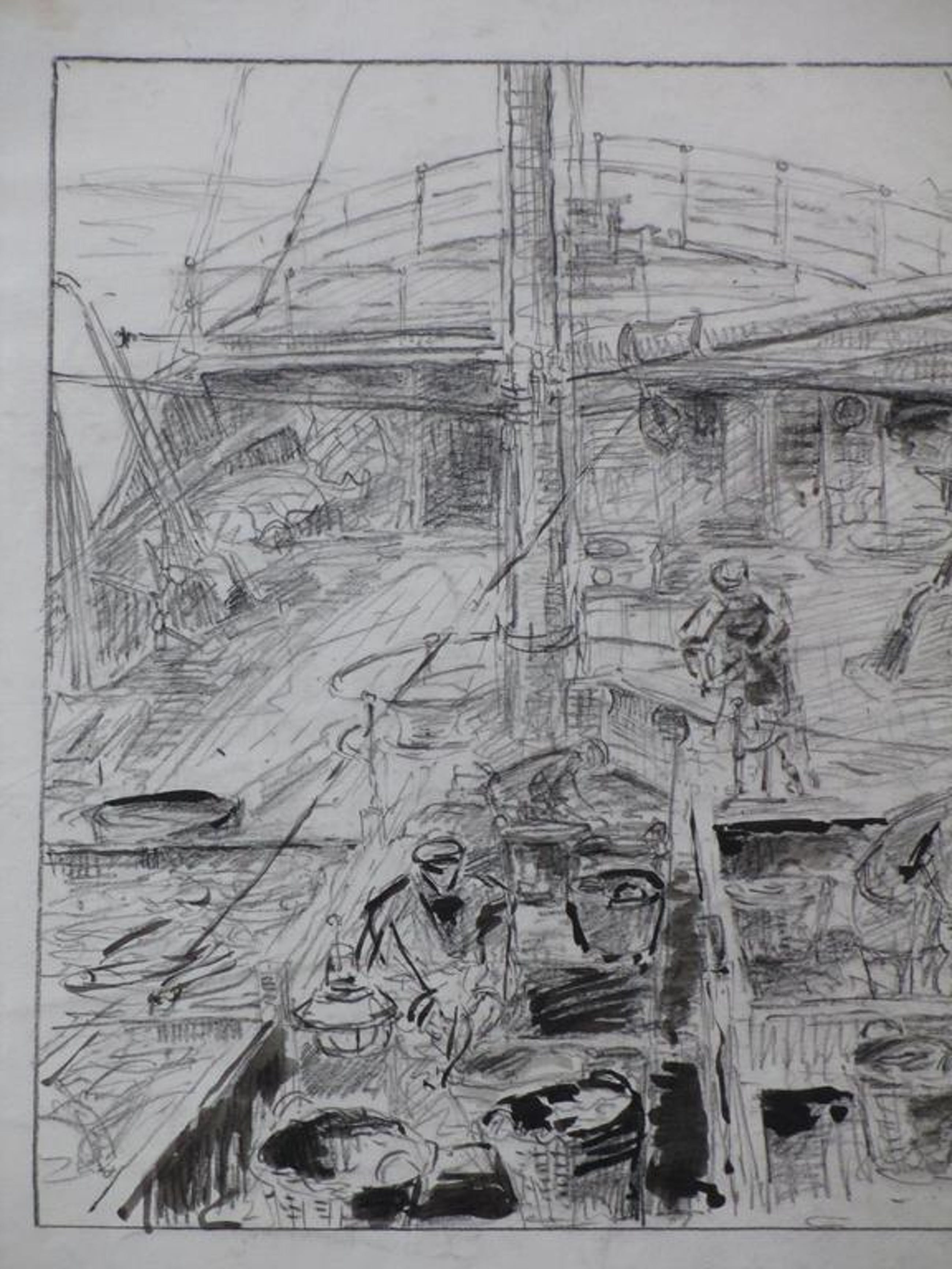 Voorstelling van vissersschip 'de Haarlem' tijdens de vangst op volle zee.