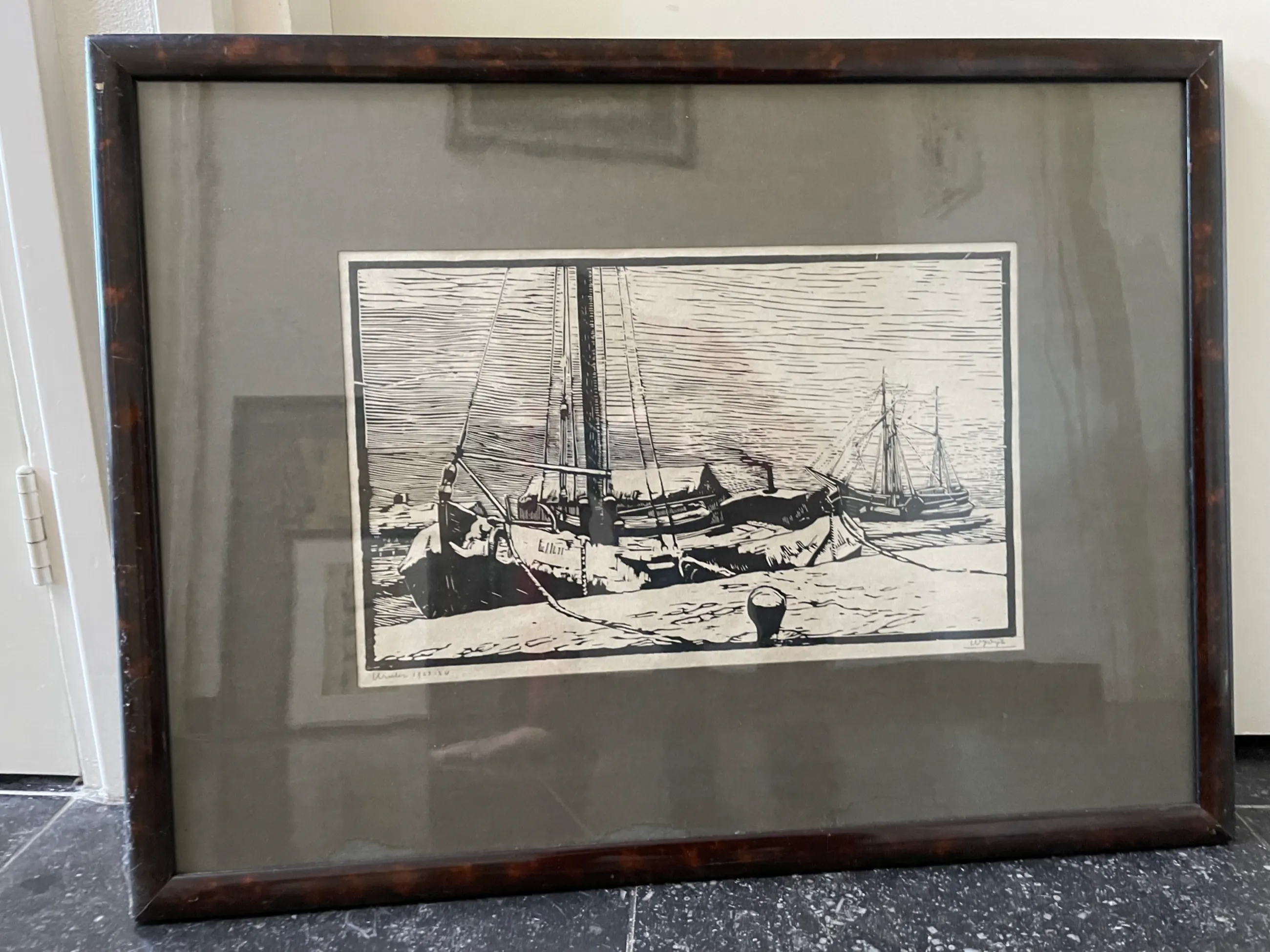 ‘Winter 1923 - ‘24’, W.J. Dijk Tjalk in de sneeuw voor de wal Houtsnede in grijze passe-partout in lijst Afmetingen lijst 51 x 67, afmetingen afbeelding 25 x 40