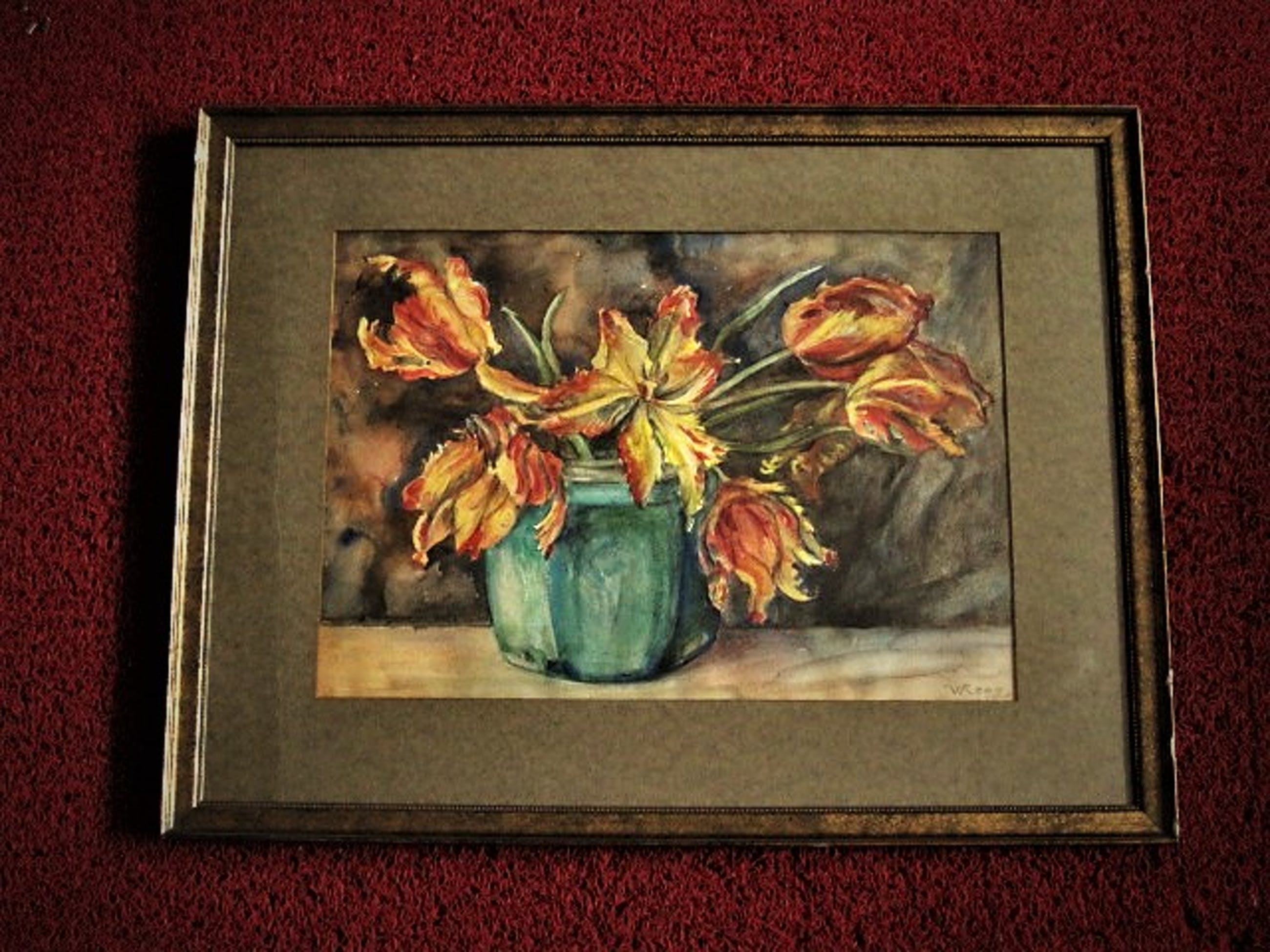 Een ingelijste oude aquarel van de Haarlemse kunstenaar Willem Karel Rees (1880-1962).