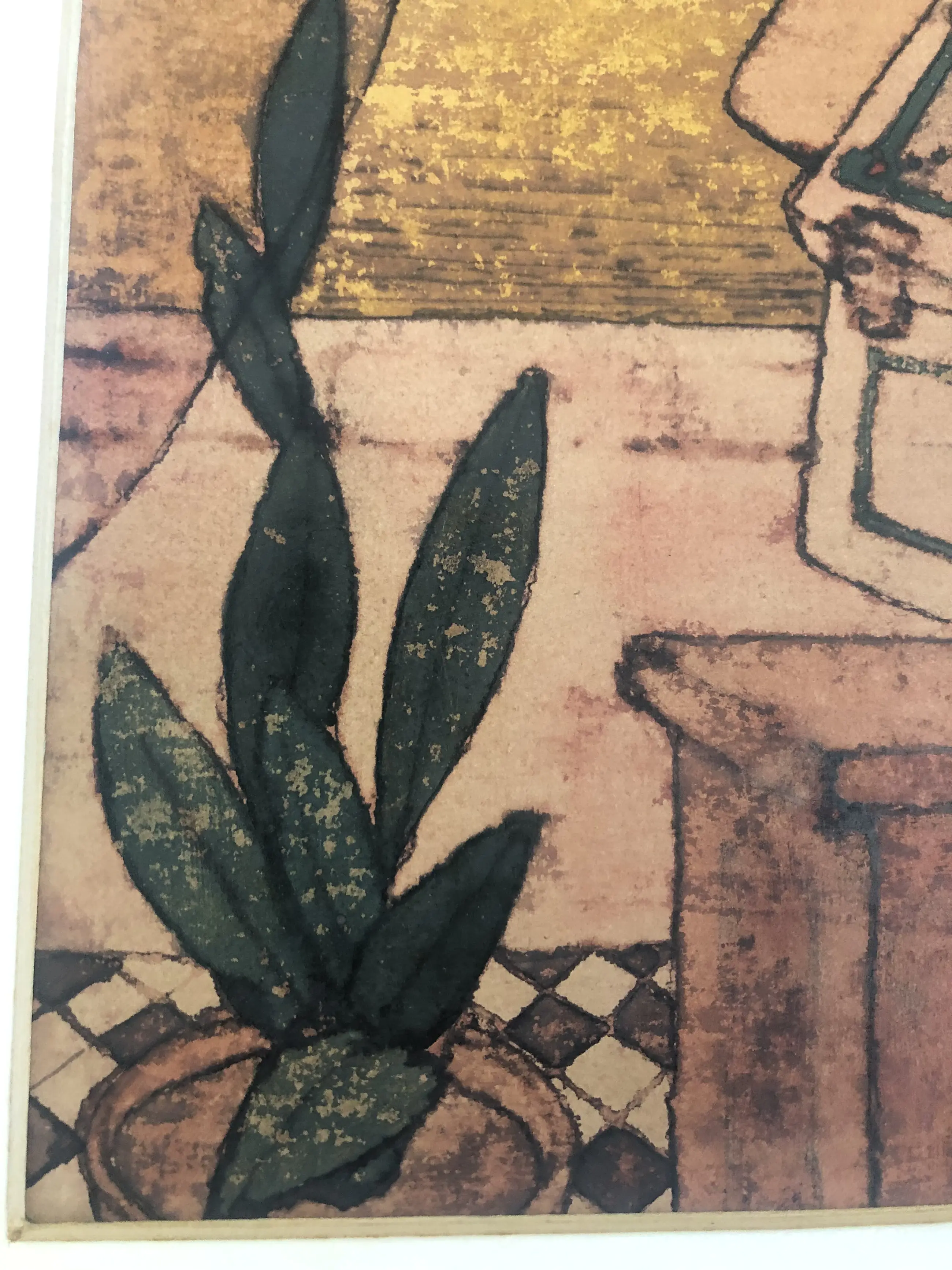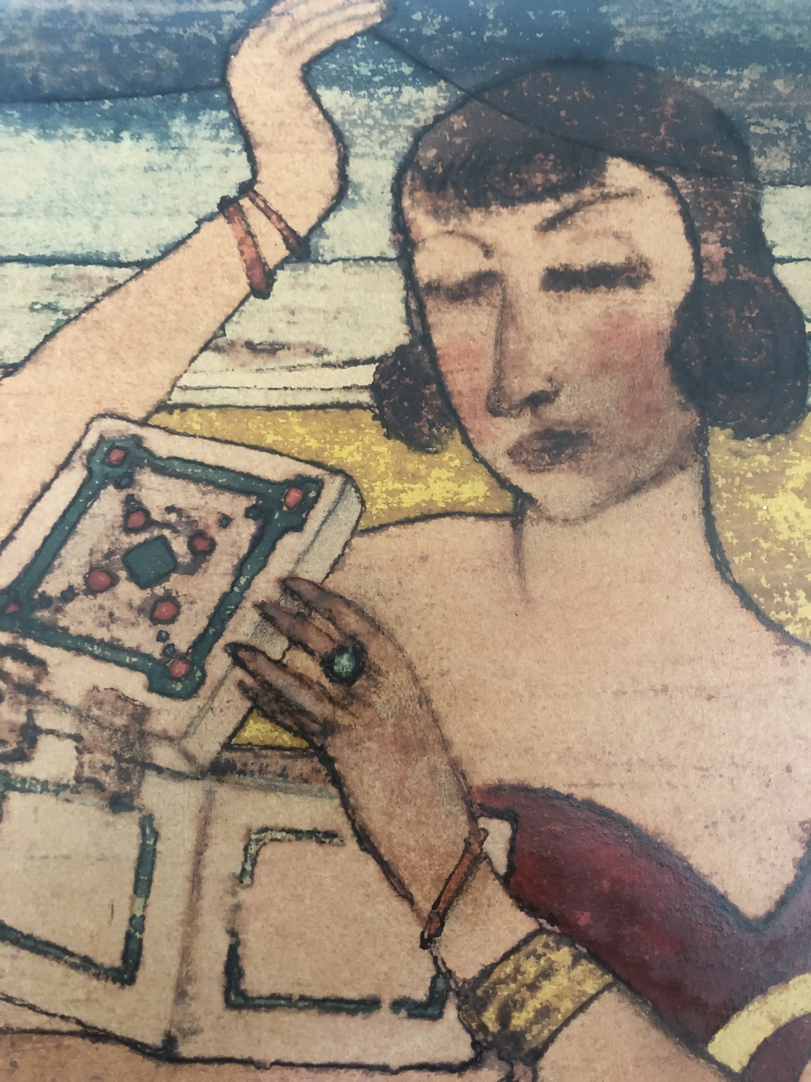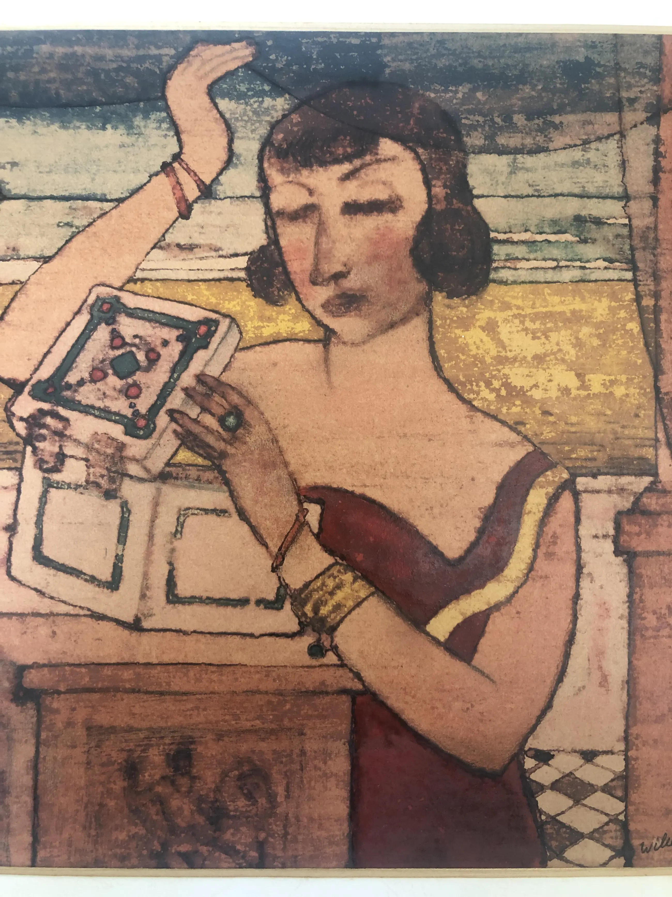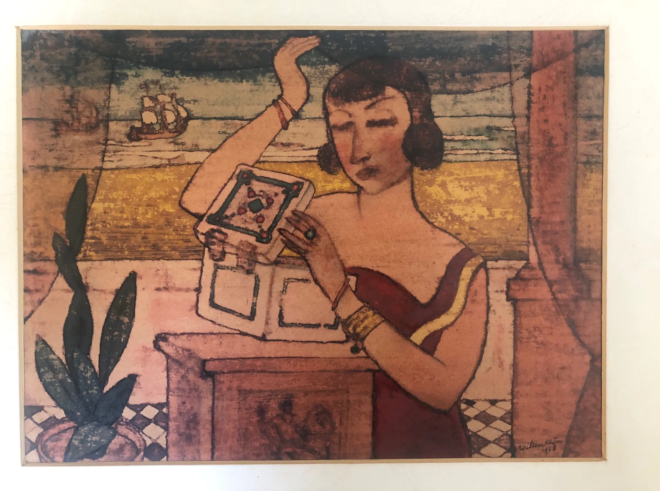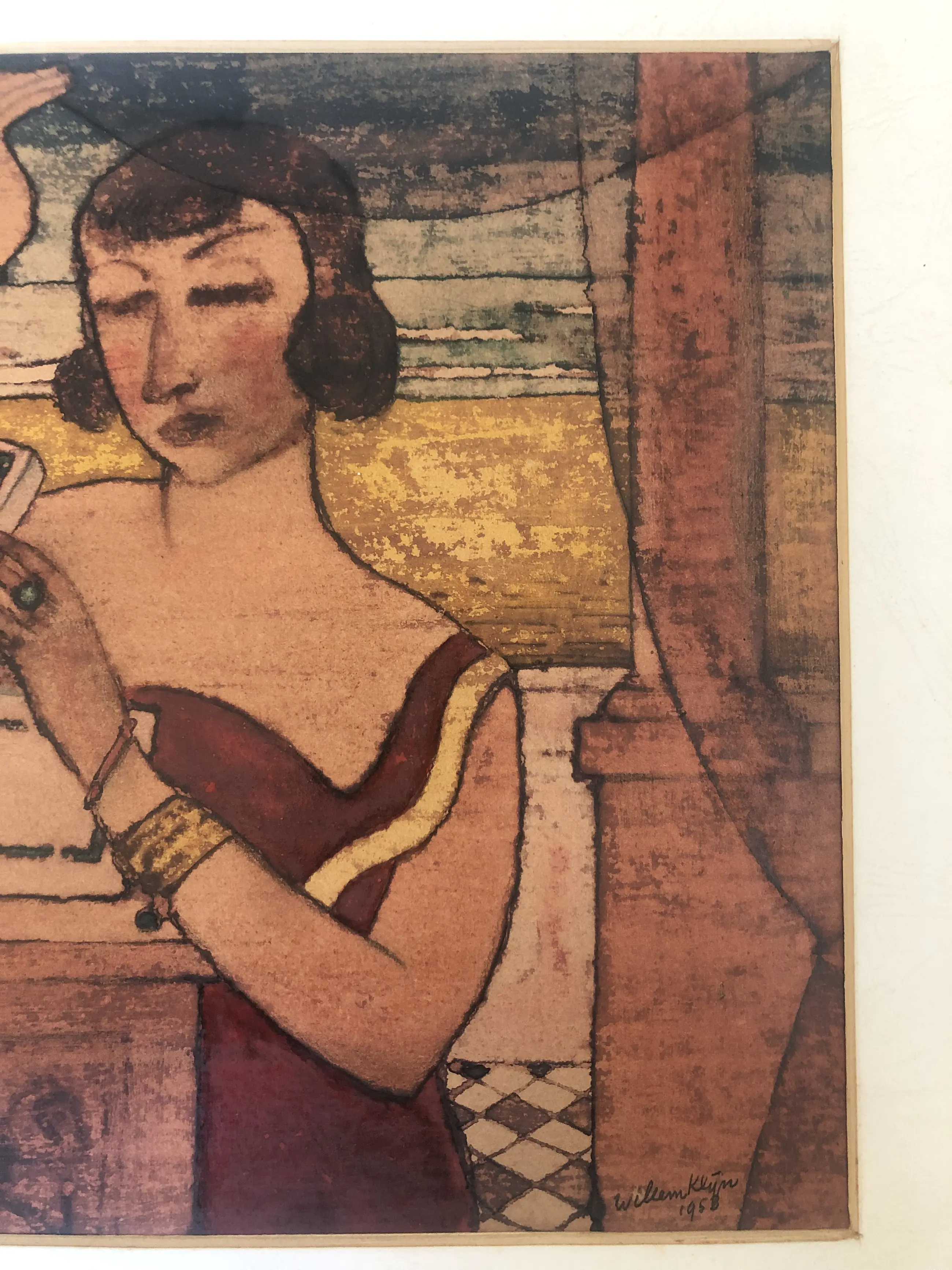 Zeer fraai kunstzinnig werk van Willem Klijn. Kleurrijke voorstelling, mooi voormaat. Het lijkt mij verf op papier, voor de formaliteit houd ik het op gemengde techniek.