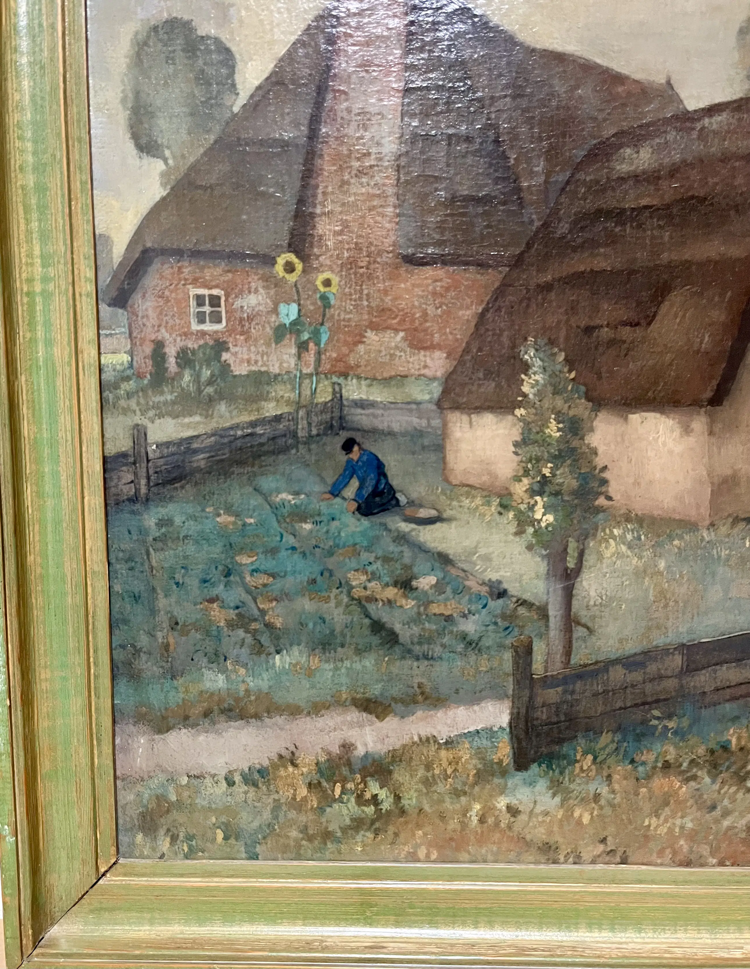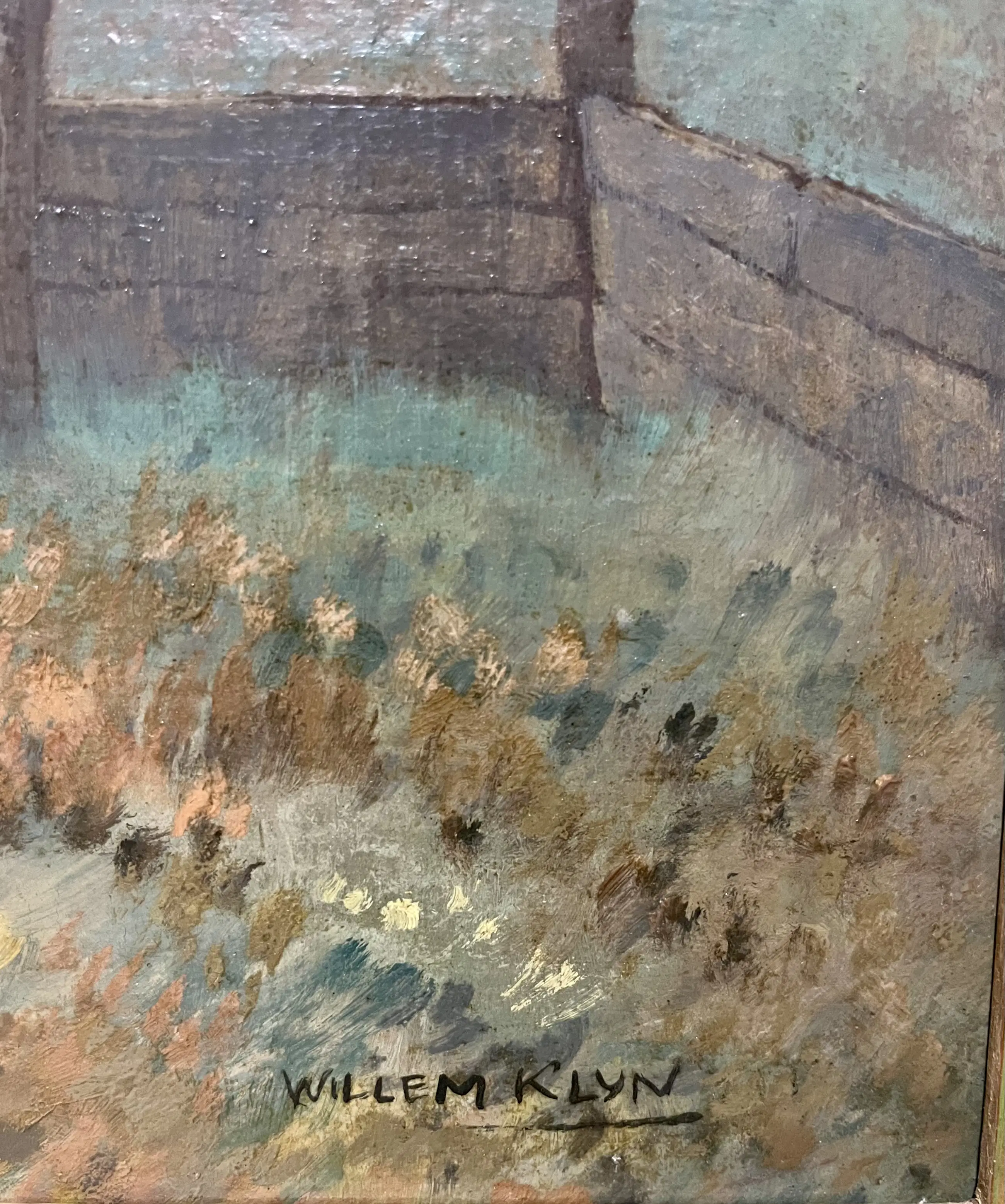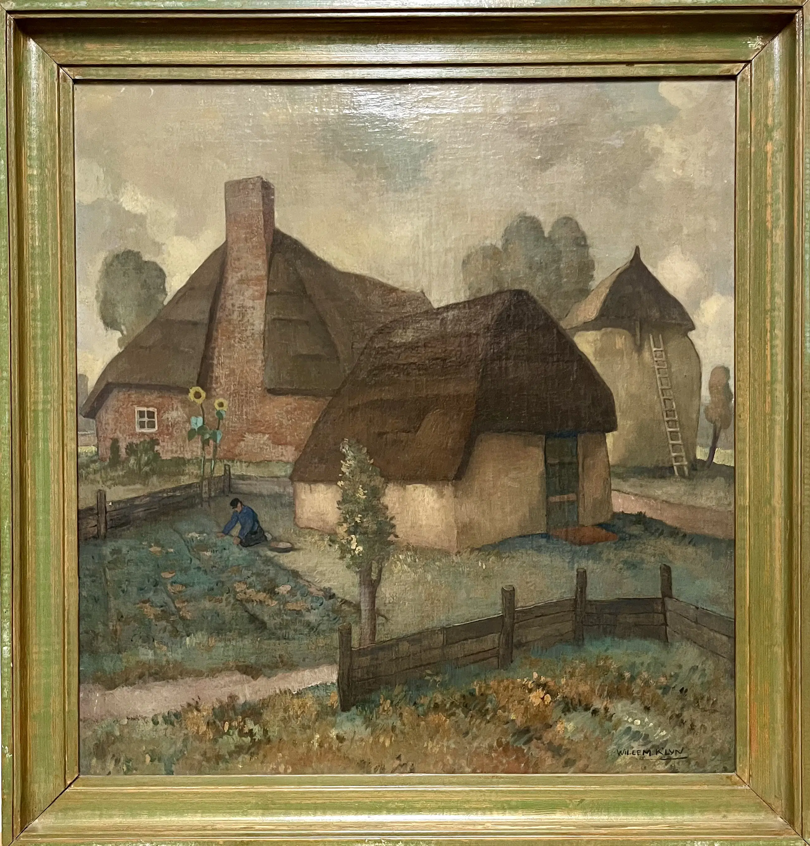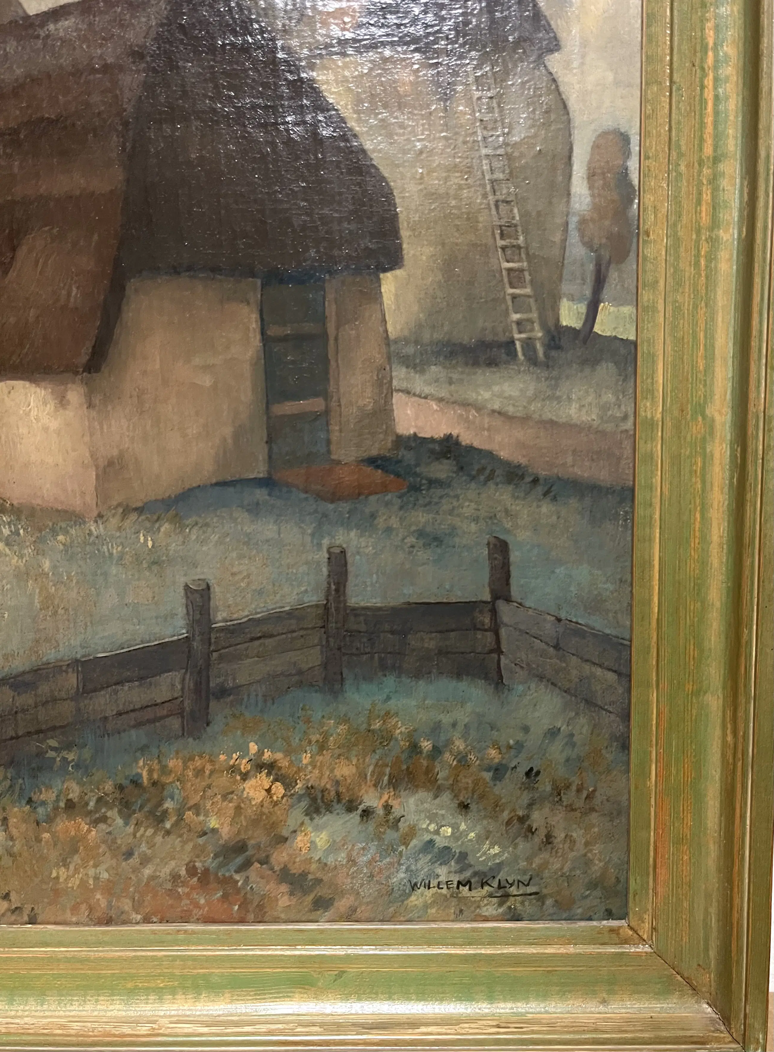 Prachtig groot olieverf op doek van Willem Klijn voorstellende een werkende boer rondom zijn boerderij. Het schilderij valt te dateren rond 1920-1930. Het werk is rechtsonder voluit gesigneerd.